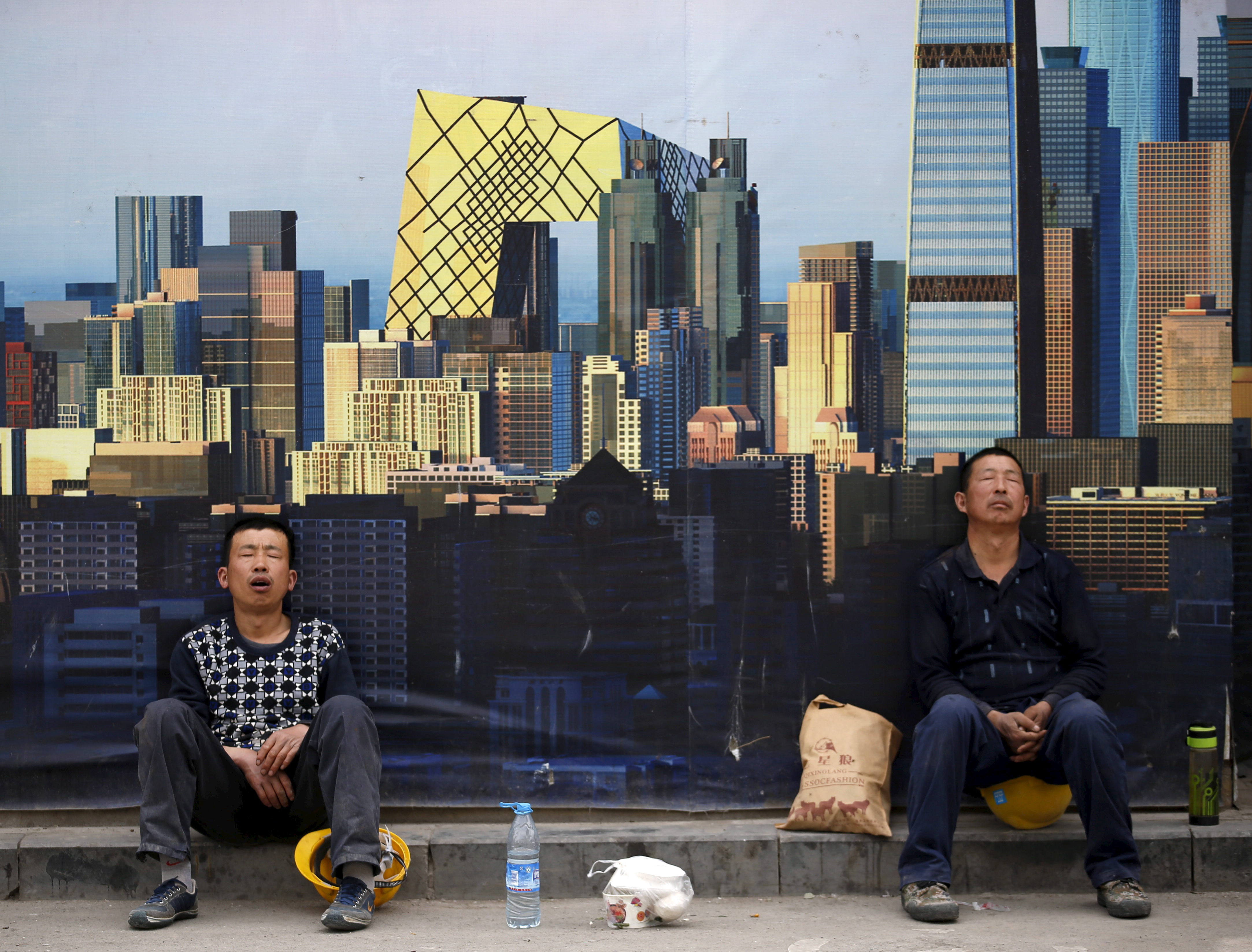 建筑工人在北京一处建筑工地午休时在墙前小睡,图片拍摄于2015年5月5日。路透社/金京勋/文件照片