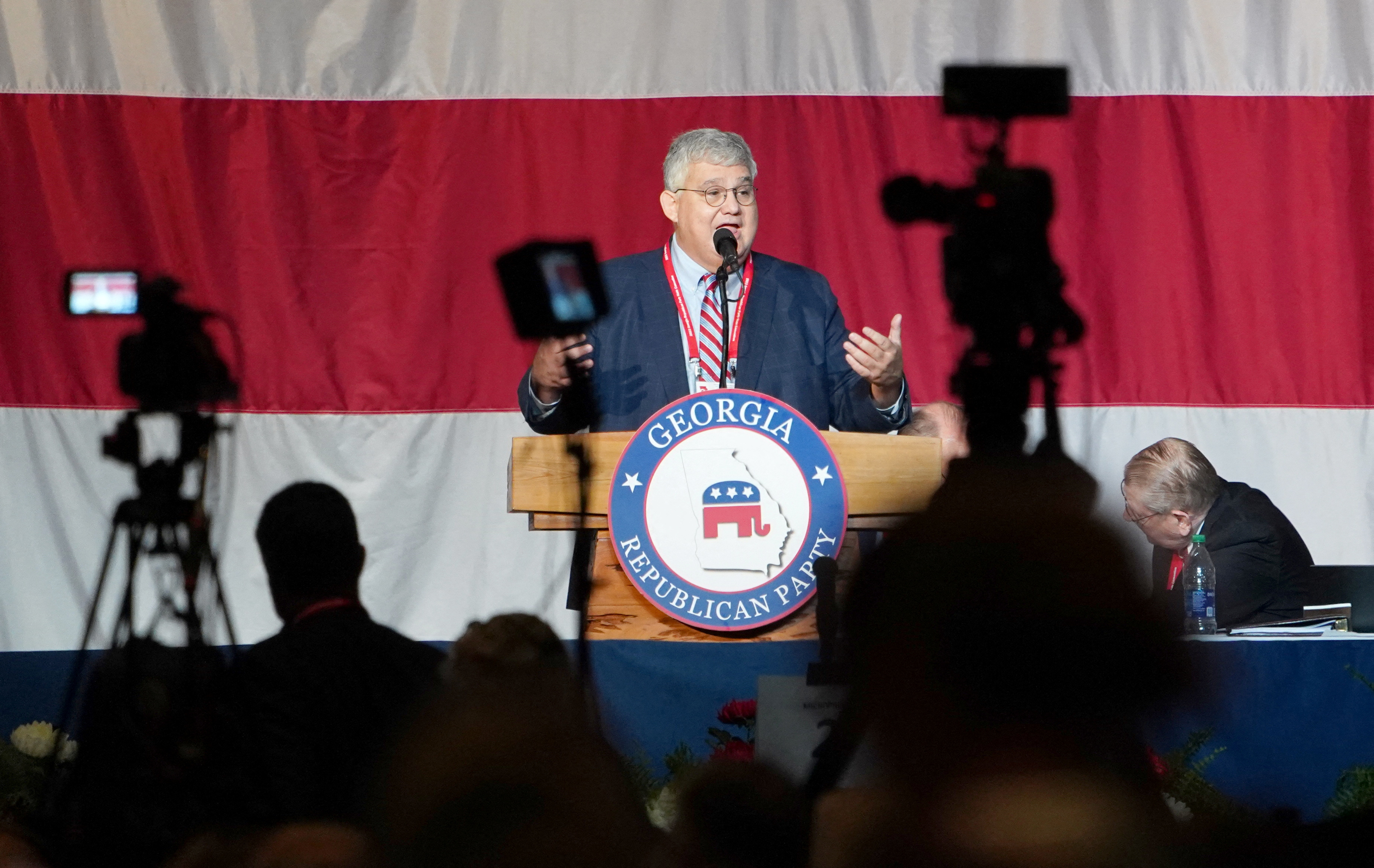 乔治亚州共和党主席大卫·沙弗在美国乔治亚州哥伦布市举行的共和党大会上发言,摄于2023年6月10日。路透社/Megan Varner