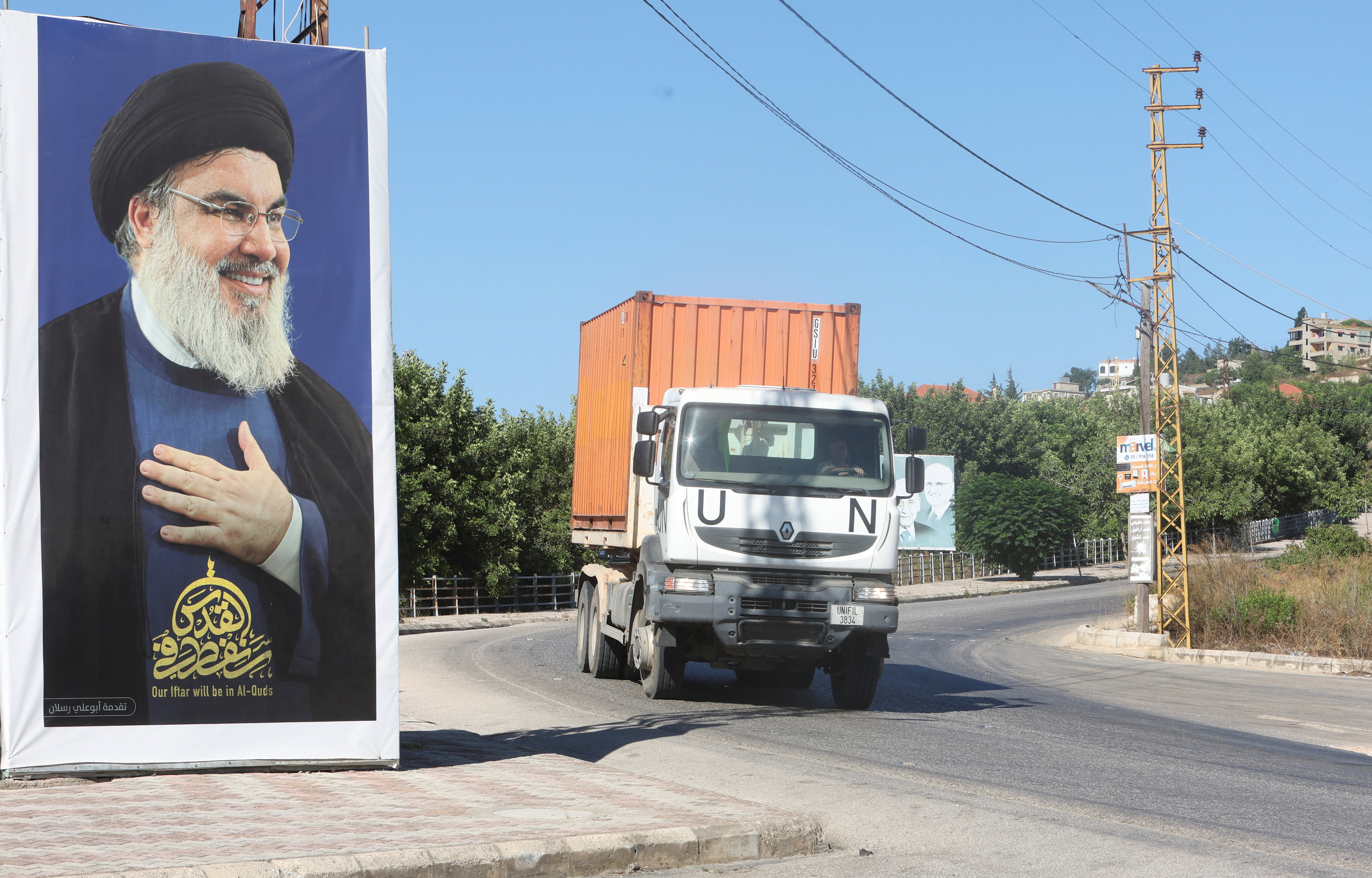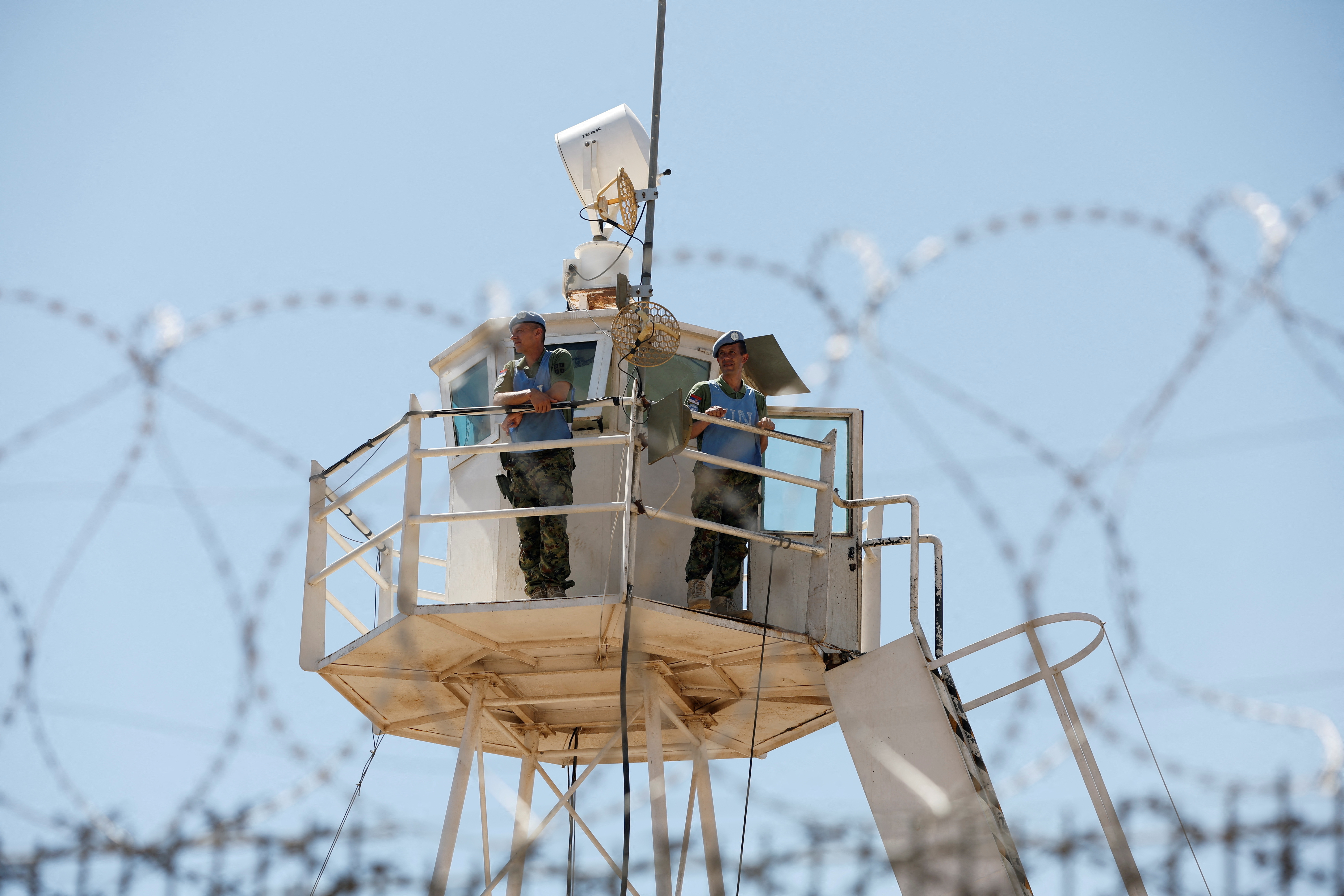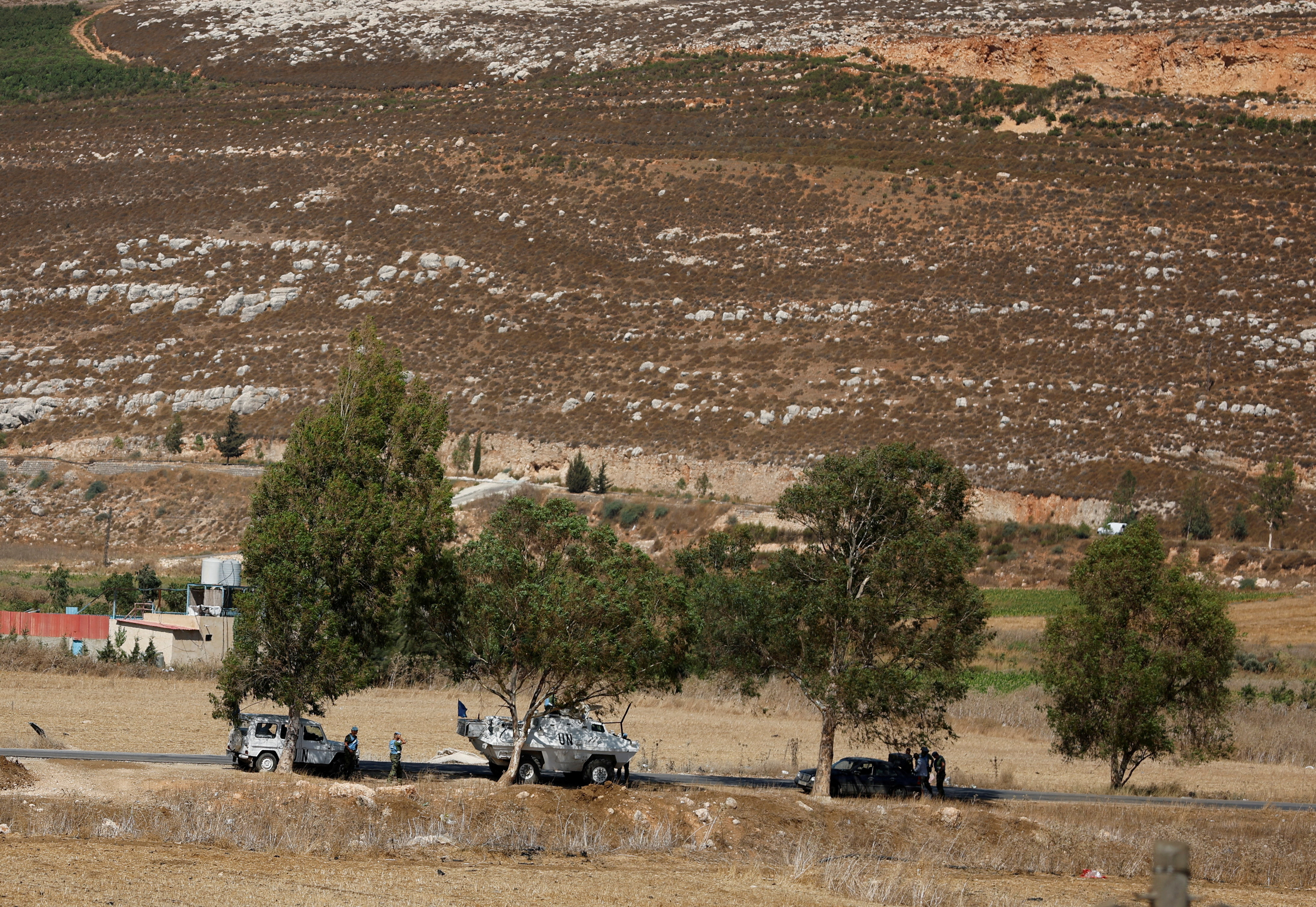 联合国黎巴嫩临时部队(UNIFIL)成员站在黎巴嫩南部黎以边境附近的纳库拉附近的车辆旁,2023年8月16日。路透社/阿齐兹·塔赫尔