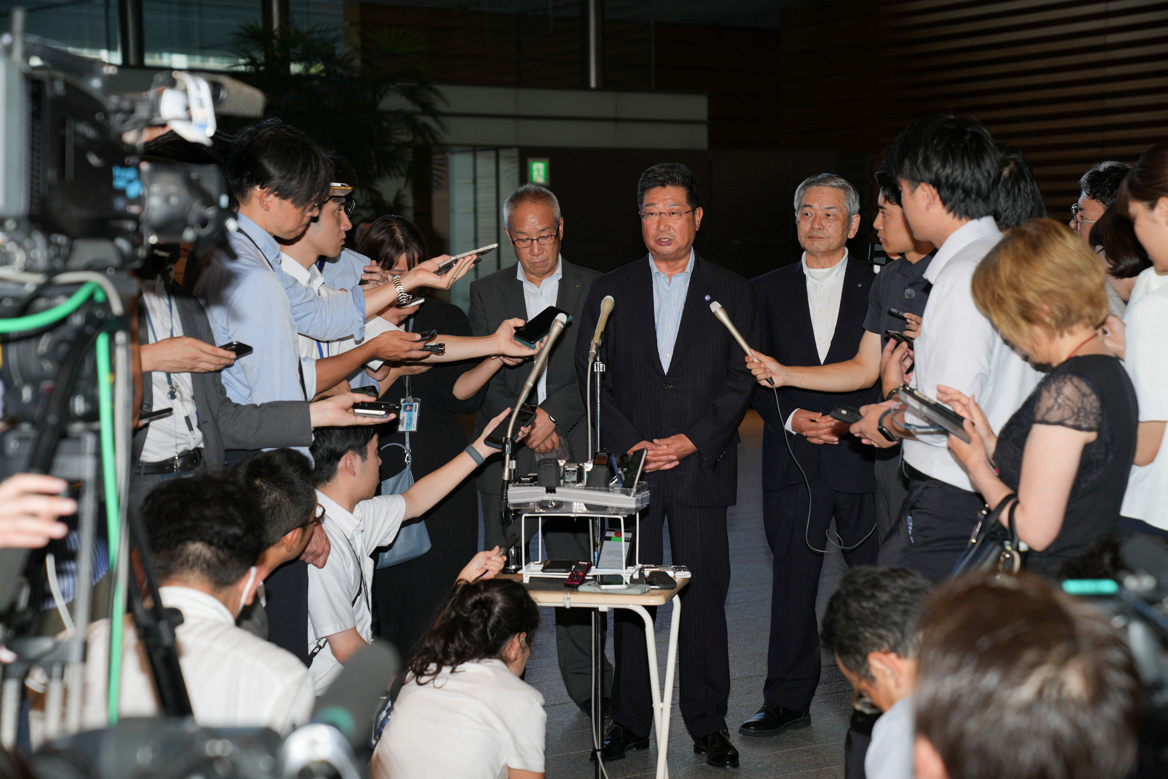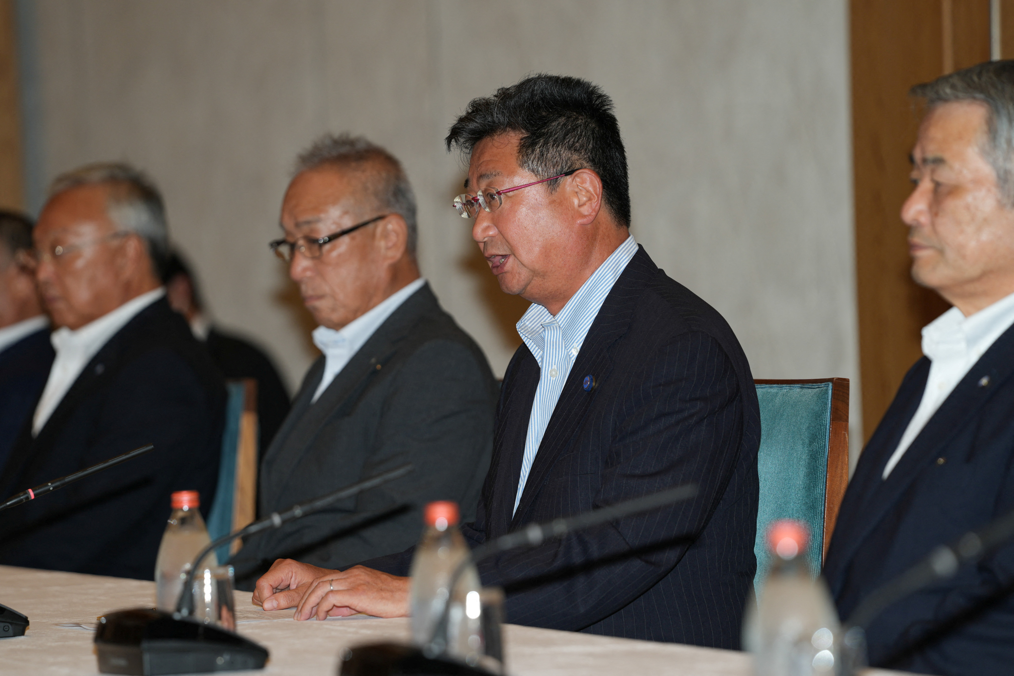 坂本正信,日本渔业合作协会主席,在2023年8月21日与日本首相岸田文雄在东京首相官邸举行会议时发言。张晓宇/路透社/摄