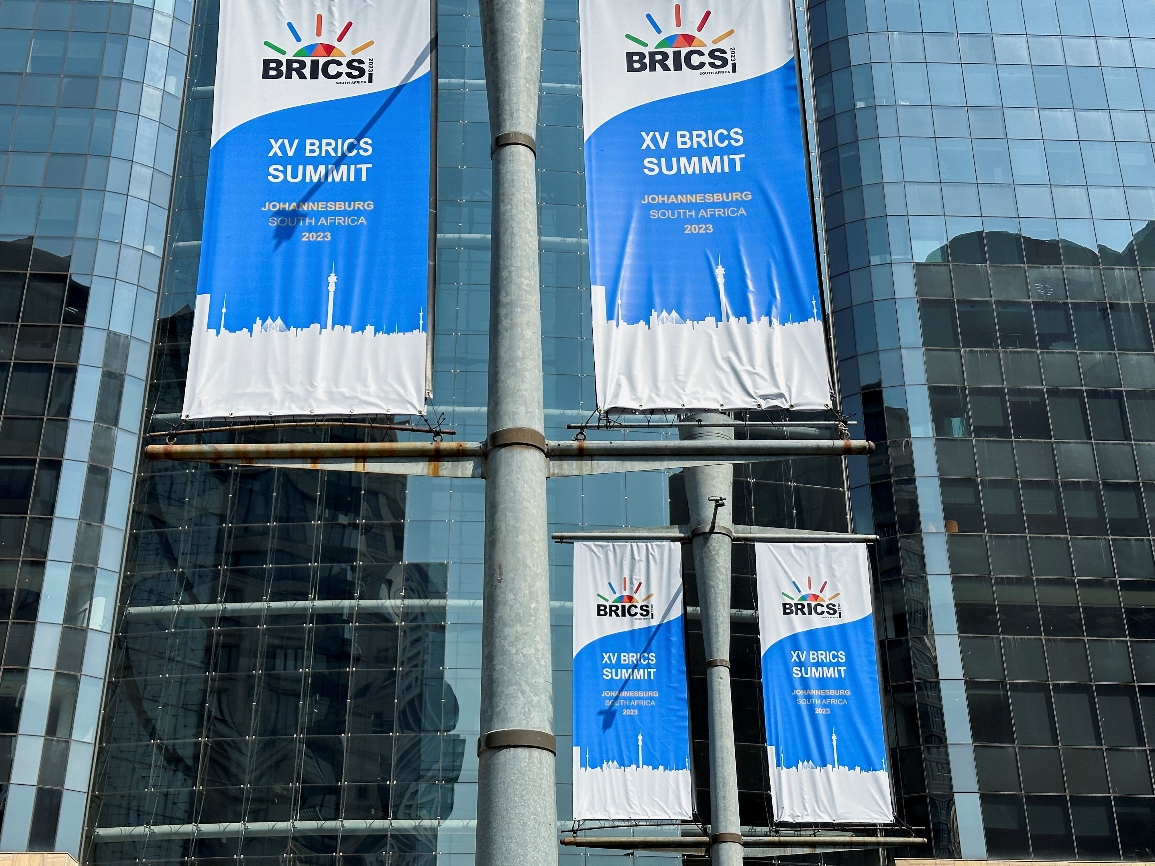人们走过桑顿会议中心,该中心将于2023年8月19日至23日举办即将到来的金砖国家峰会,地点在南非约翰内斯堡。路透社/詹姆斯·奥特韦摄