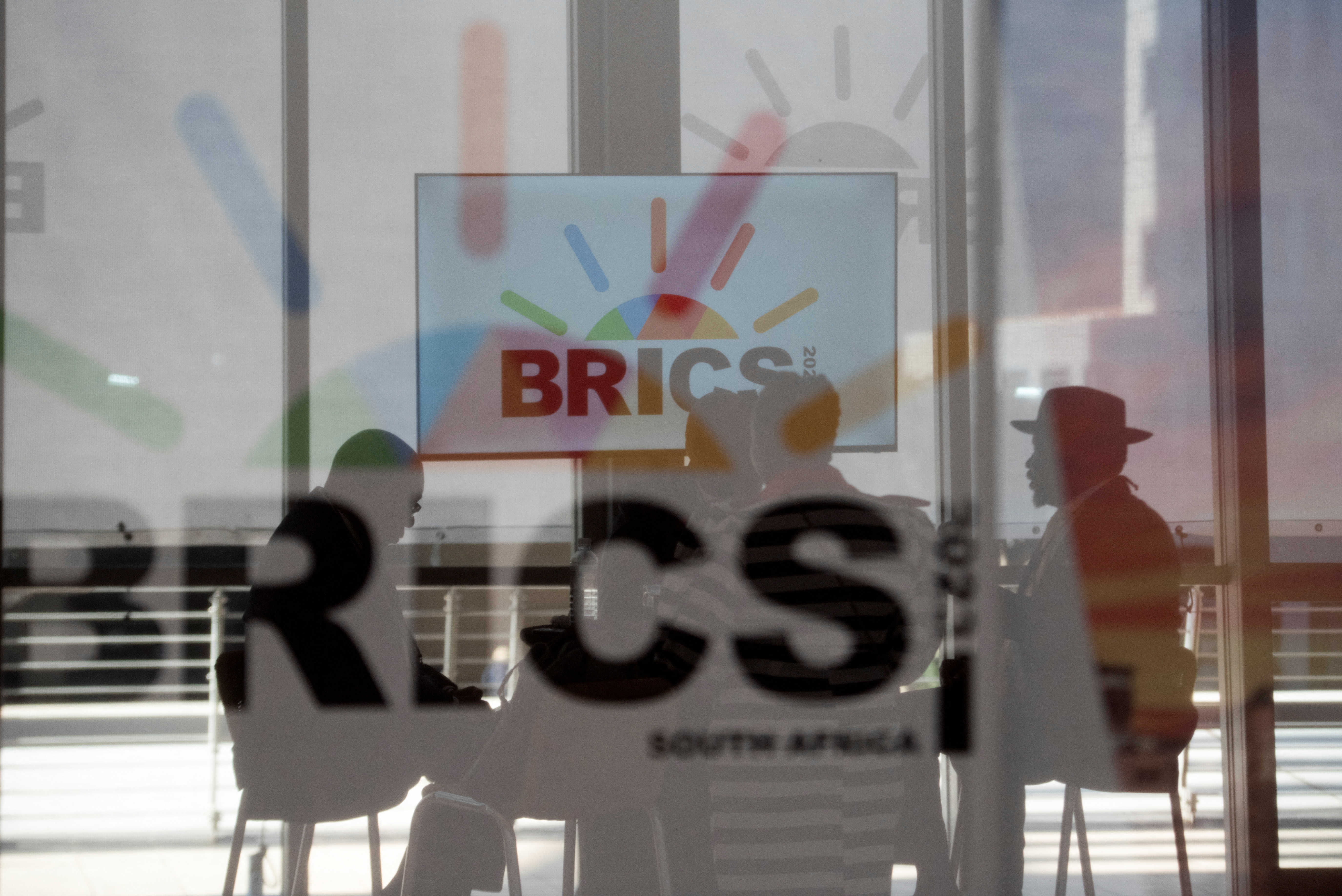 南非代表团坐在一面印有金砖国家标志的玻璃后面,金砖国家峰会于2023年8月23日在南非约翰内斯堡举行。路透社/Alet Pretorius摄
