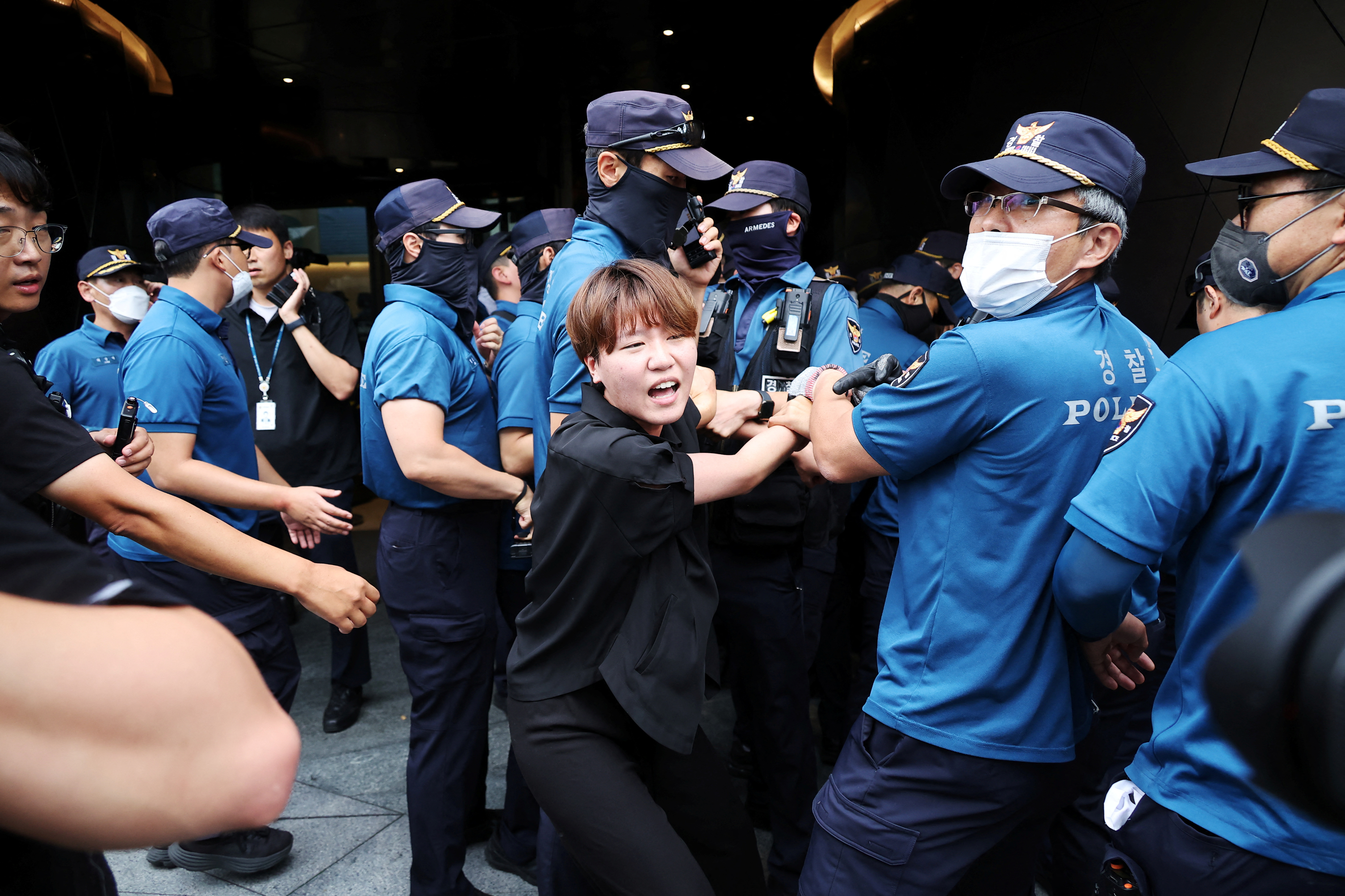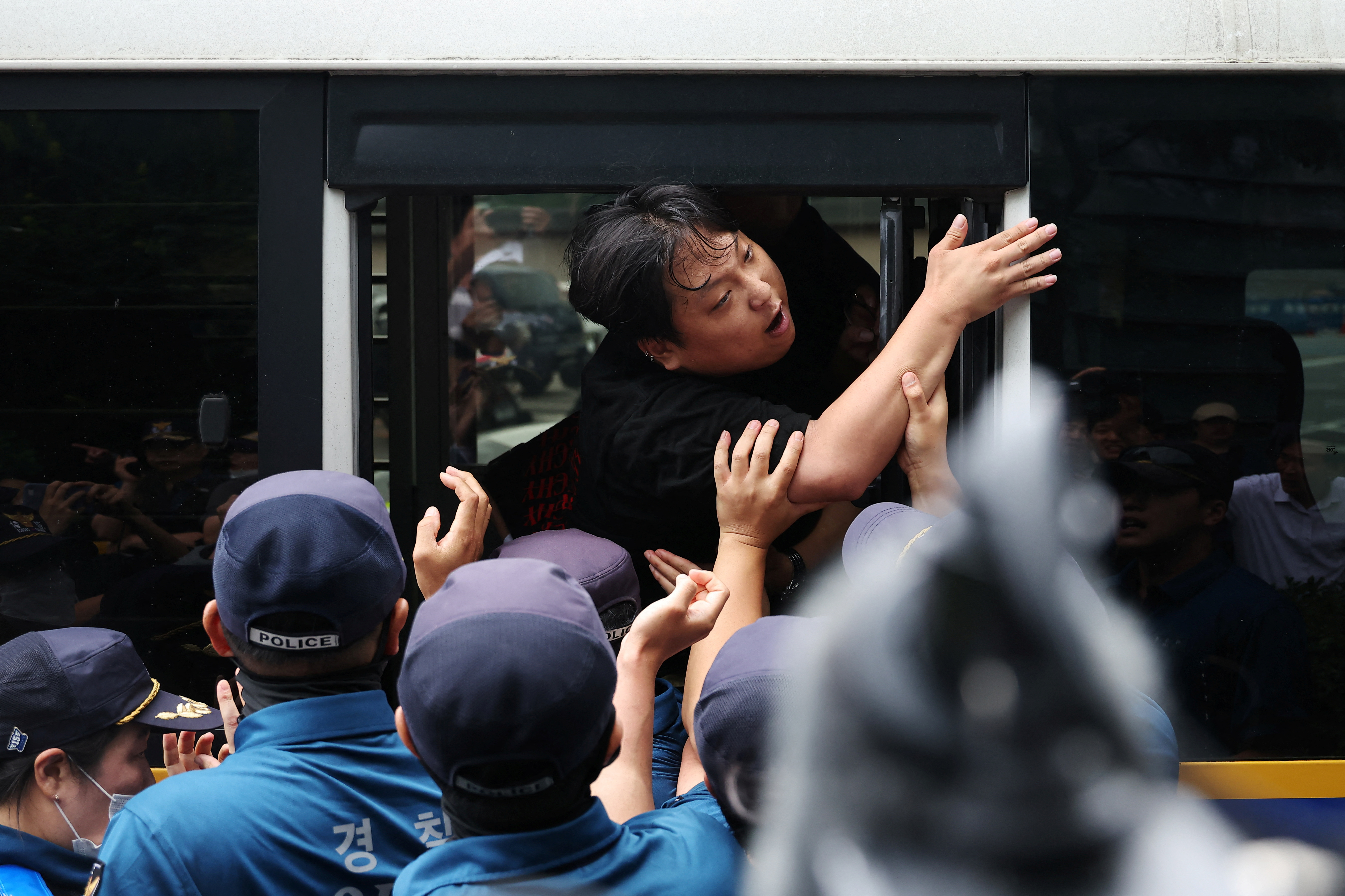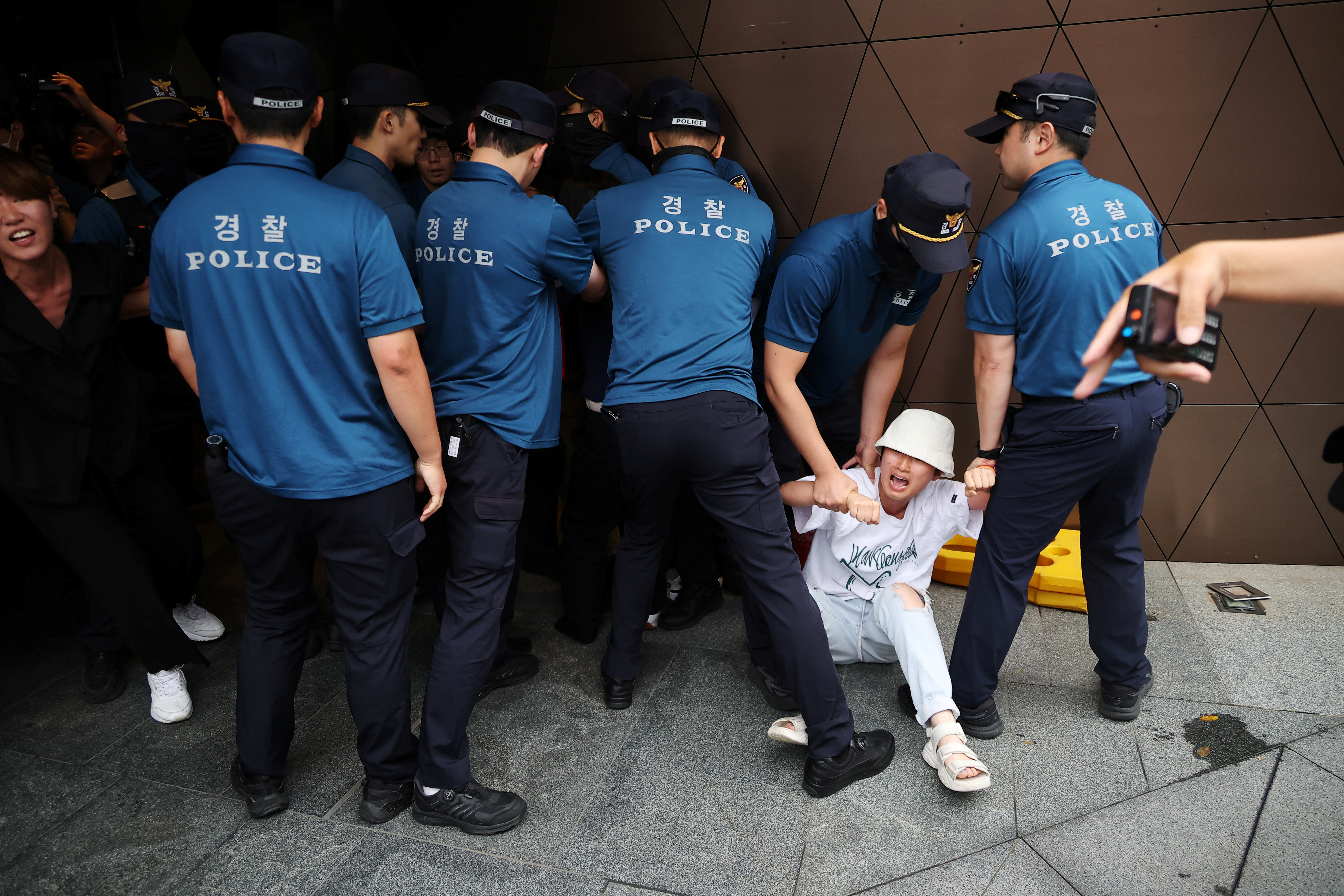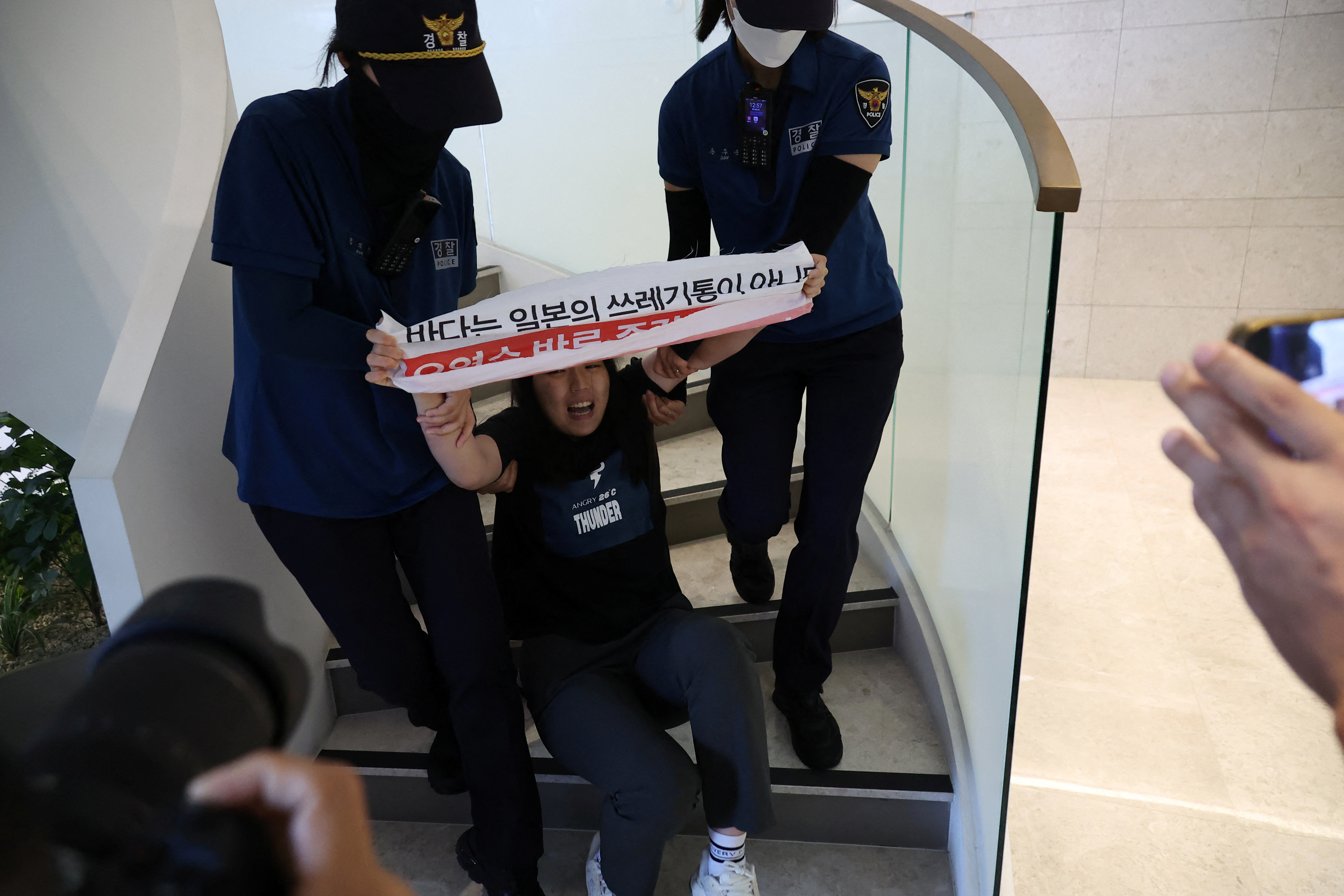 一名大学生试图闯入日本大使馆,被拘留,此举是为了抗议日本将福岛核电站处理过的放射性废水排入太平洋,地点在韩国首尔,2023年8月24日。路透社/金洪基 摄