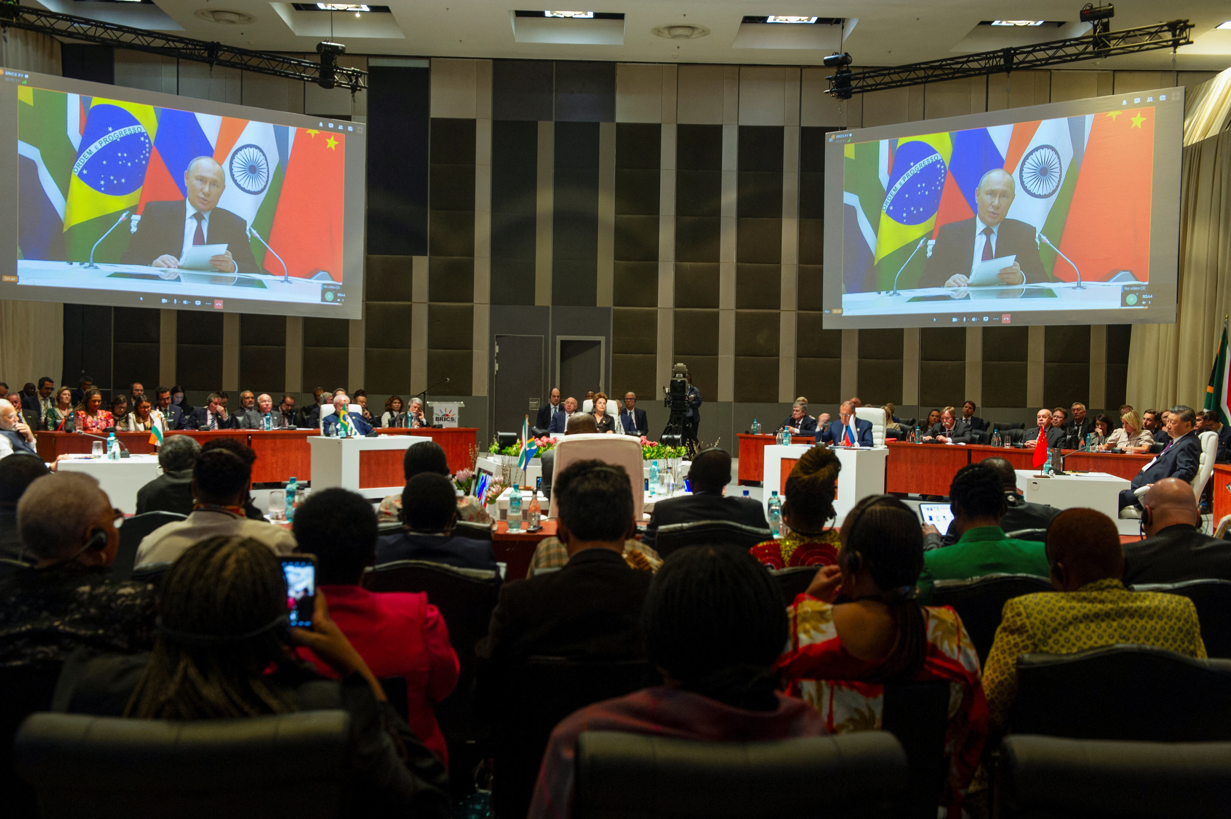 俄罗斯总统普京因涉嫌在乌克兰犯下战争罪行而被国际逮捕令通缉,他正在远程参加峰会,急于向西方大国展示他仍有朋友。据称在乌克兰犯下战争罪行。