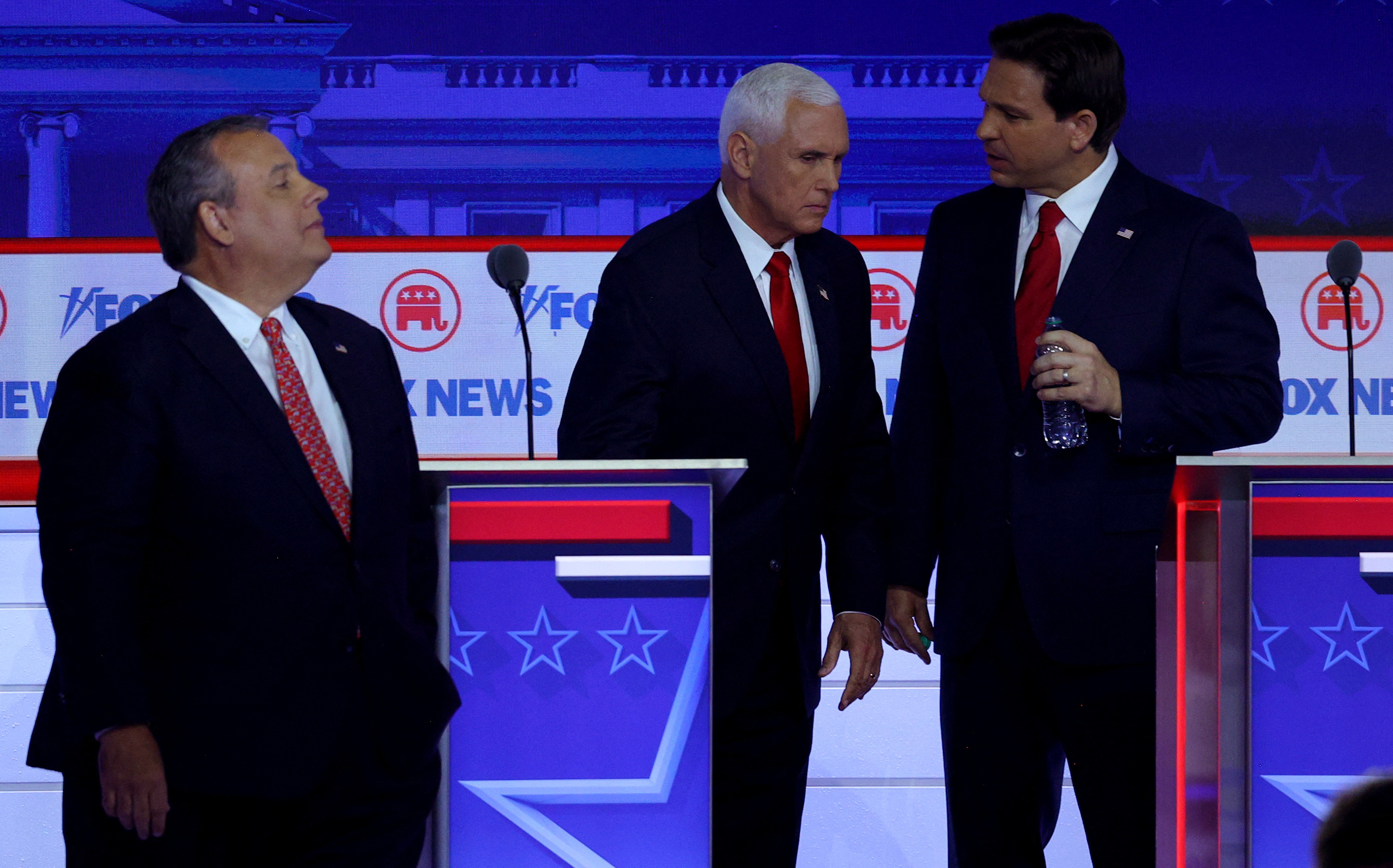 前新泽西州州长克里斯·克里斯蒂经过,前美国副总统迈克·彭斯在2024年美国总统竞选的第一场共和党候选人辩论中与佛罗里达州州长罗恩·德桑蒂斯在威斯康星州密尔沃基市商业休息时交谈,2023年8月23日,美国。路透社/Brian Snyder
