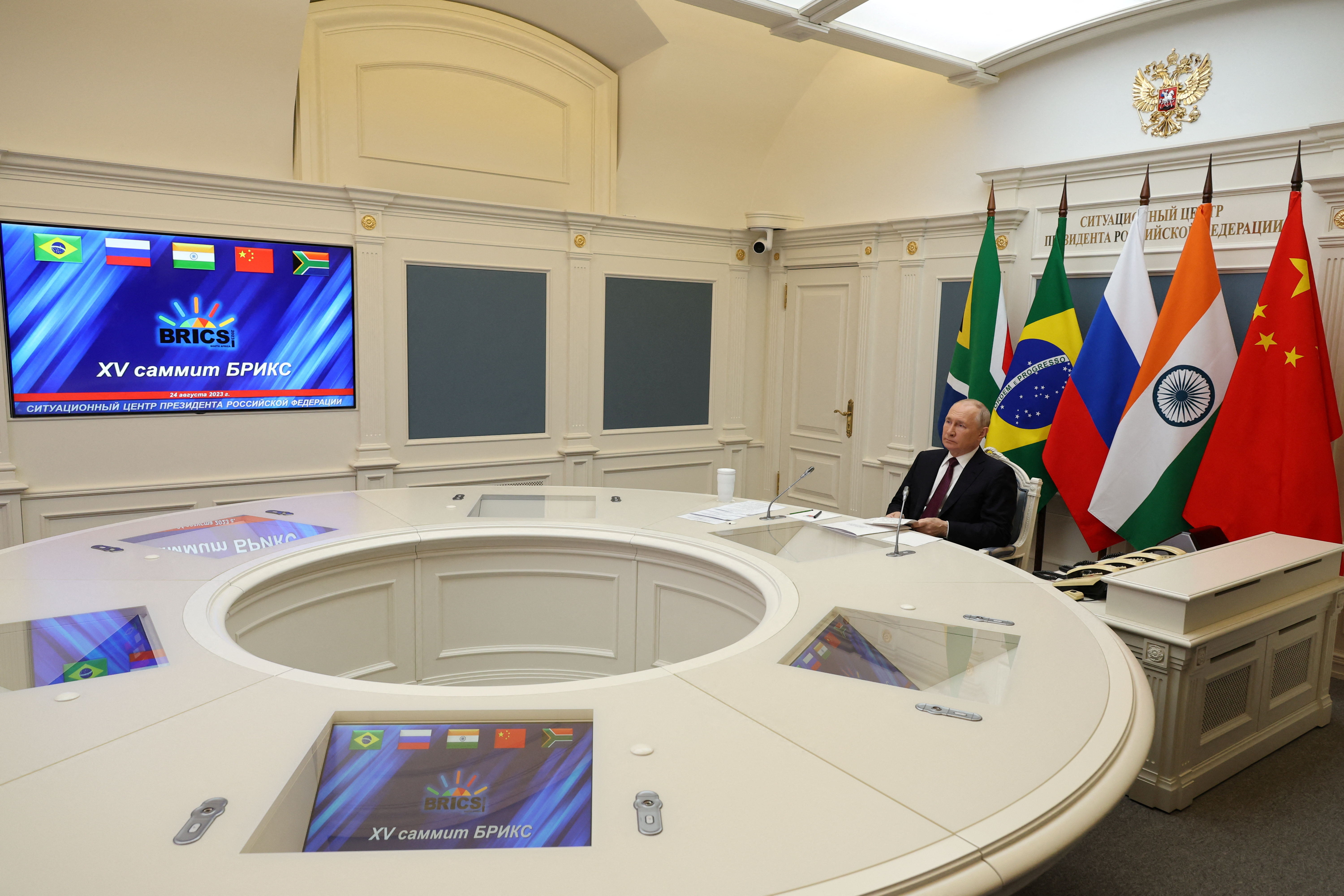 “金砖国家并不与任何人竞争,”因被指控战争罪而远程参加峰会的俄罗斯总统弗拉基米尔·普京周四表示。