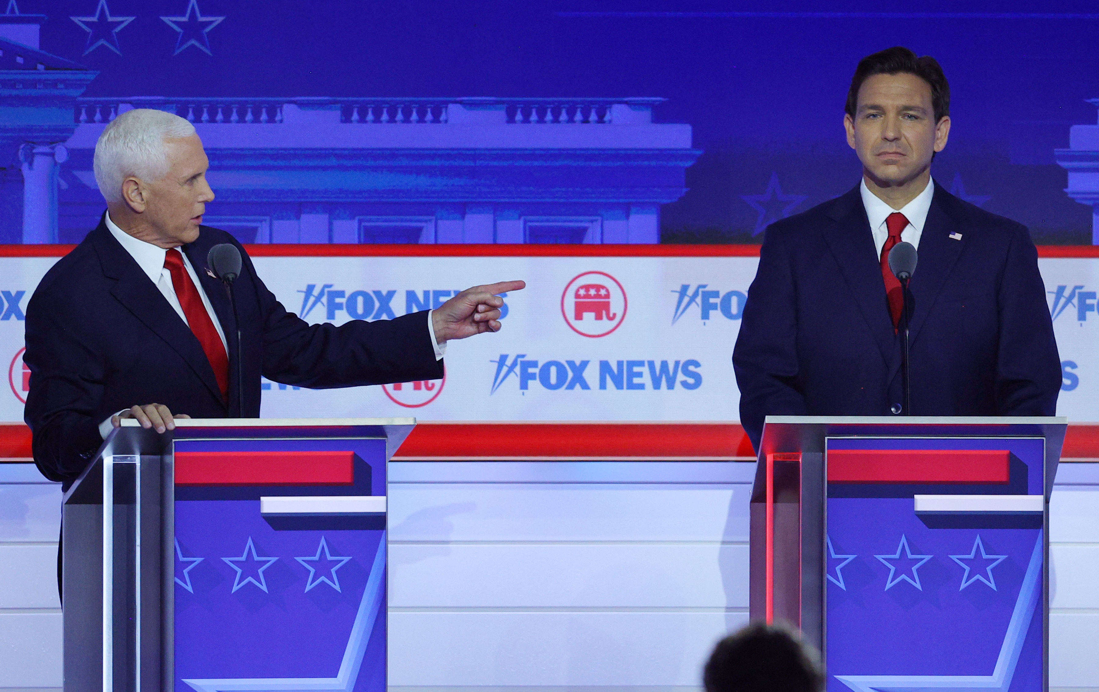前美国副总统迈克·彭斯指着佛罗里达州州长罗恩·德桑蒂斯,当他们在美国威斯康辛州密尔沃基市举行的2024年美国总统竞选的第一场共和党候选人辩论会上辩论,图片来源:路透社/Brian Snyder