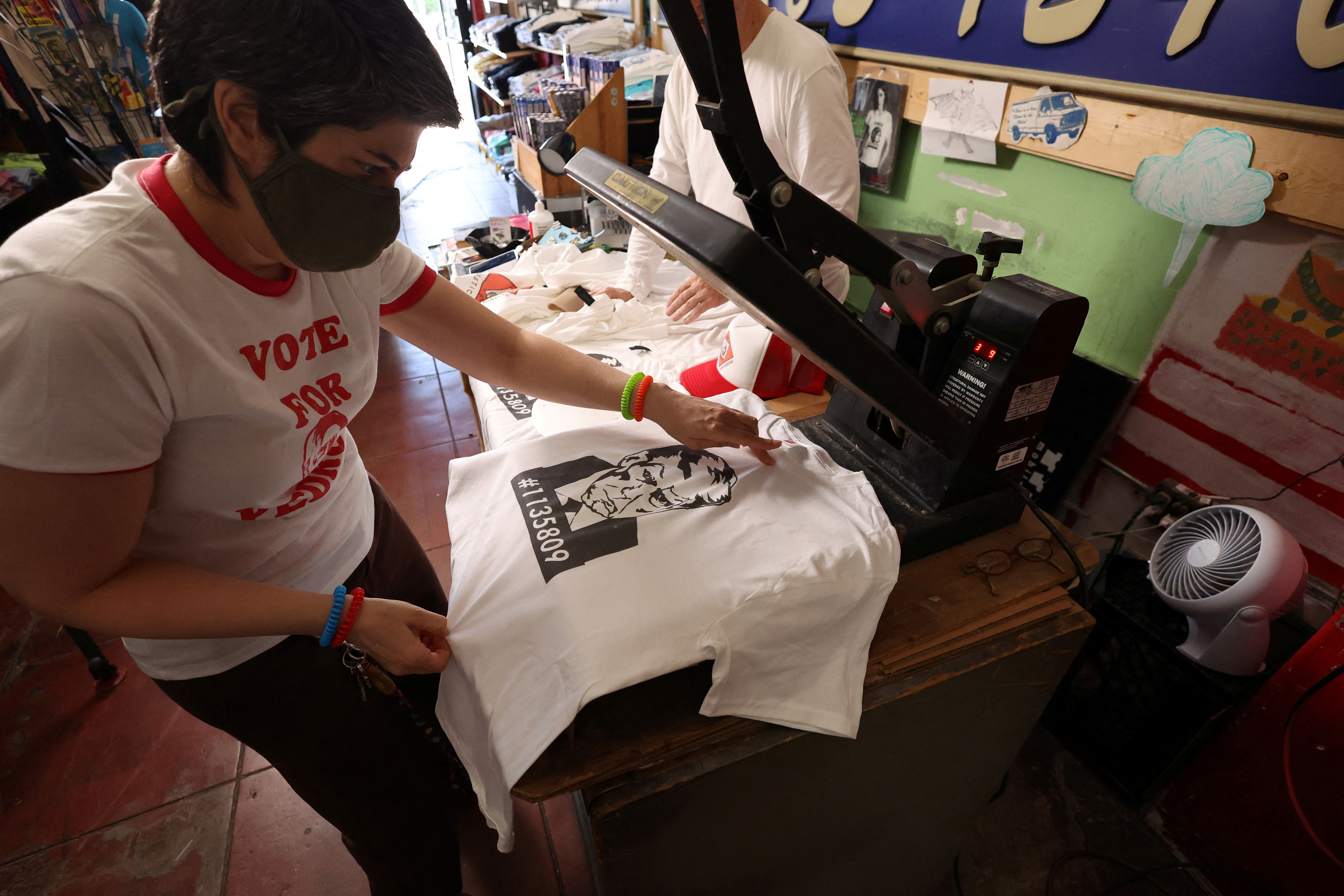 在美国加利福尼亚州洛杉矶的Y-Que印刷店拍摄的一张印有前总统唐纳德·特朗普和鲁迪·朱利安尼的照片的T恤衫,2023年8月25日。路透社/Mario Anzuoni摄
