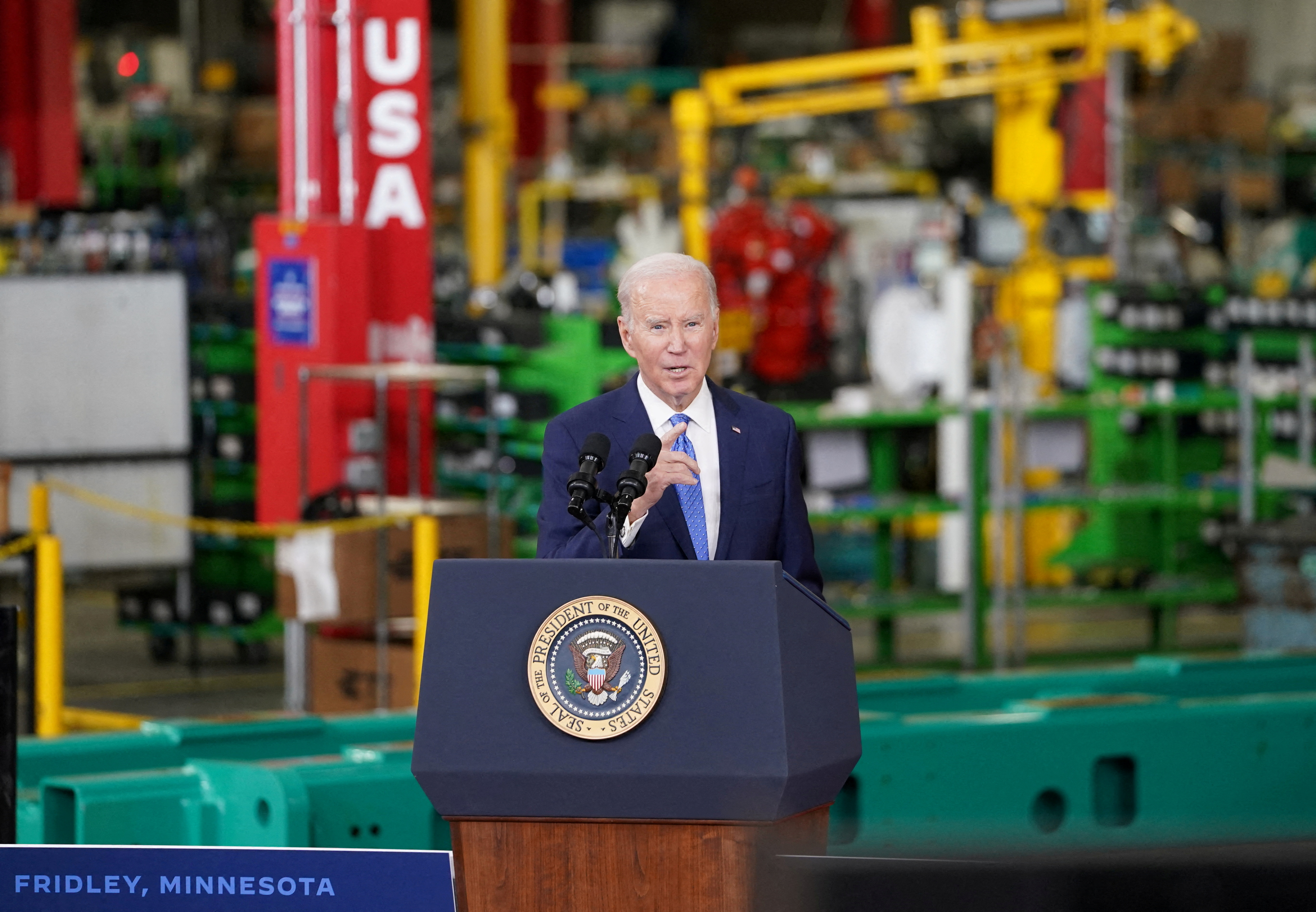 美国总统乔·拜登在2023年4月3日访问美国明尼苏达州弗里德利康明斯发电厂期间发表讲话。路透社/凯文·拉马克摄