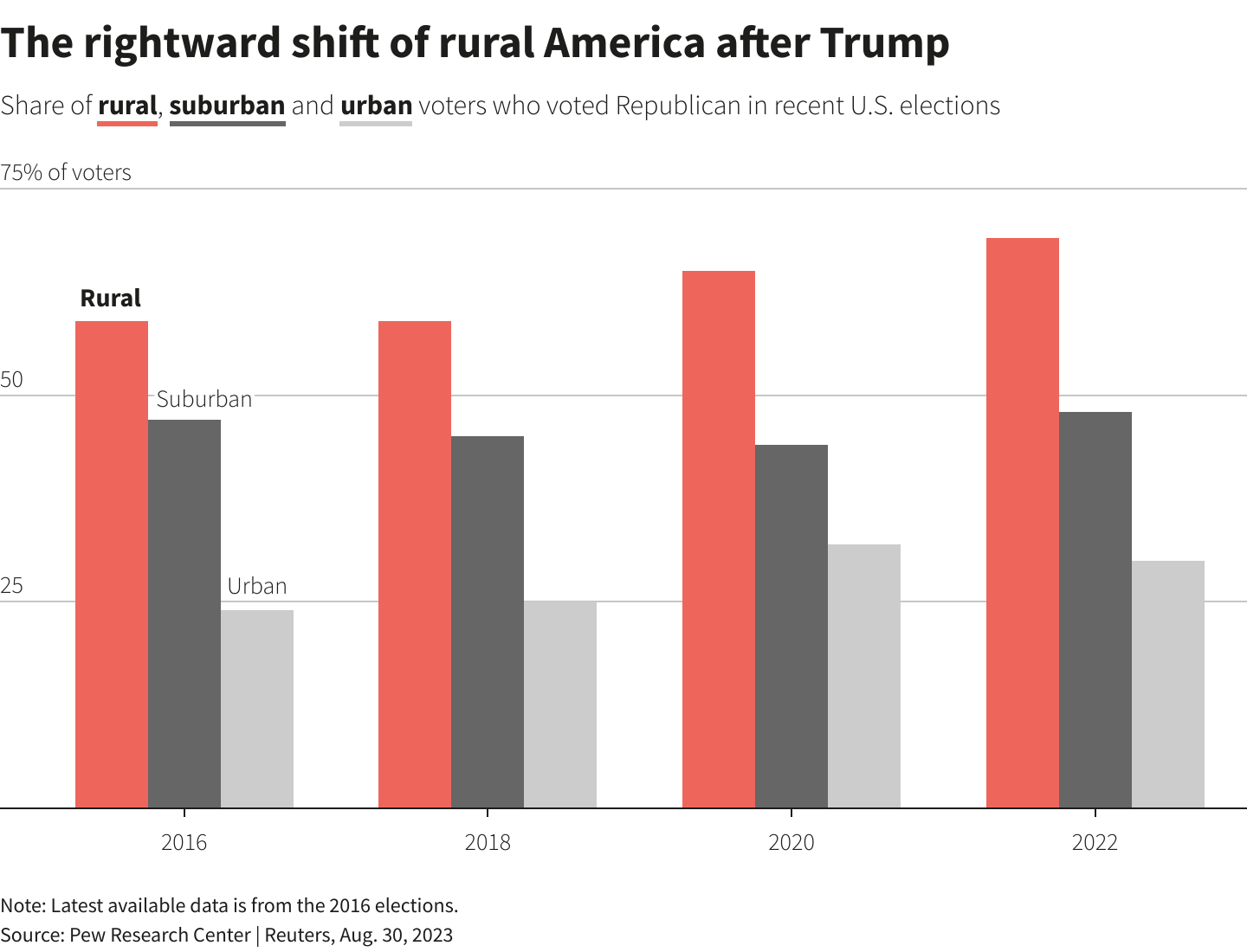 特朗普在2020年扩大了他在农村选民中的领先优势,从2016年的59%增加到65%。在2022年的中期选举中,共和党候选人获得了69%的农村选票。