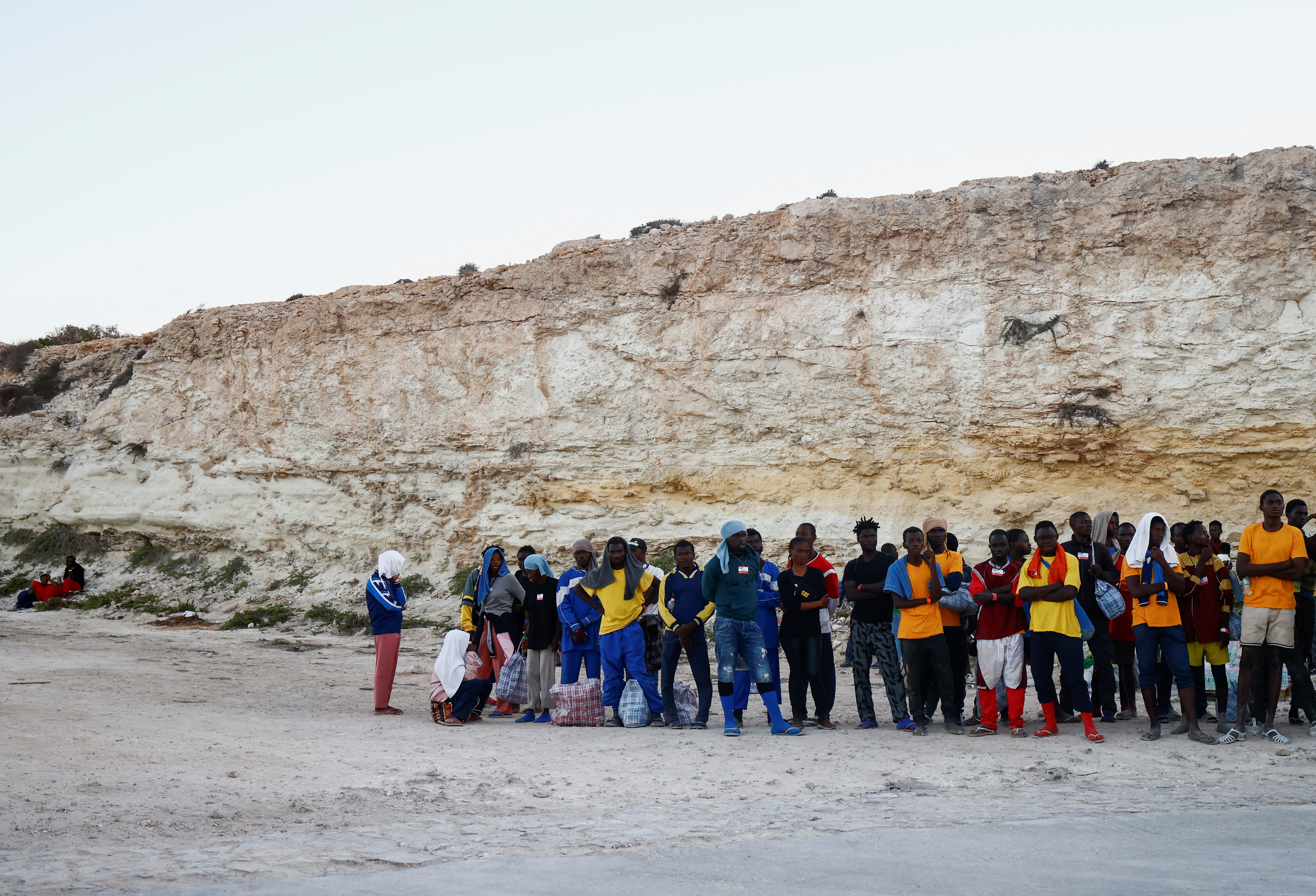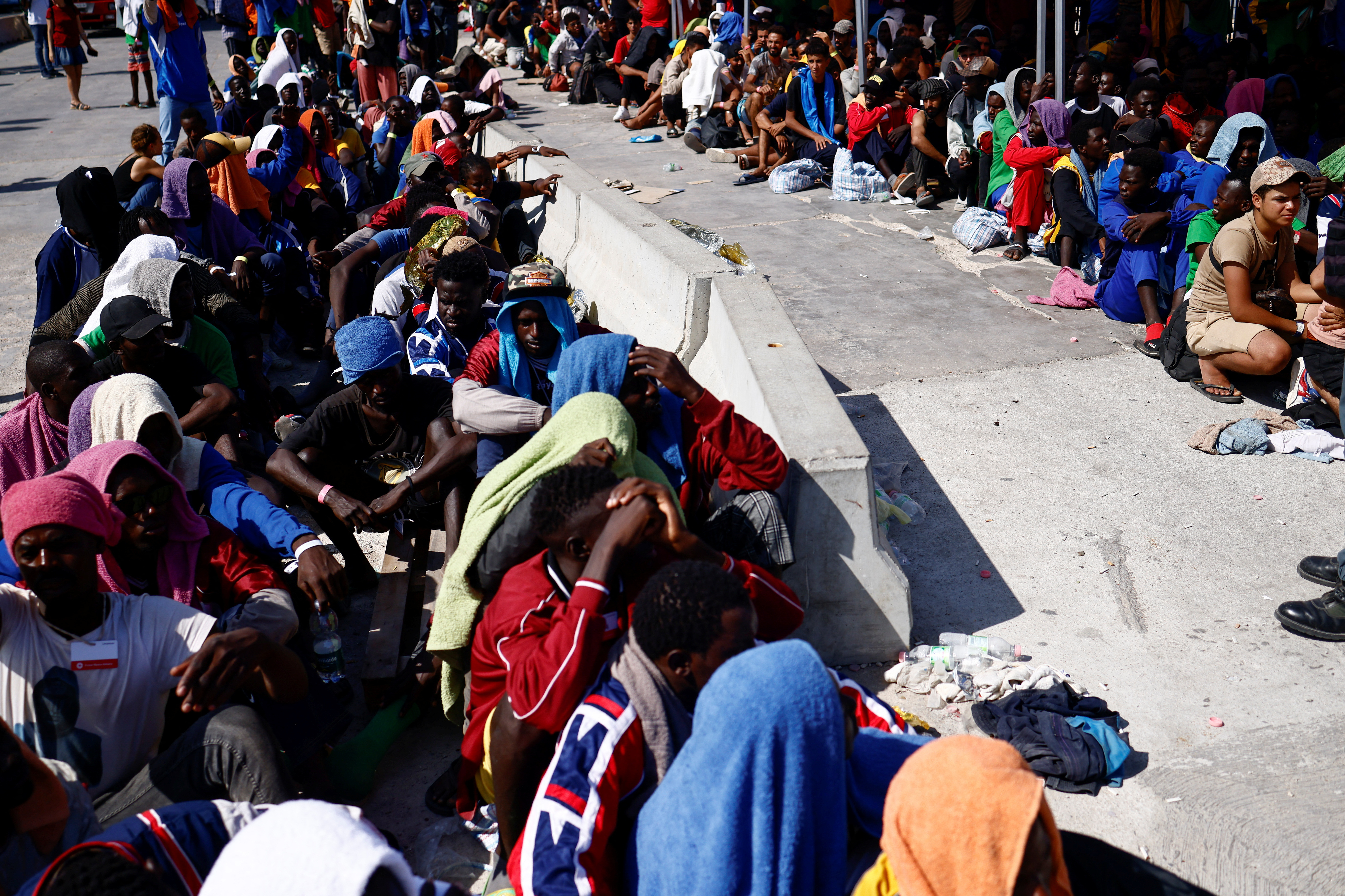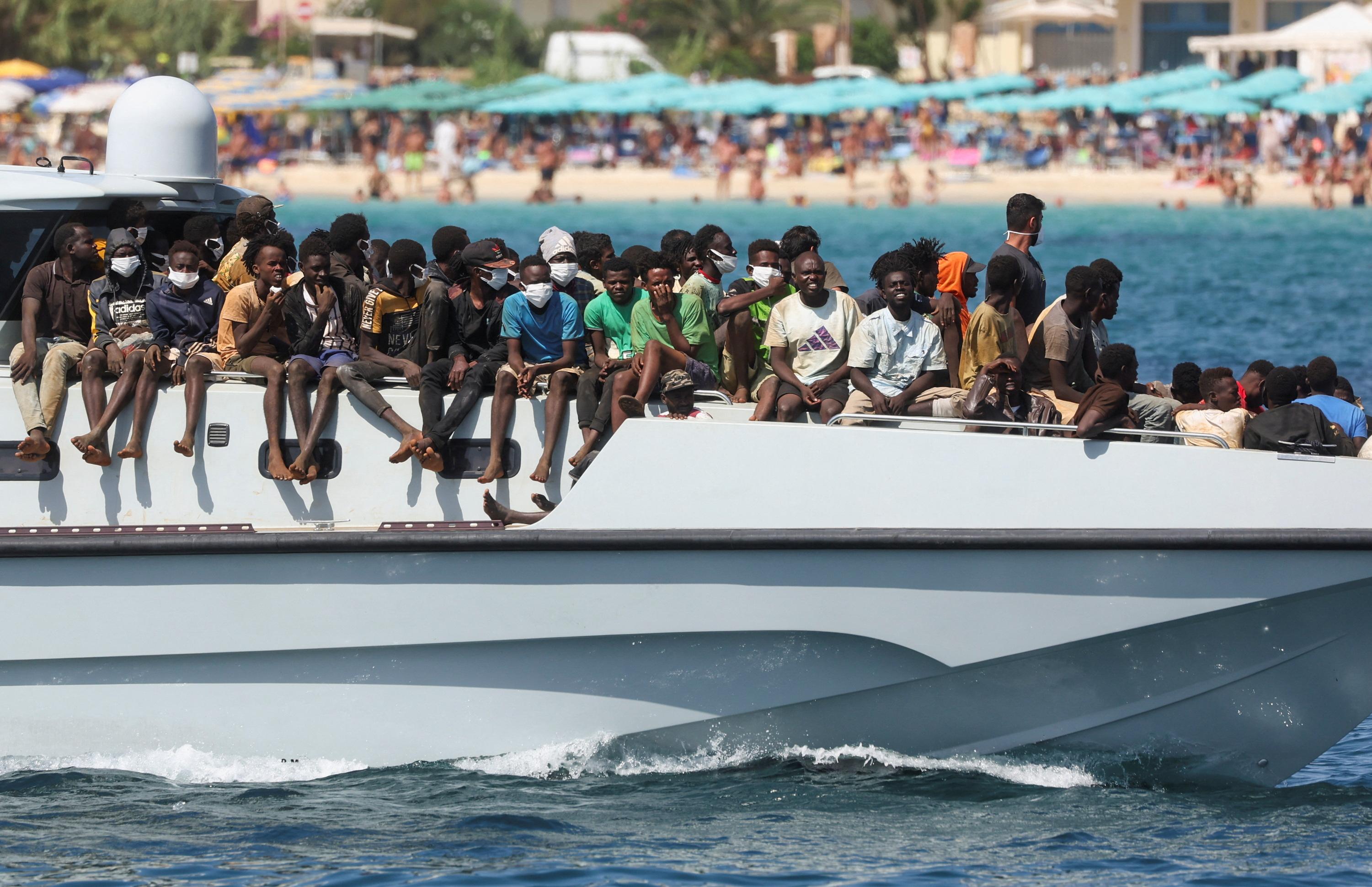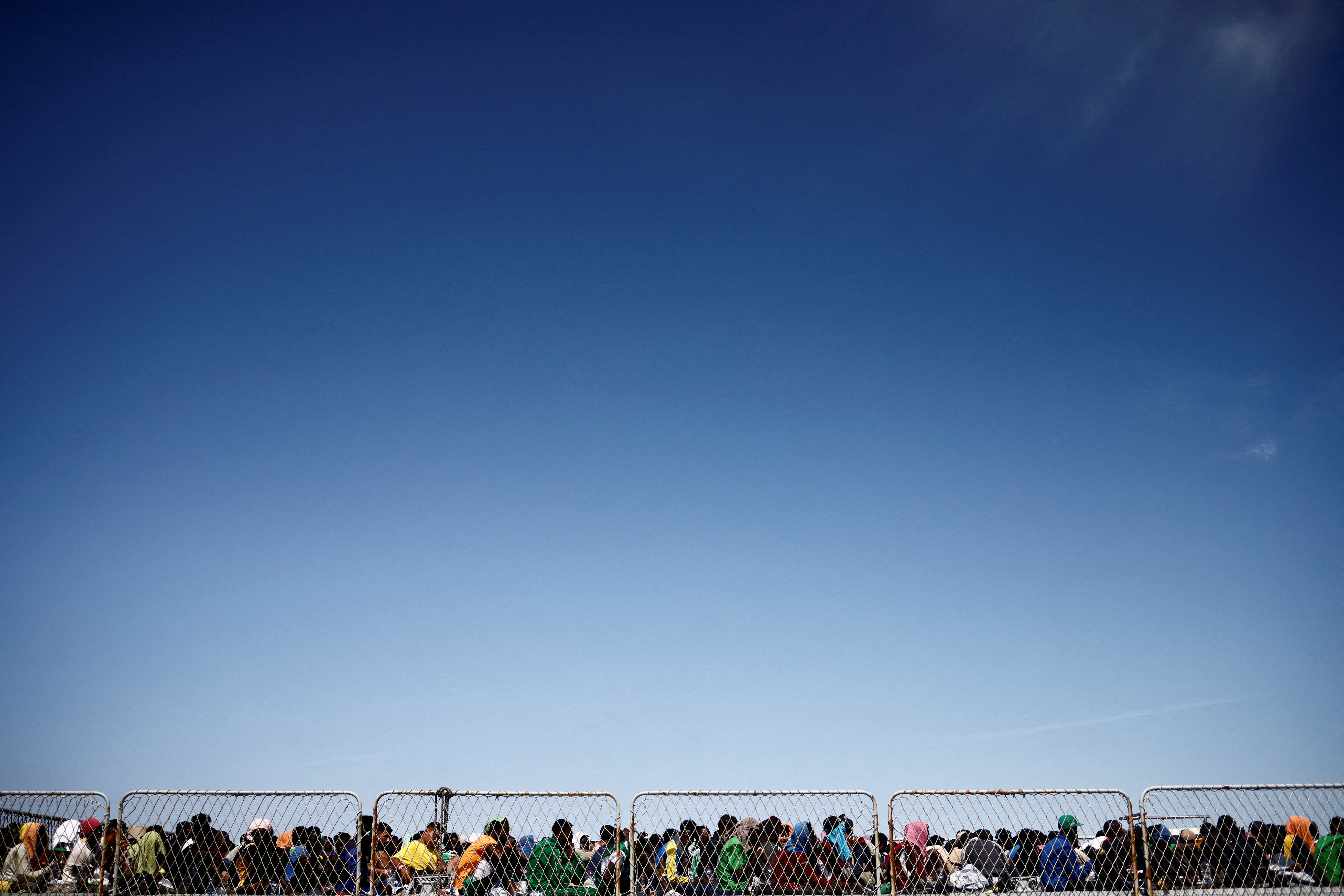 移民们在西西里岛兰佩杜萨的港口等待转移到意大利大陆,2023年9月15日。路透社/雅拉·纳尔迪