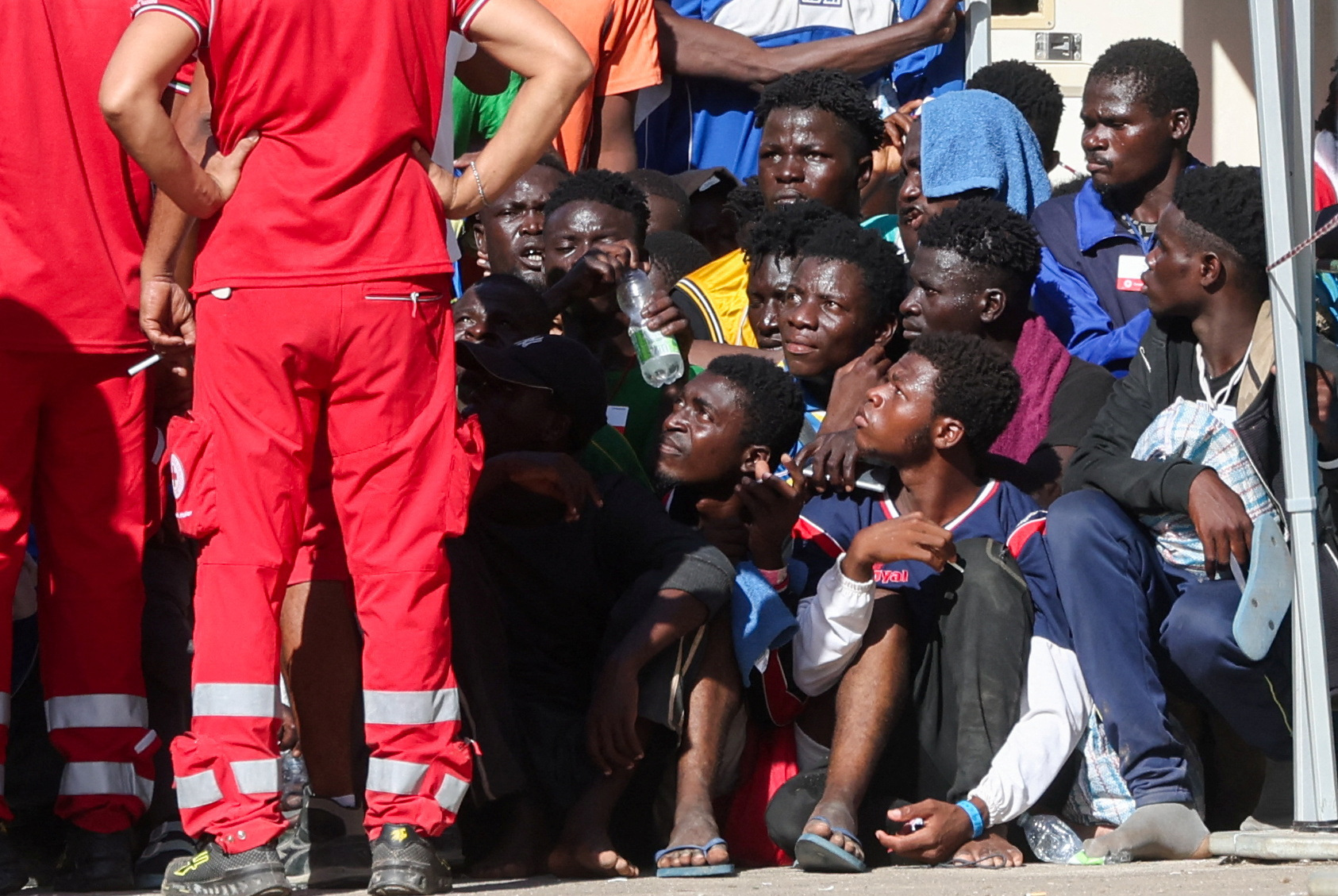 移民聚集在热点地区,这是欧洲委员会主席冯德莱恩和意大利总理梅洛尼前往意大利西西里岛兰佩杜萨的接待中心之前的情景,2023年9月17日。路透社/雅拉·纳尔迪摄