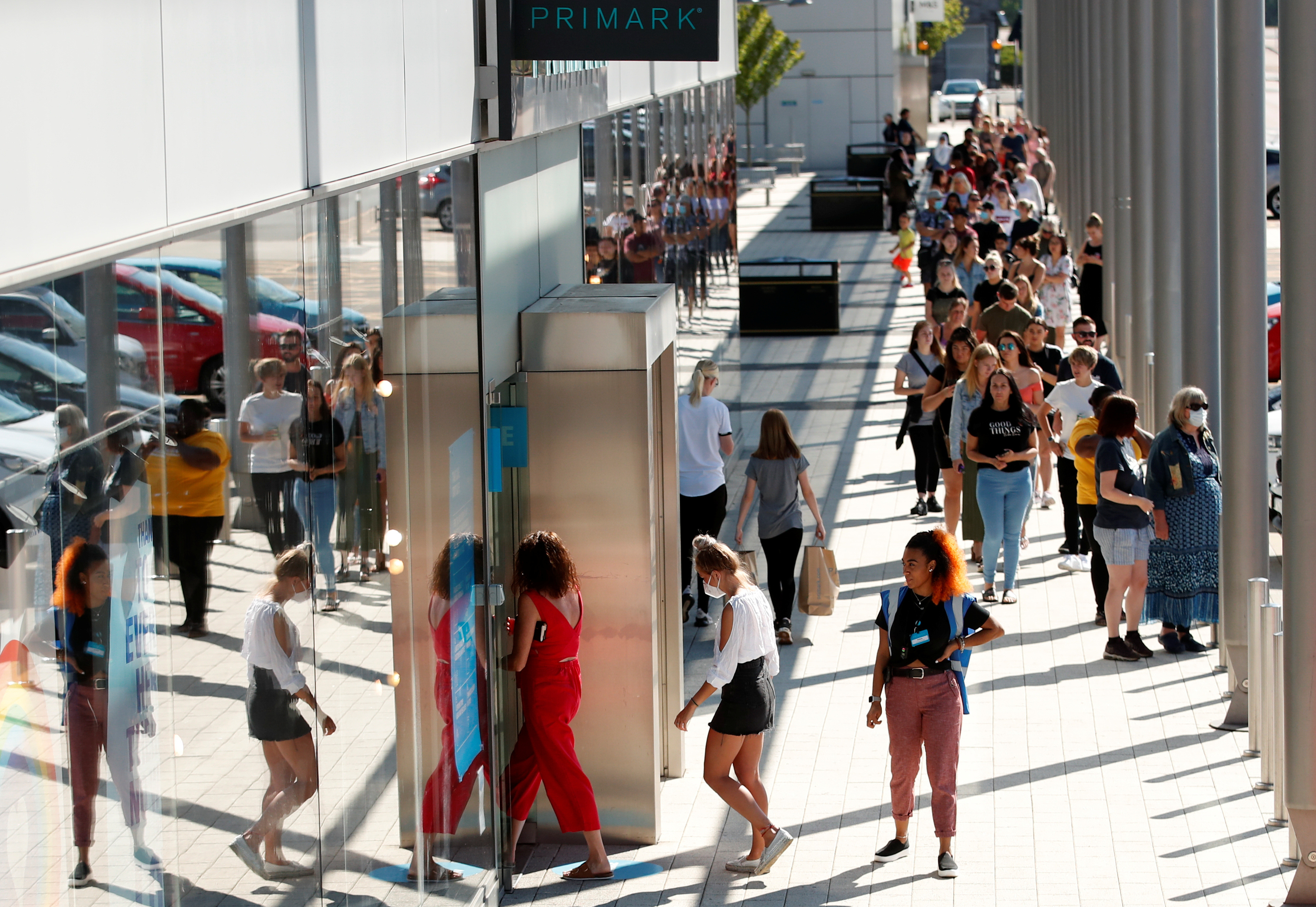 人们排队进入Primark商店,因为它在新冠疫情爆发后重新开业,位于英国米尔顿凯恩斯的MK1购物休闲公园,2020年6月15日。路透社/安德鲁·博耶斯