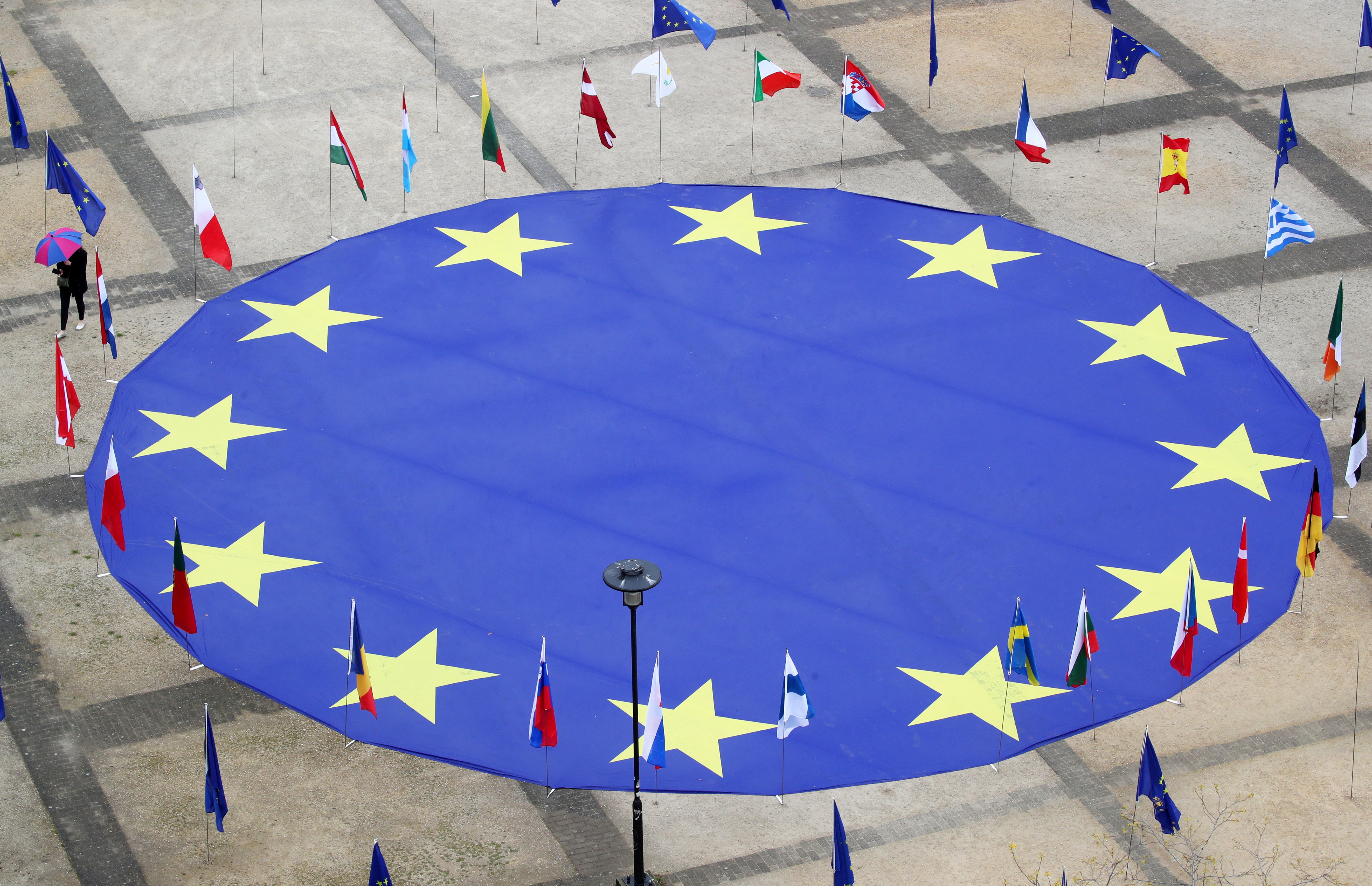 一个大型的欧盟旗帜横放在舒曼广场的中心,位于欧盟委员会总部外,纪念1950年罗伯特·舒曼在比利时布鲁塞尔发表的宣言,即欧洲日前夕,2021年5月8日。路透社/伊夫·赫尔曼摄