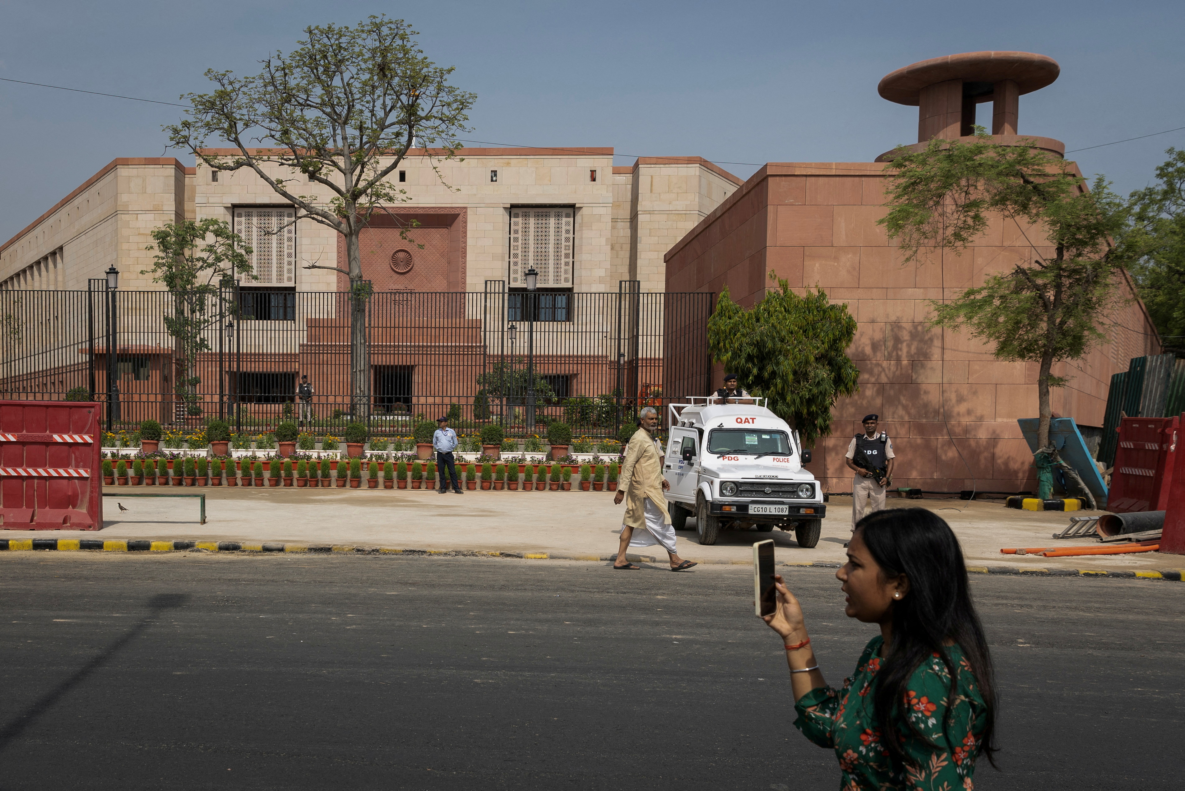 印度新德里,2023年5月28日,在印度新德里的印度新议会大厦外,一名媒体成员在其落成典礼前工作。路透社/Adnan Abidi/文件照片