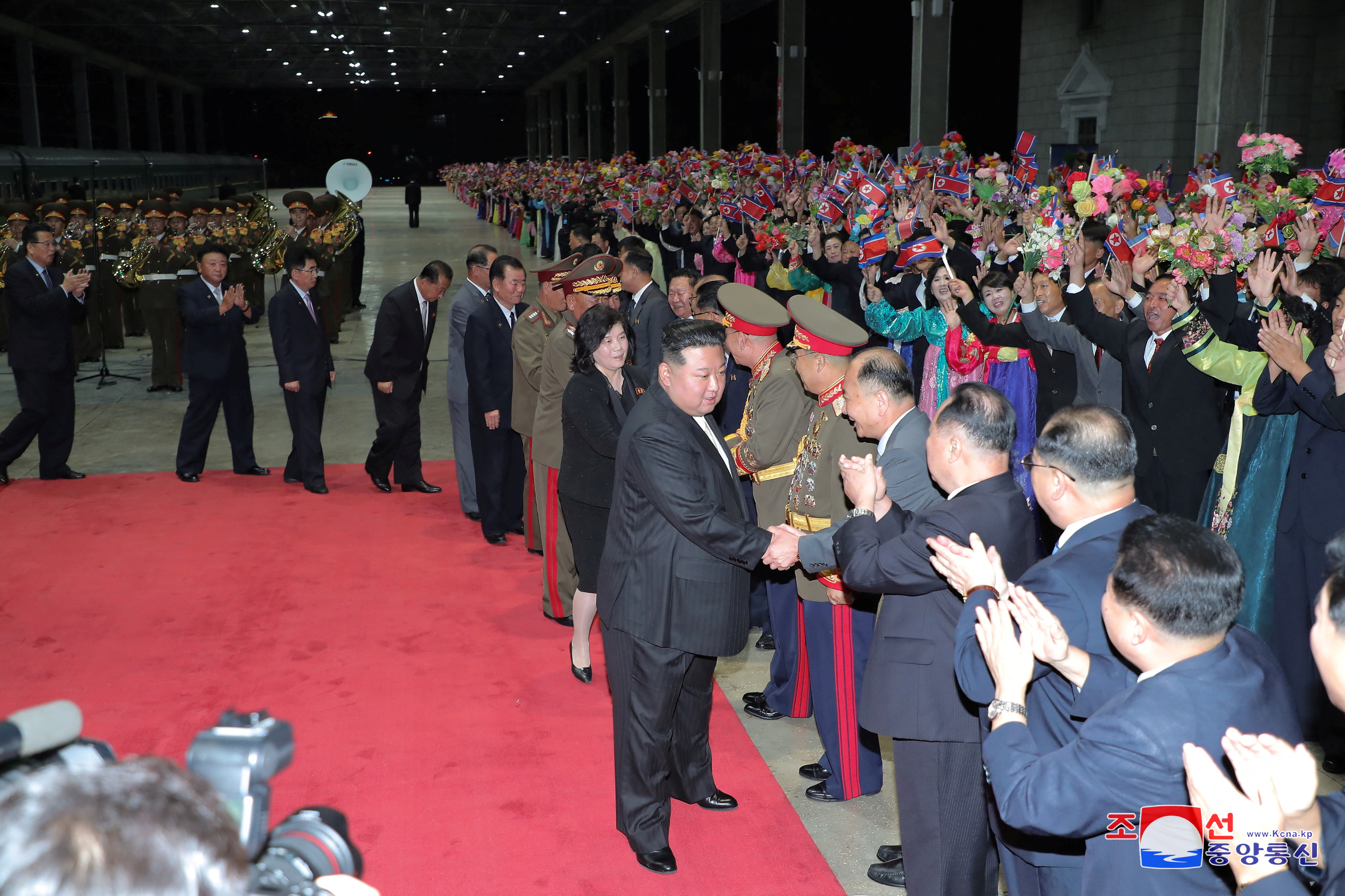 朝鲜领导人金正恩在2023年9月20日由朝鲜中央通讯社发布的照片中受到欢迎,当时他返回朝鲜平壤。