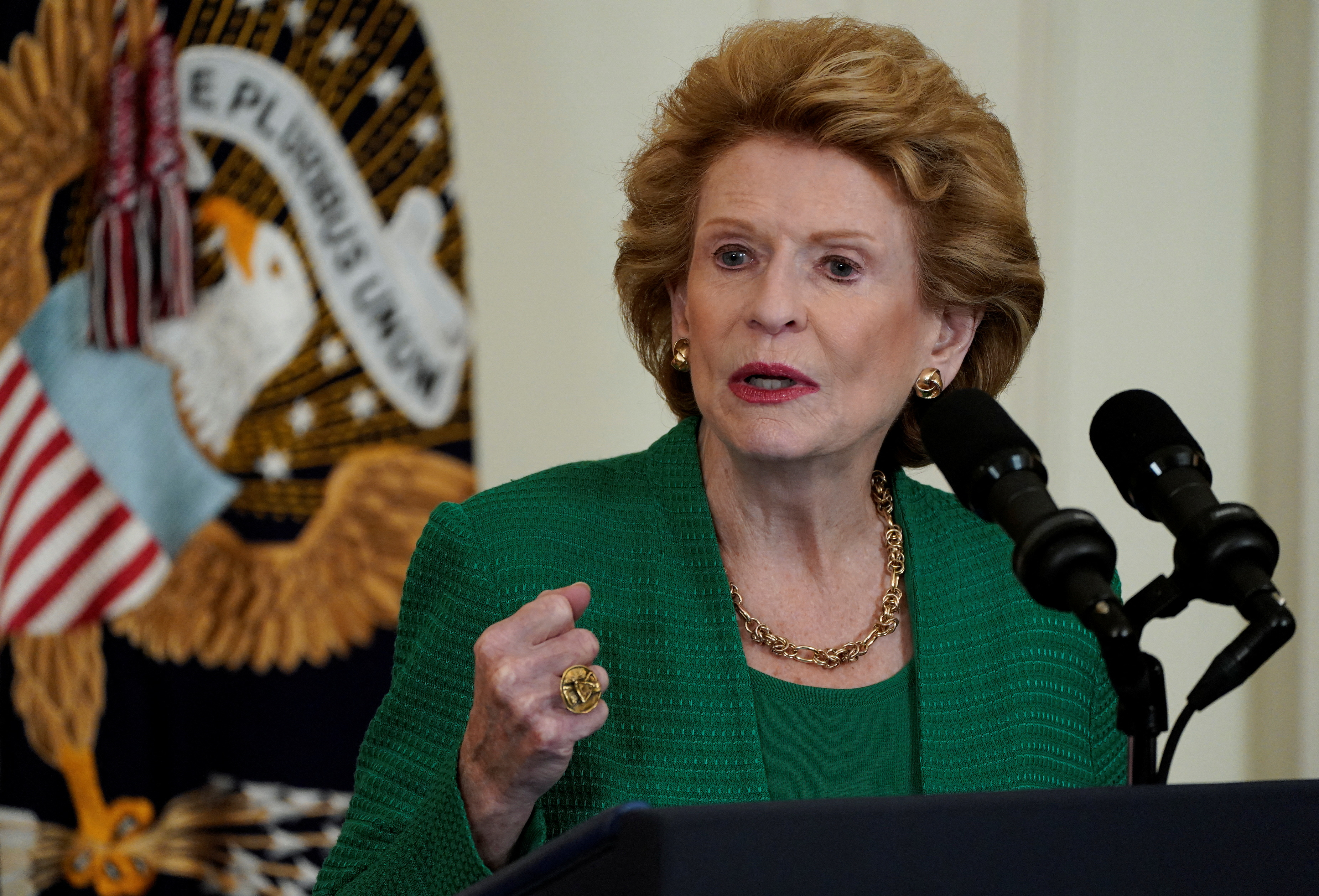 美国参议员黛比·斯坦伯诺(D-MI)在白宫东厅举行的一次活动中发言,当天美国总统乔·拜登在华盛顿就心理健康护理问题发表讲话,摄于2023年7月25日。路透社/伊丽莎白·弗兰茨