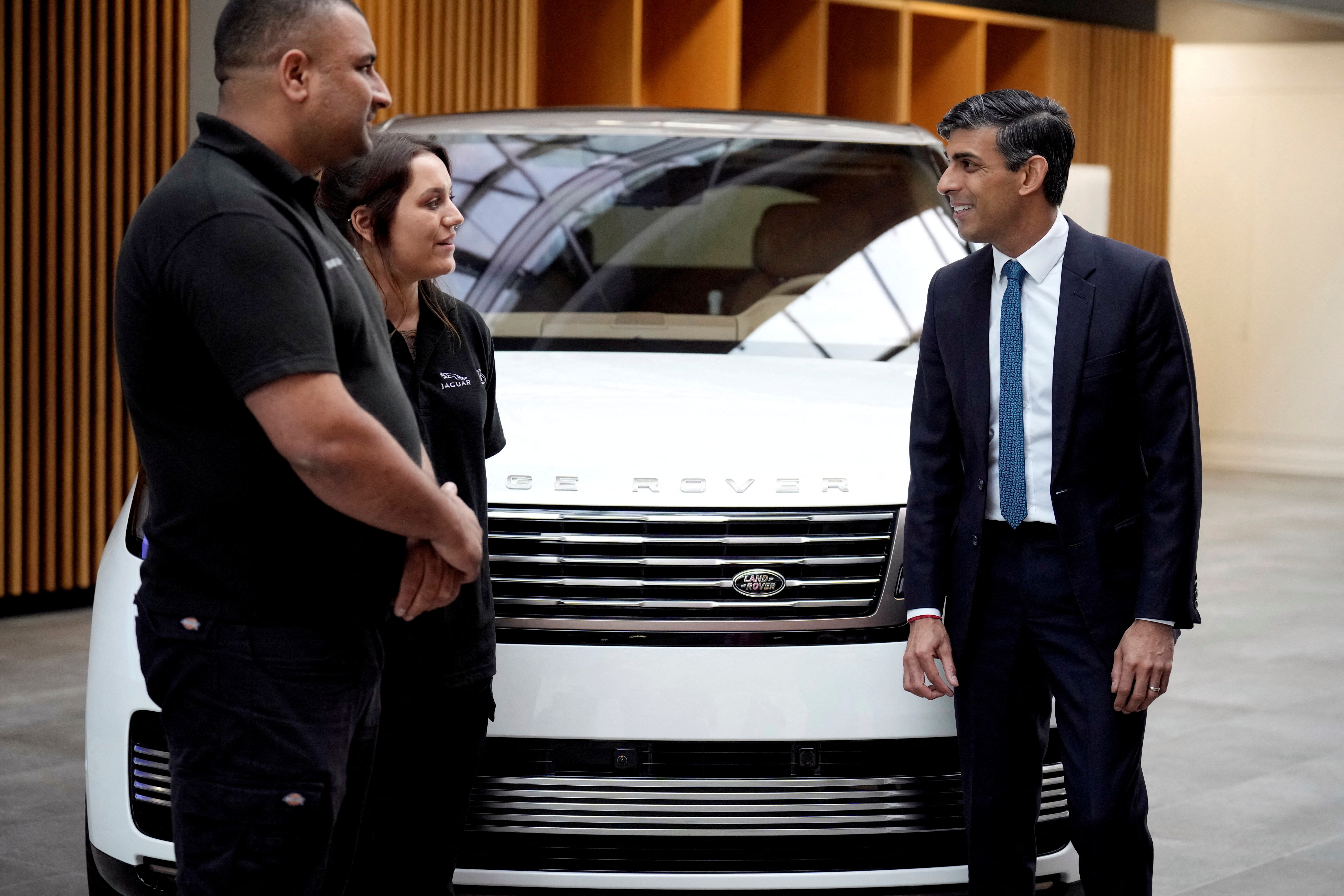英国首相里希·苏纳克出席2023年7月19日在英格兰沃里克举行的路虎工厂新电动汽车电池工厂公告的现场总览。克里斯托弗·弗隆/路透社/文件照片
