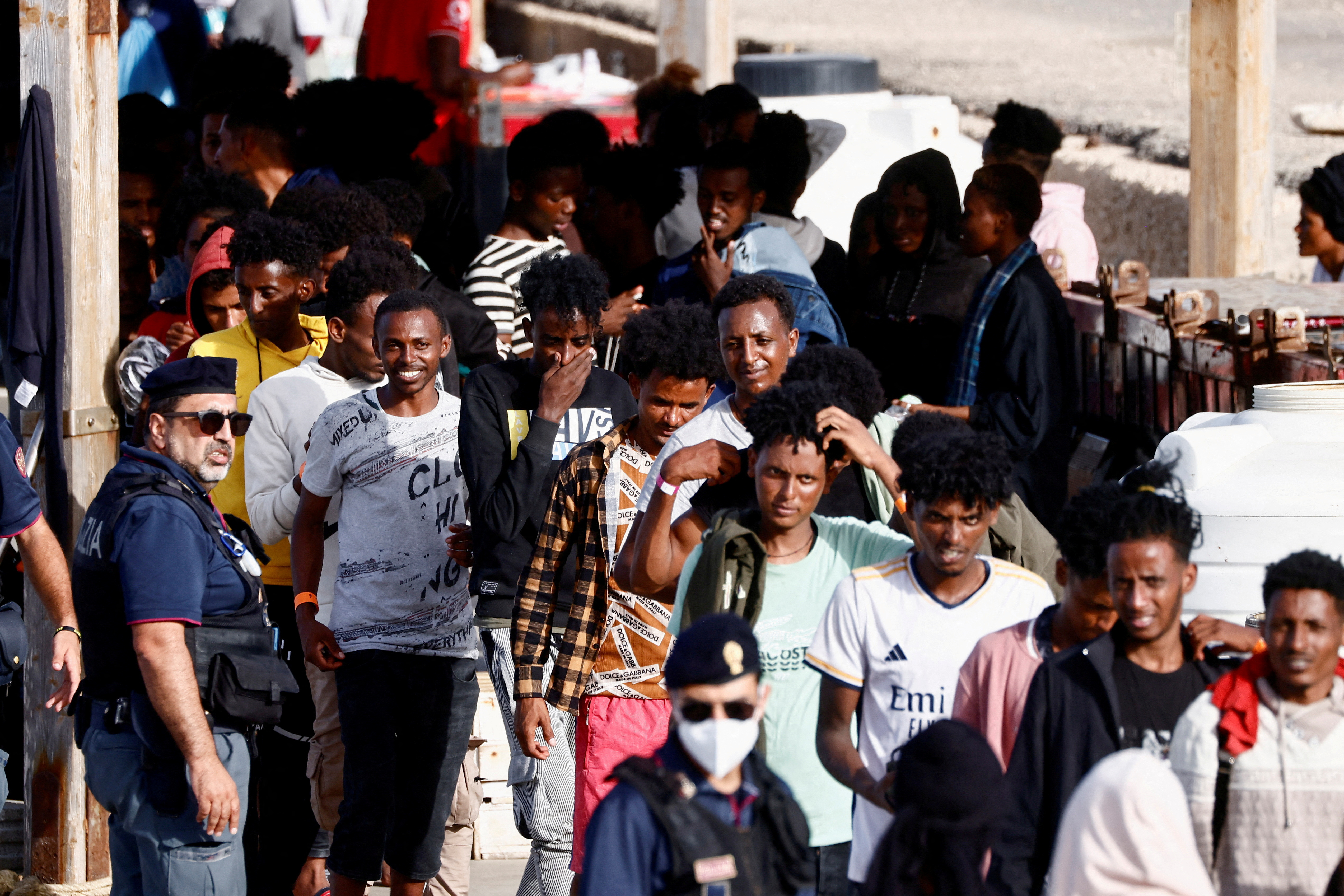 被海上营救的移民在从一艘船上下来后行走,摄于2023年9月18日,意大利西西里岛兰佩杜萨。路透社/雅拉·纳尔迪/档案照片