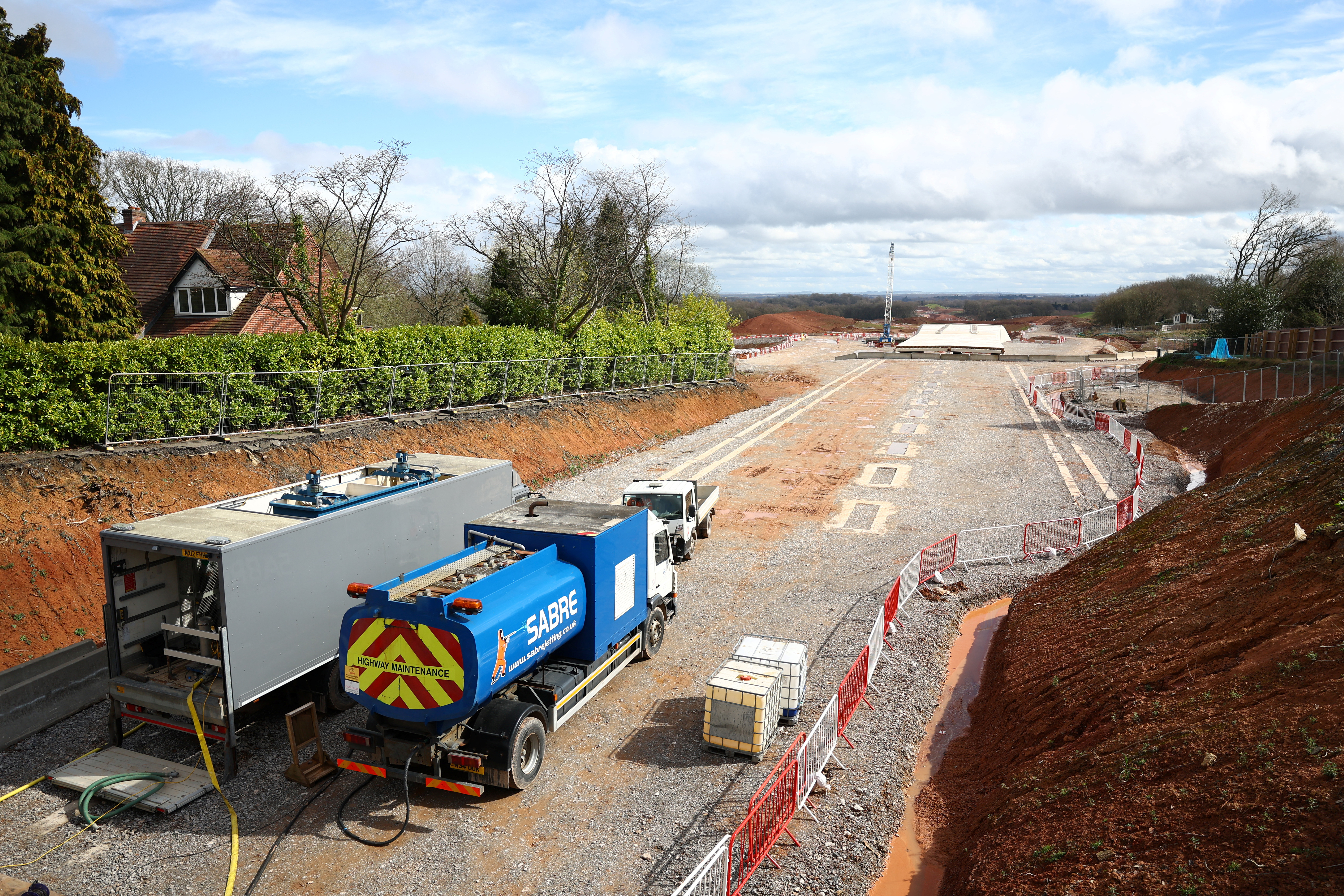 目前正在进行伦敦-伯明翰段的施工,机器正在地下隧道中钻孔,新桥正在建造,大量混凝土正在生产。