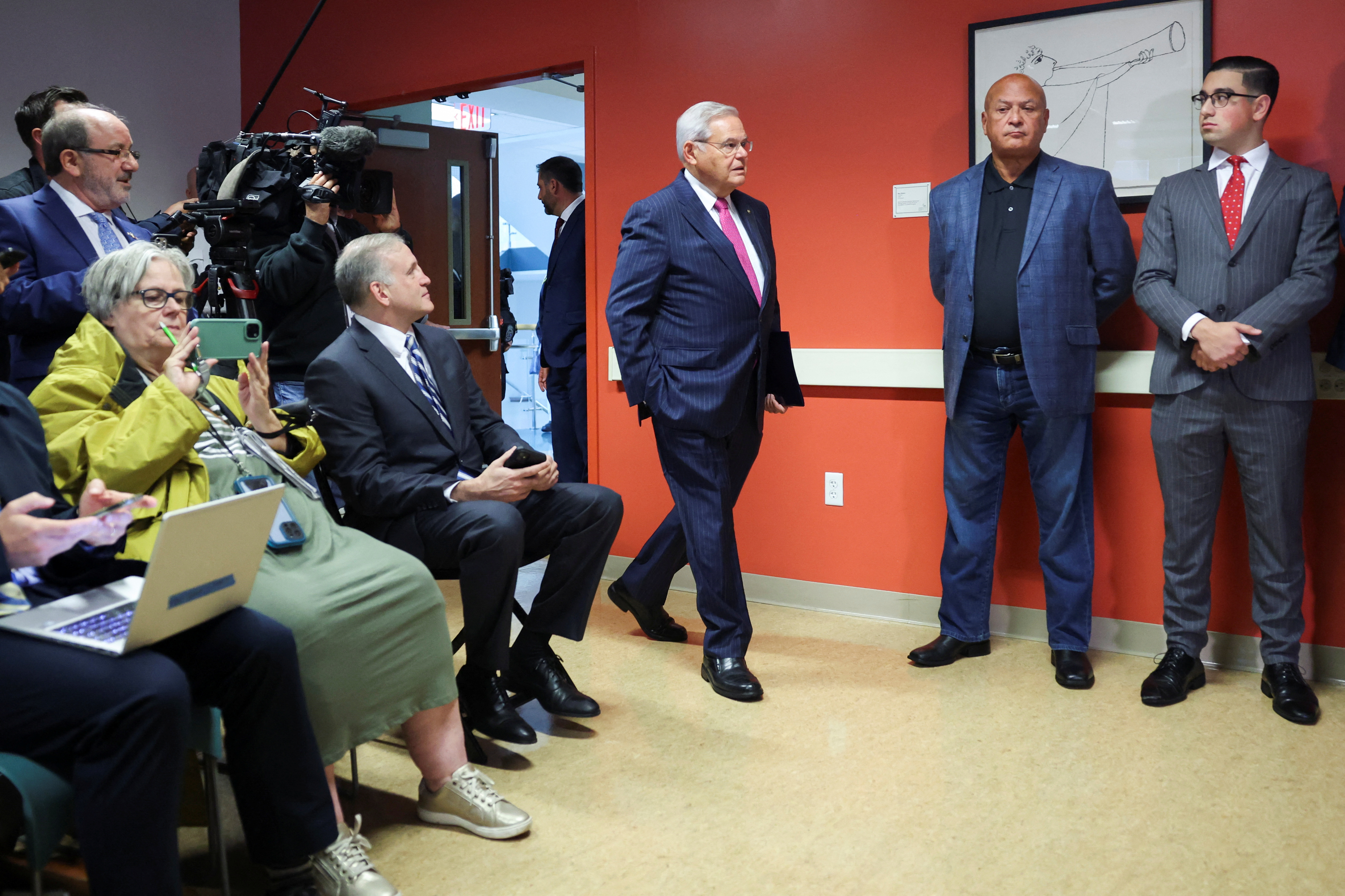 美国参议员罗伯特·梅南德斯(新泽西州民主党)在新泽西州联合城市因与三名新泽西商人的腐败关系而被控行贿罪,他和妻子纳丁·梅南德斯在2023年9月25日发表讲话。路透社/Mike Segar摄