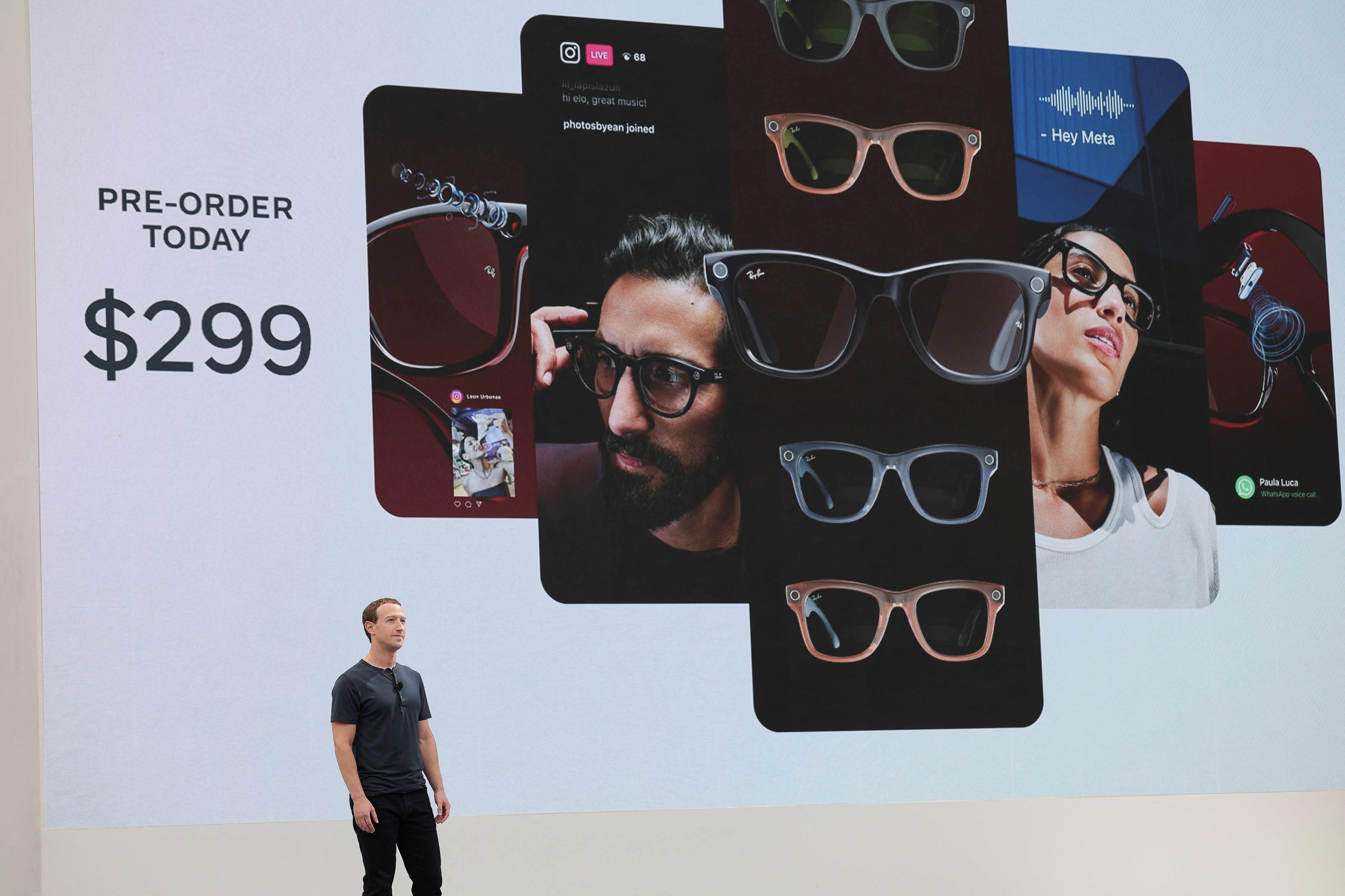 扎克伯格在Meta硅谷总部的中央庭院发表讲话,称Meta的新一代Ray-Ban(ESLX.PA)智能眼镜将于10月17日开始发货,售价为299美元。