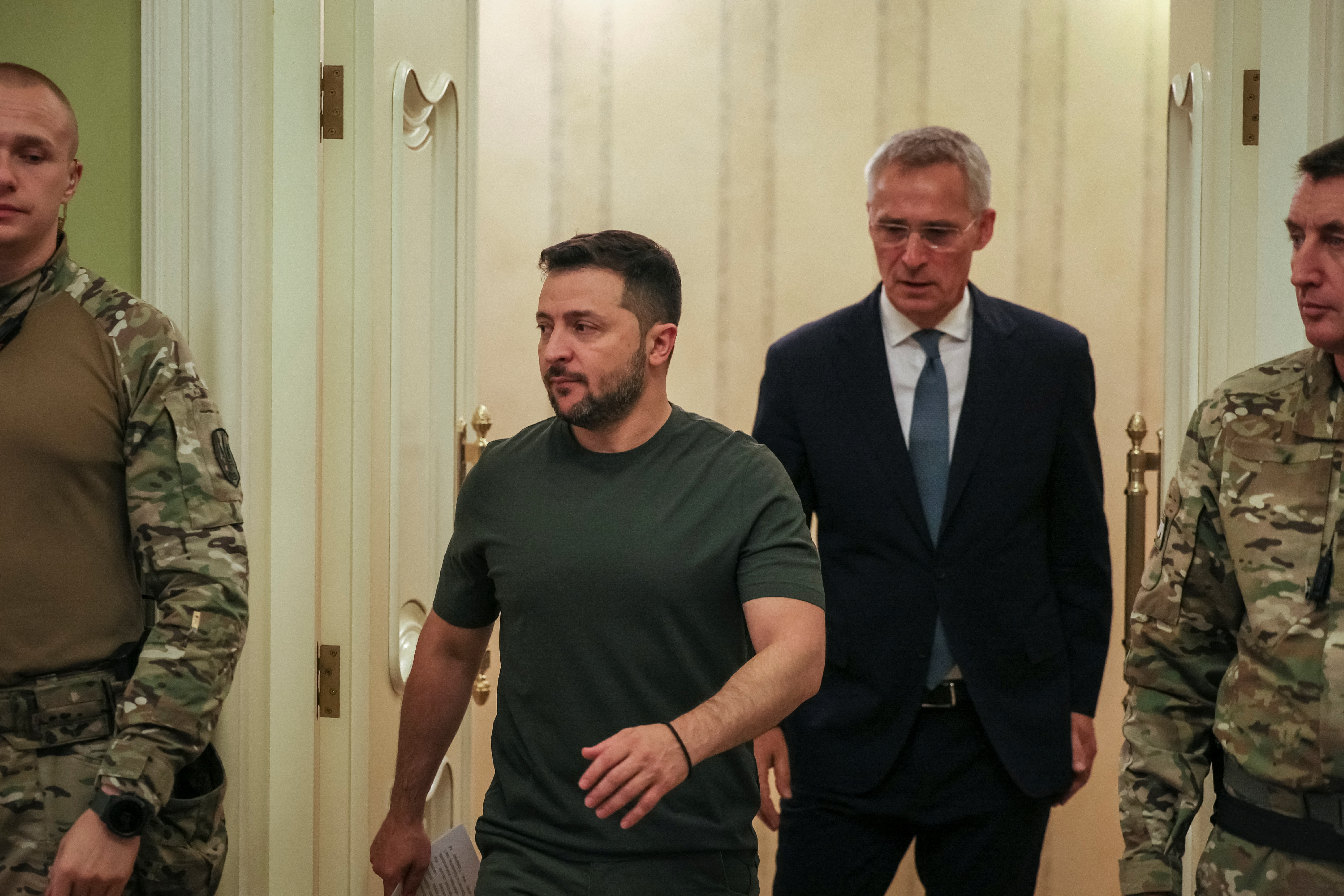 乌克兰总统沃洛迪米尔·泽连斯基与北约秘书长延斯·斯托尔滕贝格会晤,俄罗斯对乌克兰的攻击仍在继续,2023年9月28日,基辅,乌克兰。路透社/Gleb Garanich