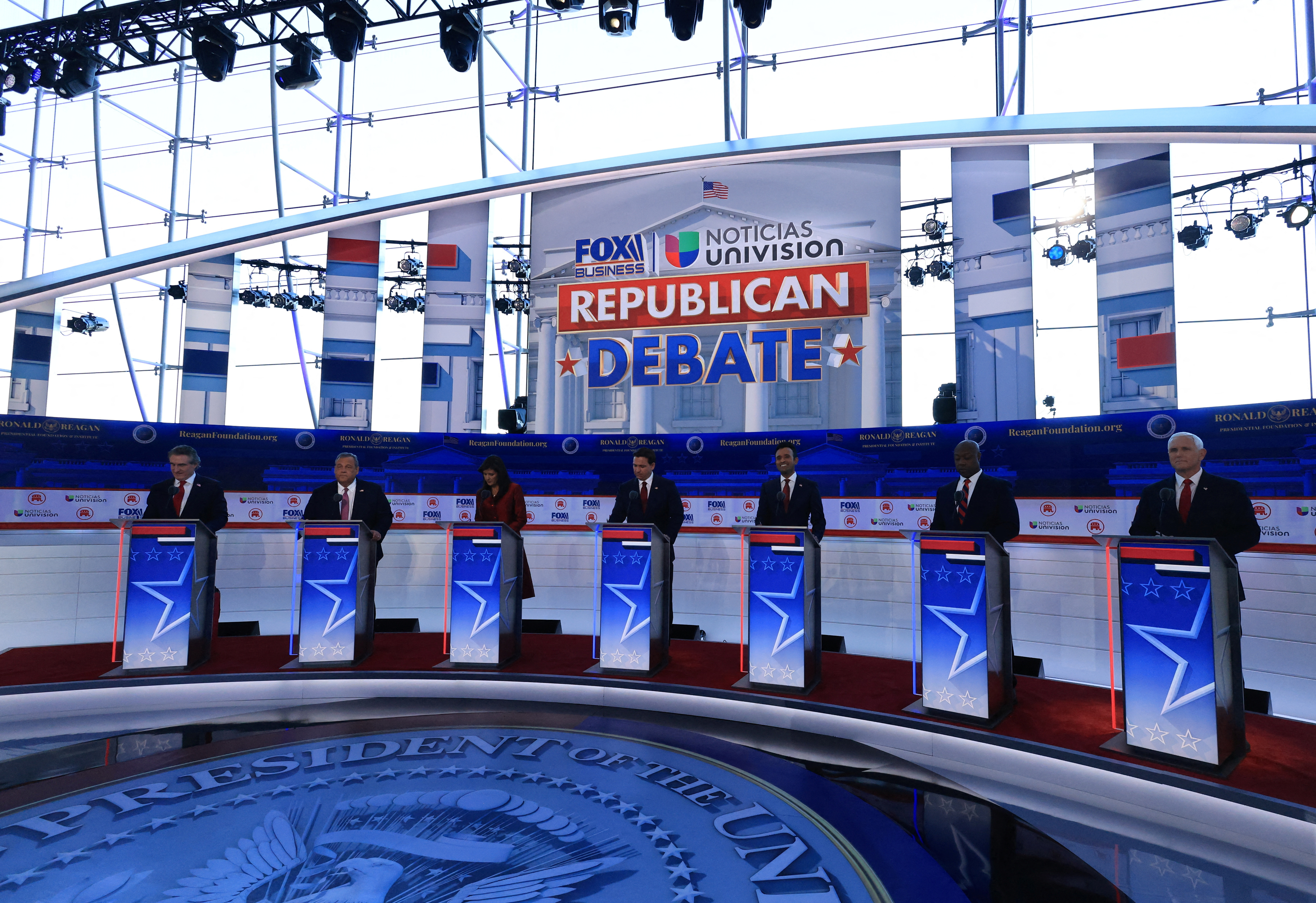 北达科他州州长道格·伯格姆、前新泽西州州长克里斯·克里斯蒂、前南卡罗来纳州州长妮基·黑利、佛罗里达州州长罗恩·德桑蒂斯、前生物技术执行官维韦克·拉马斯瓦米、美国参议员蒂姆·斯科特(来自南卡罗来纳州)和前美国副总统迈克·彭斯在第二场共和党候选人辩论开始时合影… 阅读更多
