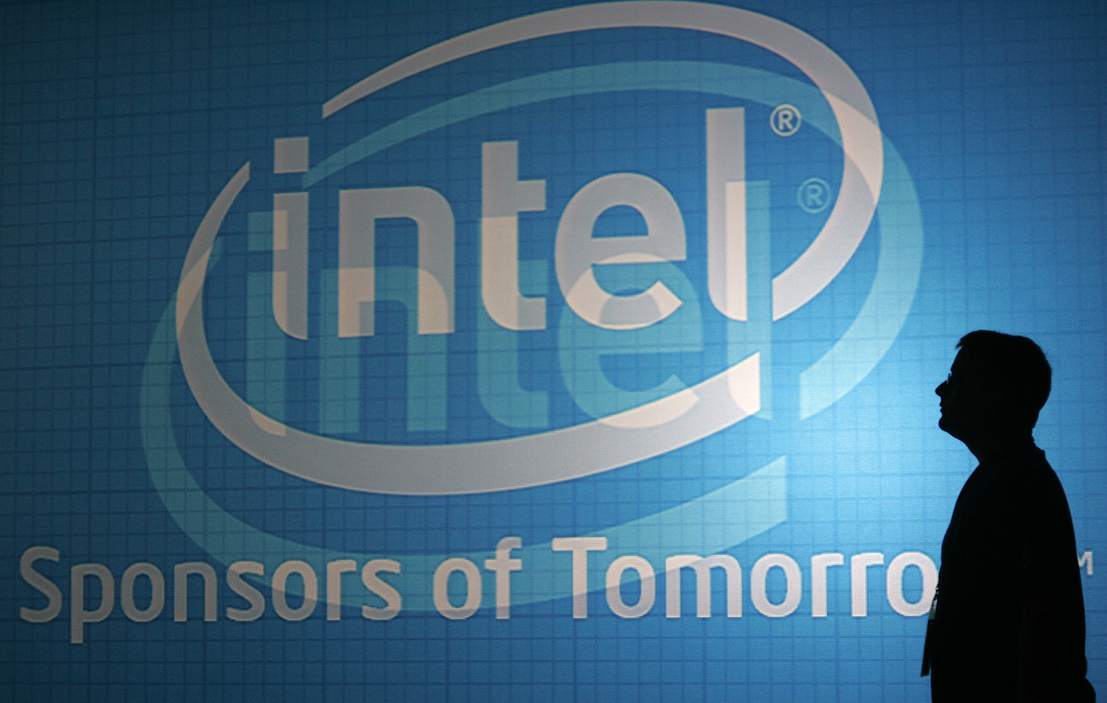 一个男人走过2009年6月3日在台北举行的Computex展览会上的英特尔墙。电子公司本周在台湾的Computex展览会上展示他们的最新小工具,因为他们旨在诱使对在全球经济衰退中谨慎支出的买家。路透社/派奇·创