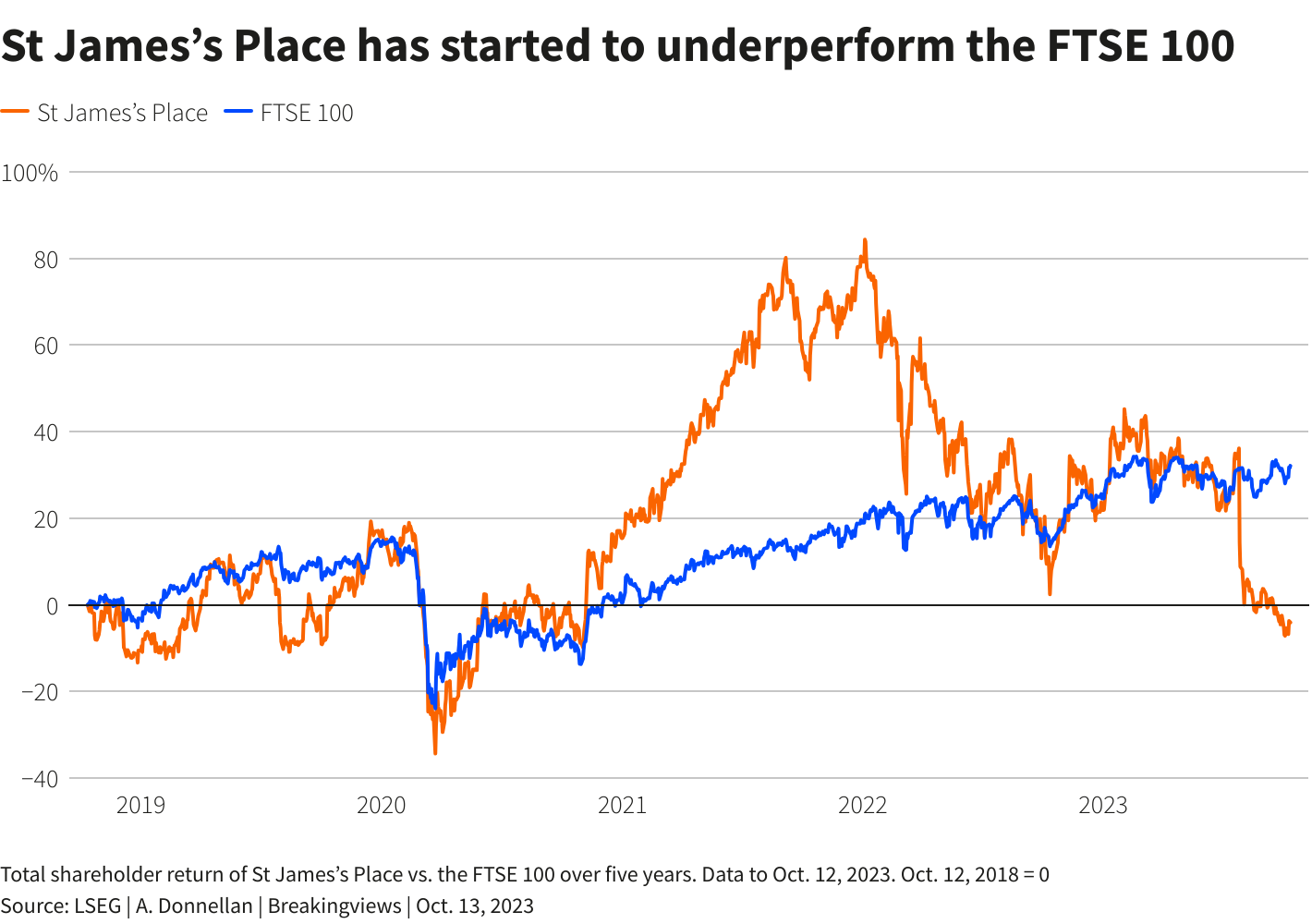 伦敦,10月13日(路透社Breakingviews) - 圣詹姆斯广场(SJP.L)处境棘手。全球的财富管理人员发现随着英国等国家的利率超过5%,他们越来越难以证明自己的费用合理。周五这家价值40亿英镑的英国财富管理公司股价暴跌16%,反映了它在这一趋势上的困境。