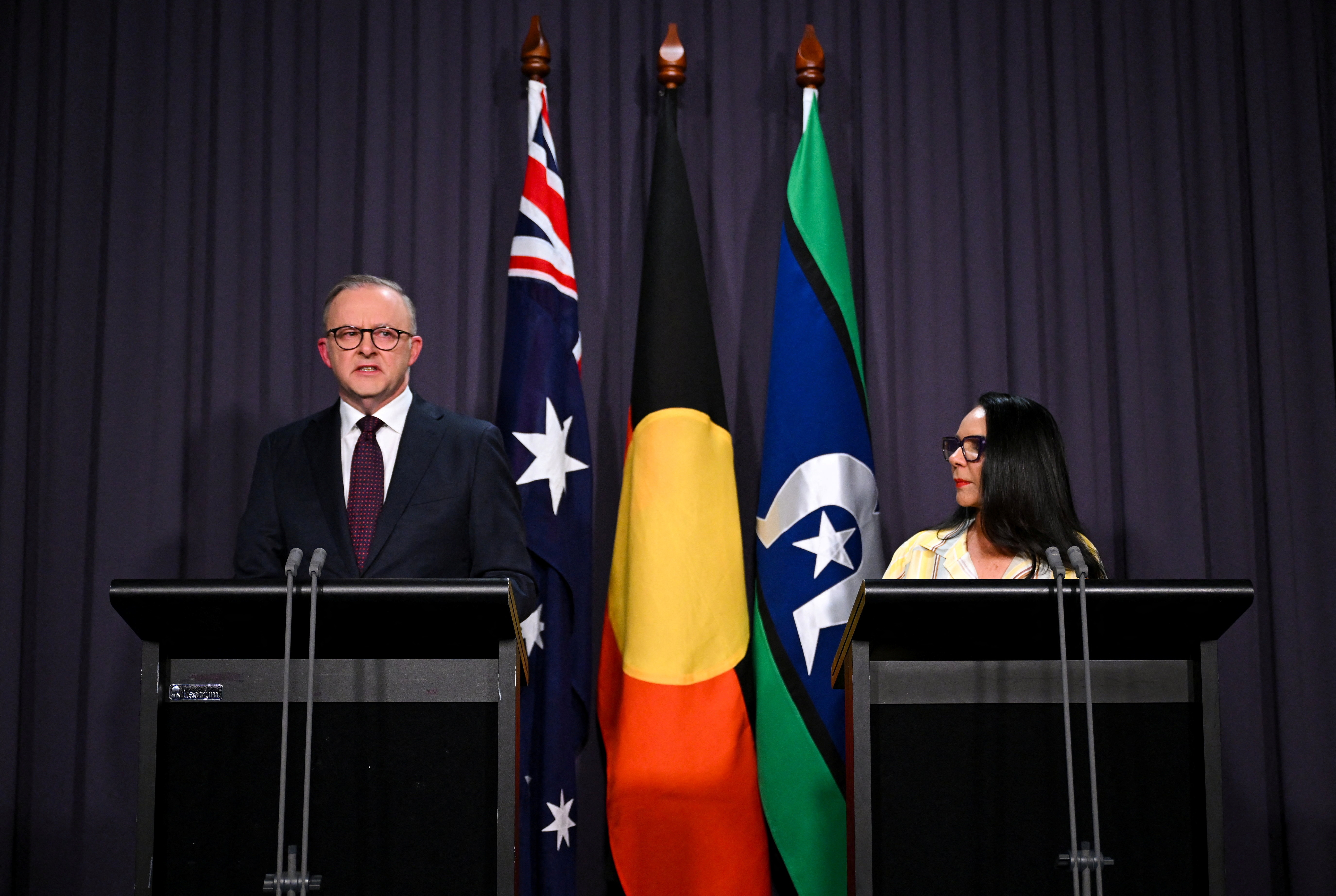 澳大利亚总理安东尼·阿尔巴尼斯和土著澳大利亚人事务部长琳达·伯尼在2023年10月14日在堪培拉国会大厦就“心声公投”的结果发表声明后离开。澳大利亚新闻社图片/Mick Tsikas通过路透社