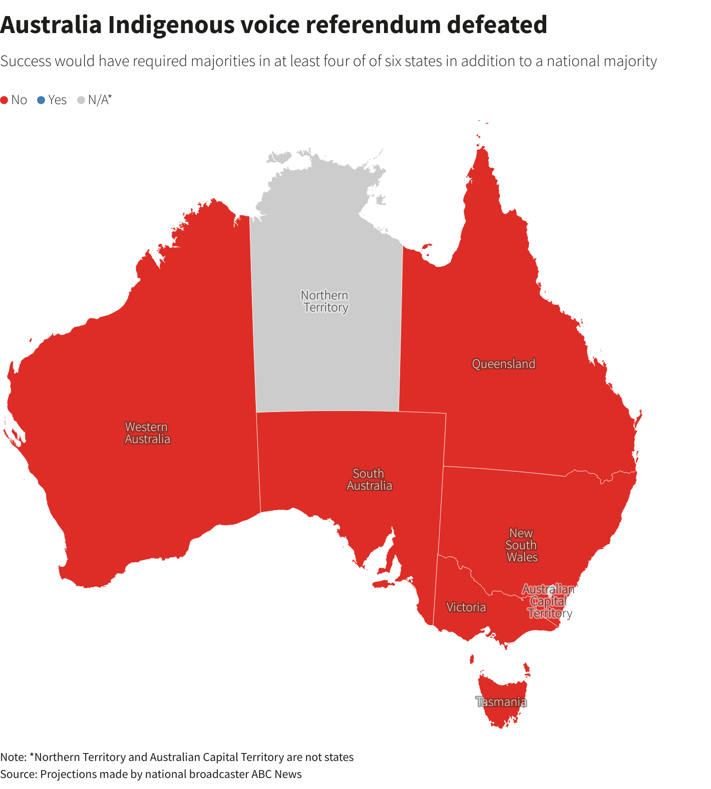 全国范围内,几乎有70%的选票已经计算完毕,“否”票领先“是”票60%至40%。澳大利亚广播公司ABC和其他电视网络预测,澳大利亚六个州的大多数选民将投票反对修改已有122年历史的宪法。