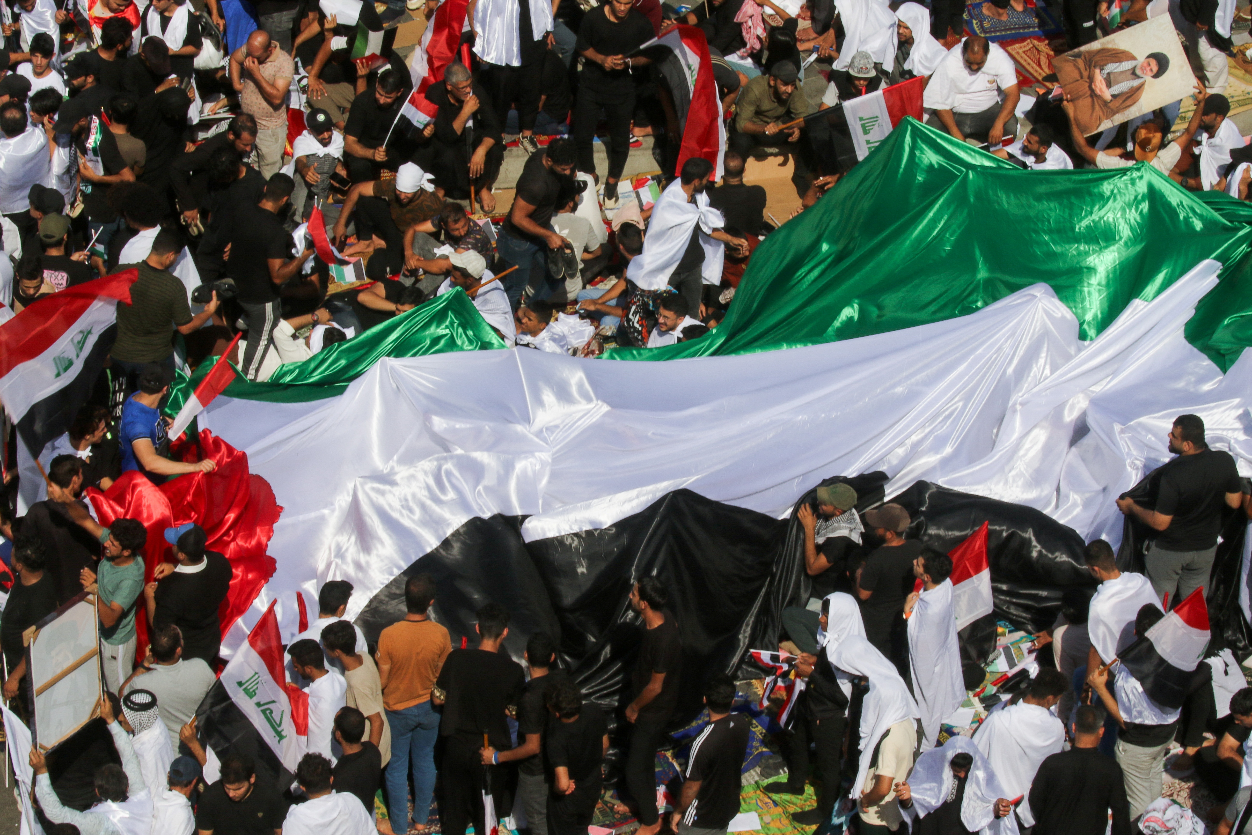 伊拉克什叶派教士穆克塔达·萨德尔的支持者在巴格达举行抗议活动,支持巴勒斯坦加沙地区,2023年10月13日,伊拉克。路透社/萨巴·卡里姆