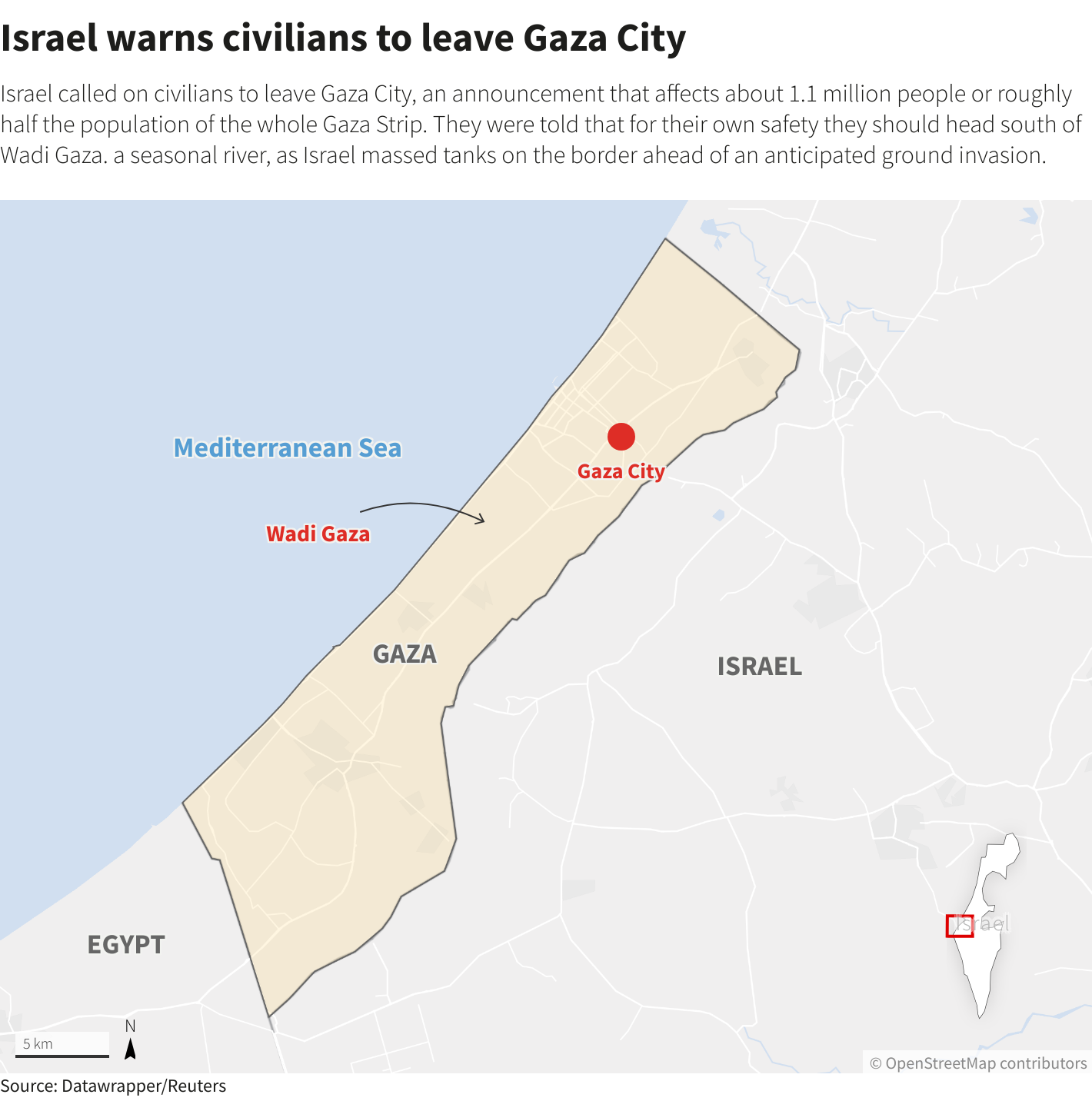 周五,以色列军方告知加沙地带北部地区的居民,其中包括该地区最大的定居点加沙市,立即向南部转移。周六,军方表示将保证巴勒斯坦人在两条主要道路上逃离直到下午4:00(格林尼治时间1300)。随着最后期限的到来,军队正集结在加沙周围。