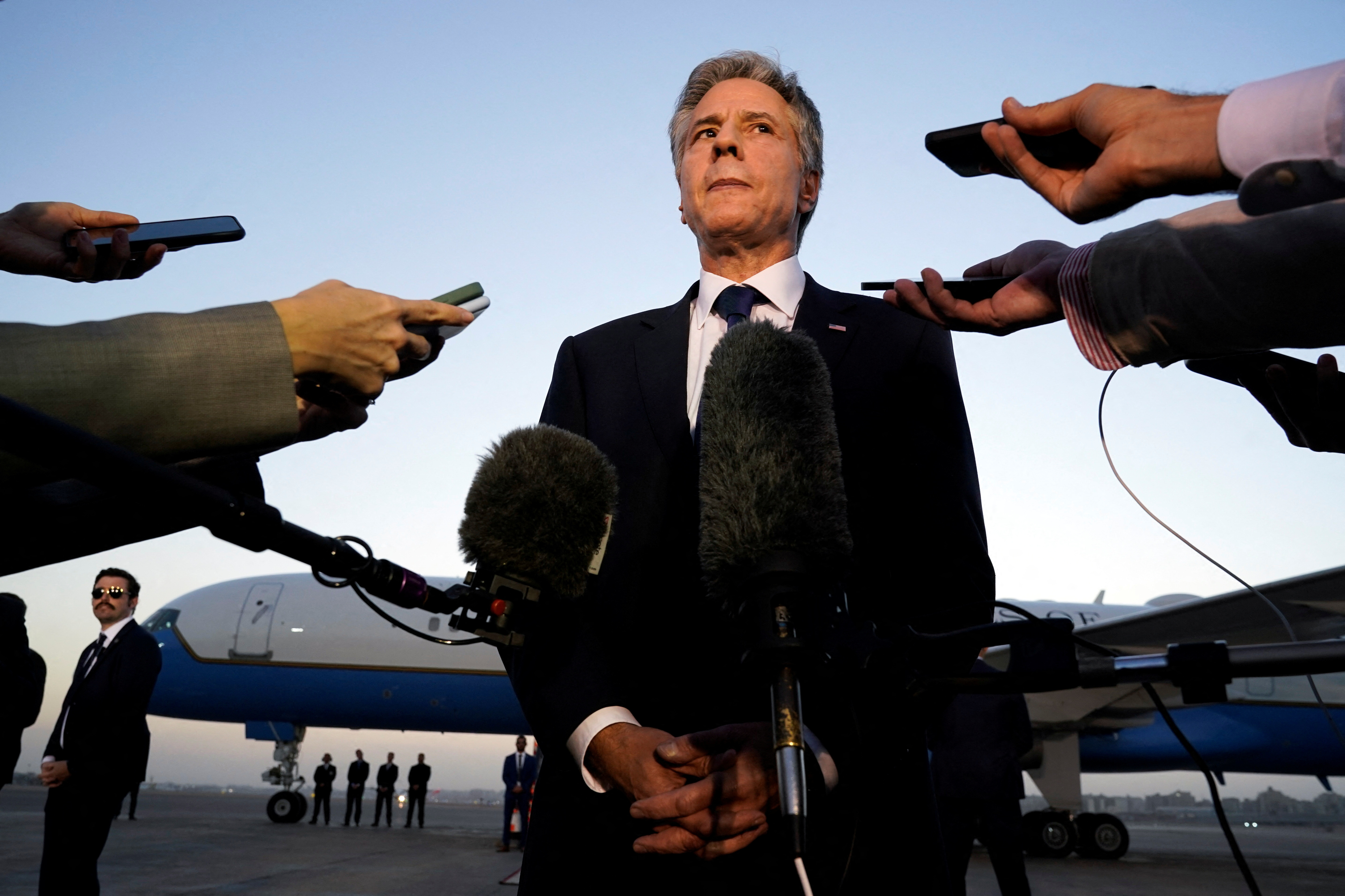 美国国务卿安东尼·布林肯在离开埃及前对媒体发表讲话,时间为2023年10月15日星期日,途径约旦。雅克琳·马丁/路透社摄