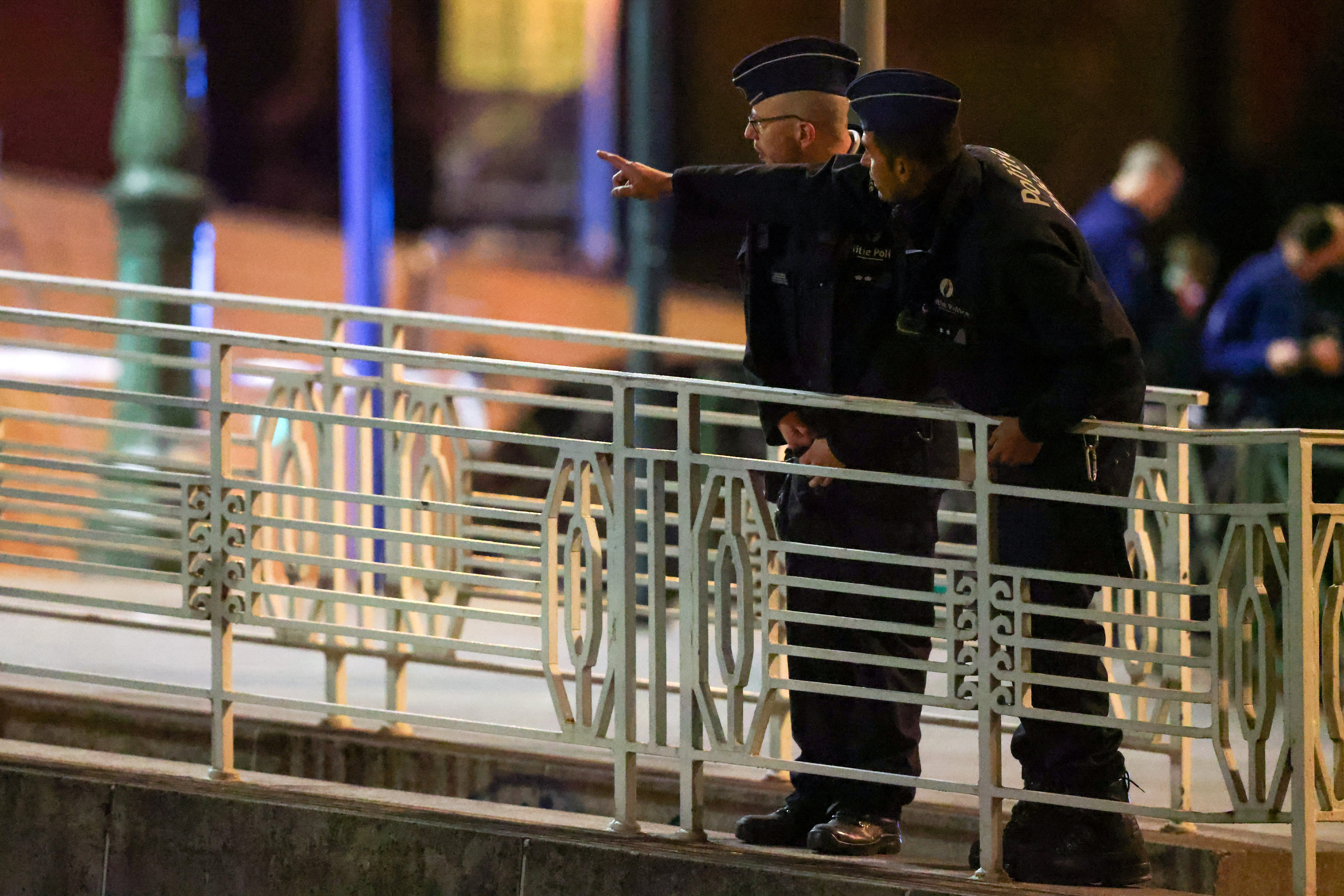 比利时警察在布鲁塞尔发生枪击事件后守卫着该地区,2023年10月16日。路透社/Johanna Geron