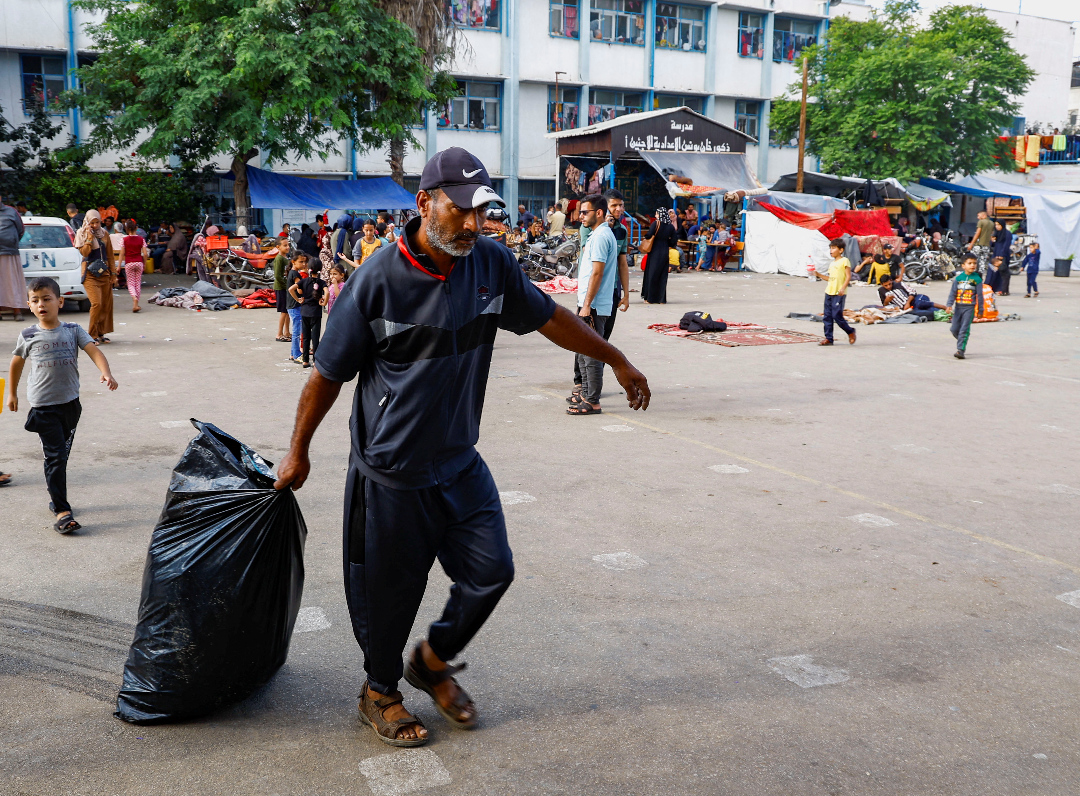 一名巴勒斯坦人在加沙南部污水处理厂拖着一个垃圾袋,2023年10月16日。路透社/莫哈迈德·塞勒姆摄
