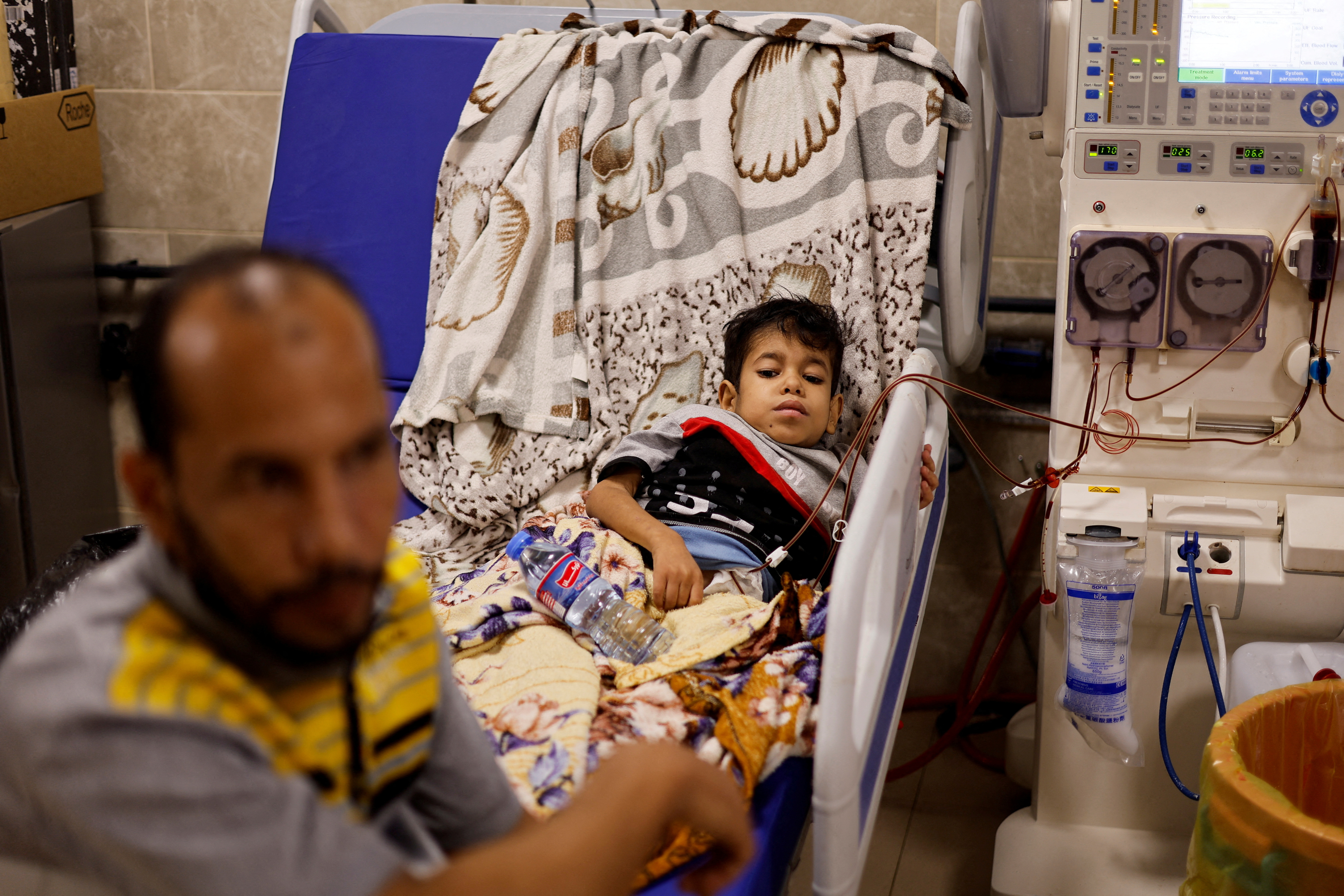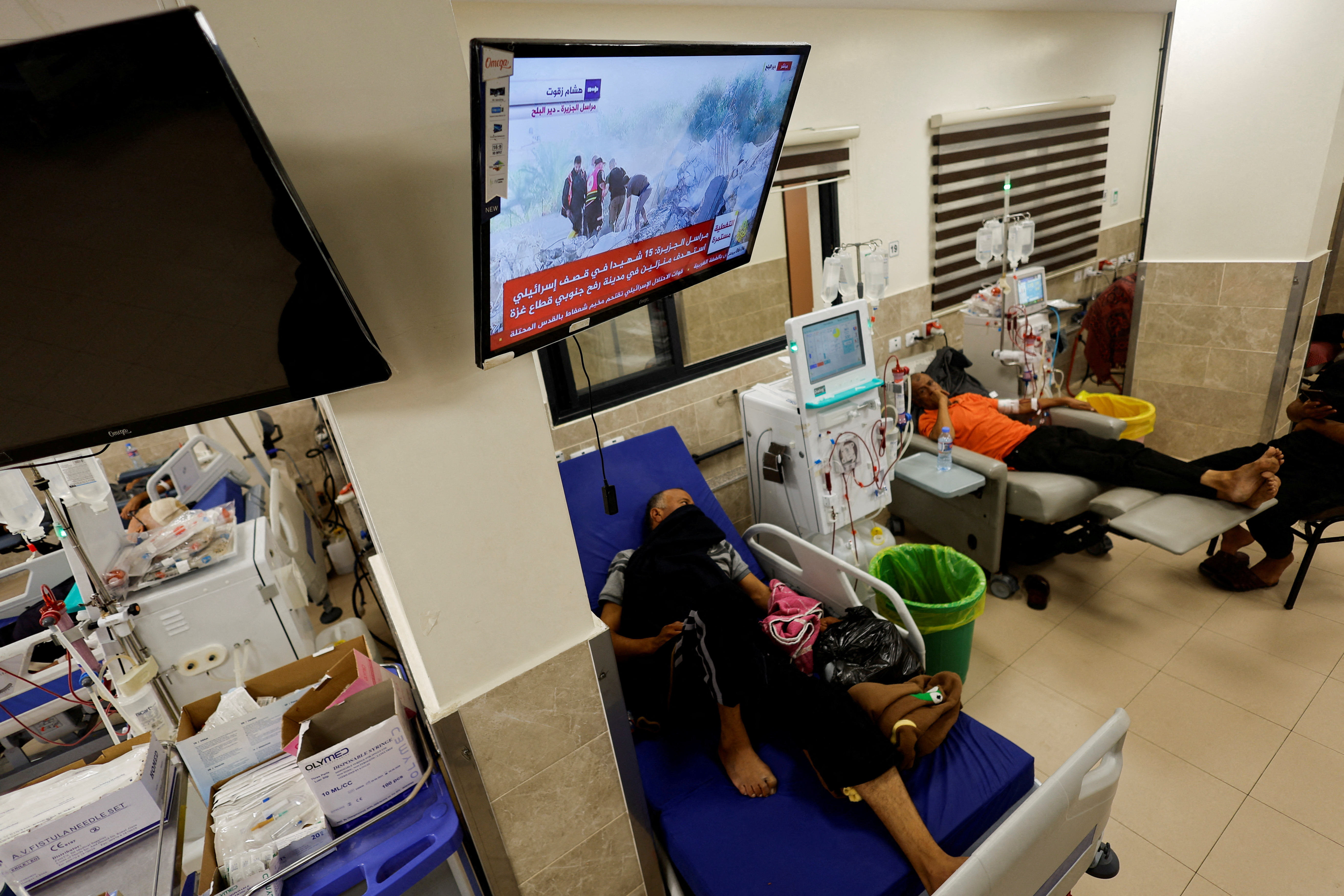 巴勒斯坦肾病患者躺在医院病床上,卫生官员表示,他们的透析设备因燃料短缺而无法运转,这是在持续的以色列-巴勒斯坦冲突中,2023年10月15日在加沙地带南部汗尤尼斯的纳赛尔医院拍摄的。路透社/穆罕默德·塞勒姆/文件照片