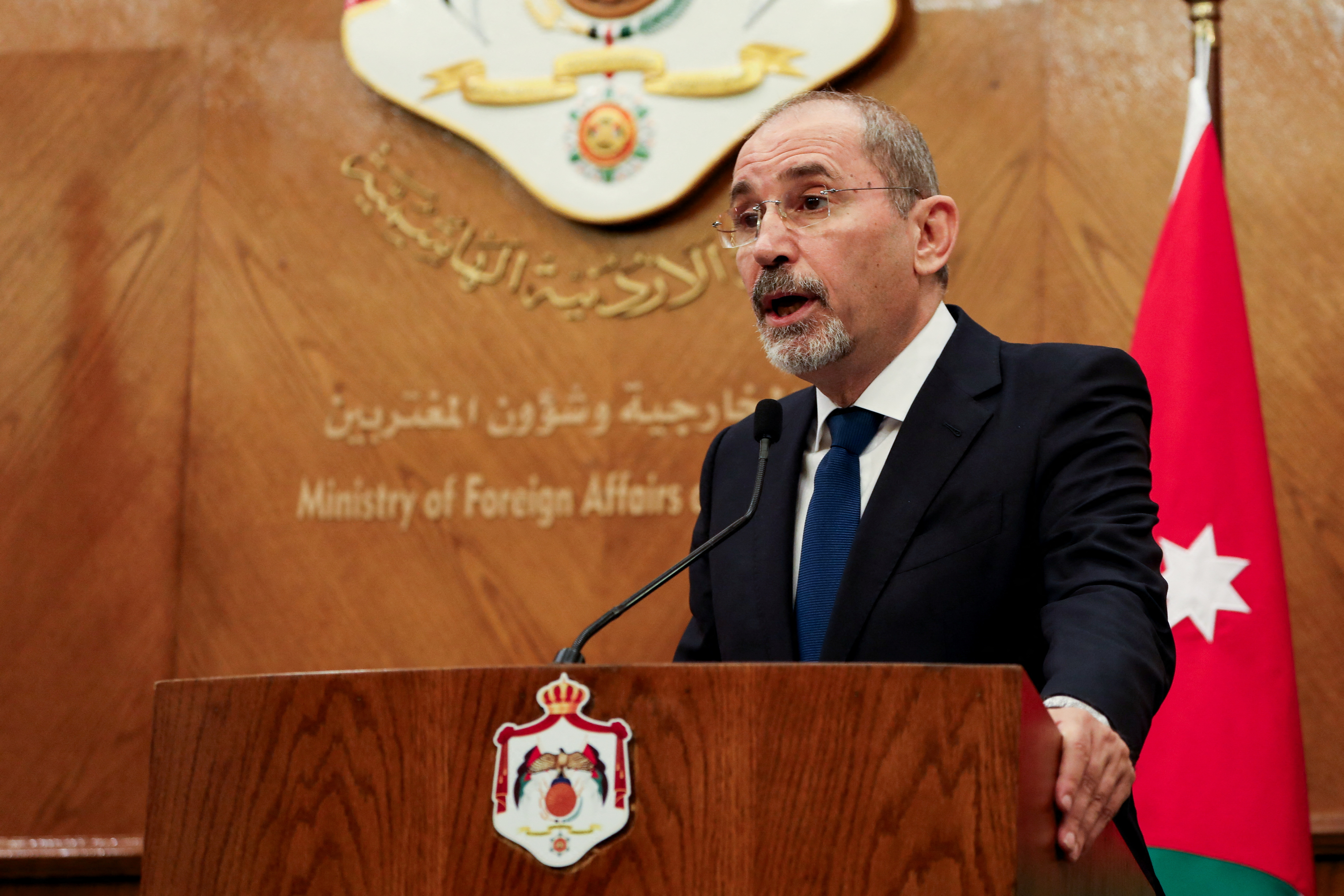约旦外交部长艾曼·萨法迪(Ayman Safadi)参加了与英国外交大臣詹姆斯·克莱弗利(James Cleverly)在安曼举行的联合新闻发布会,2023年7月27日。路透社/阿拉·阿尔苏克尼/文件照片
