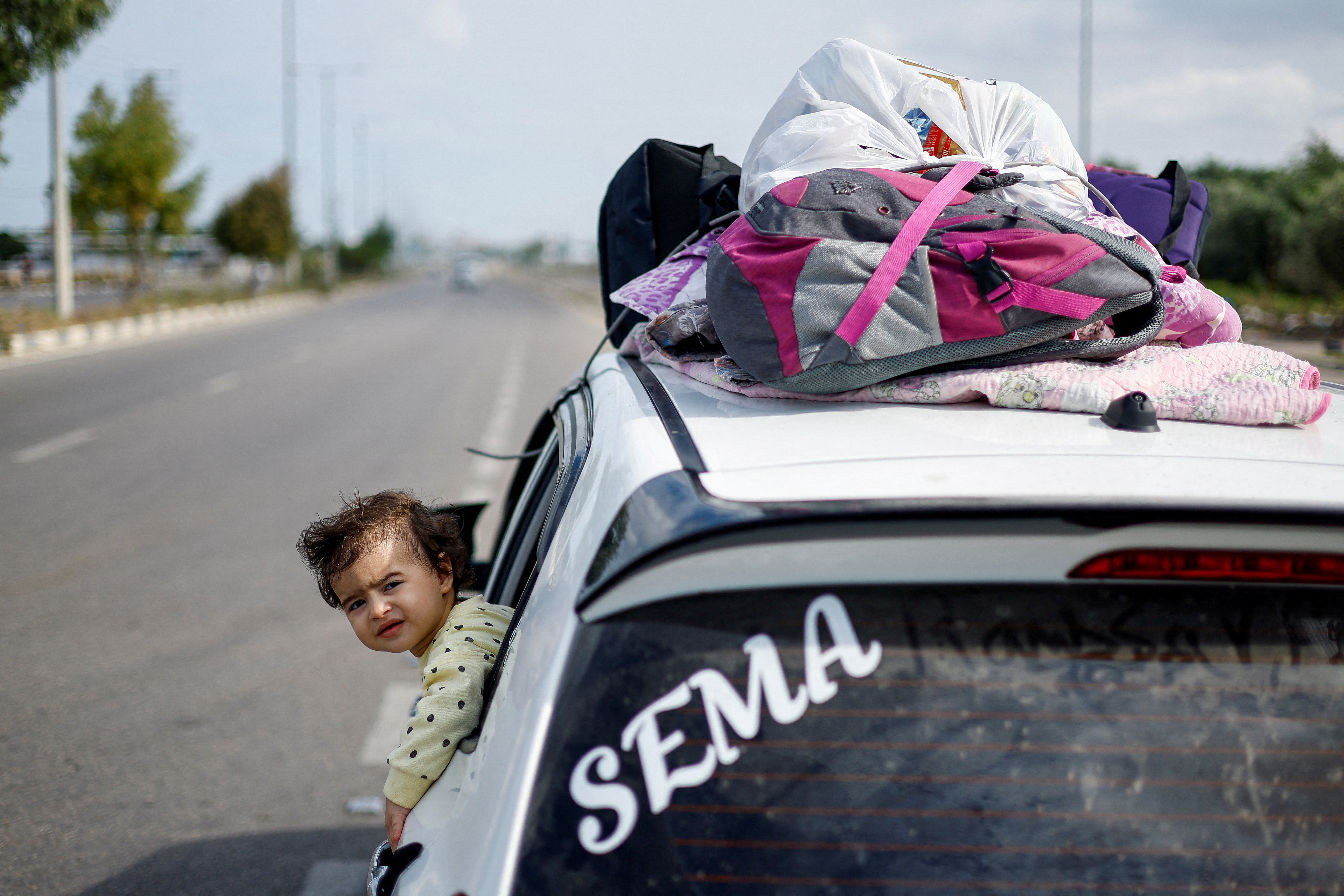 路透社记者在离开汗尤尼斯的路上看到,有几十辆车挤满了人和物品,向北方驶去。