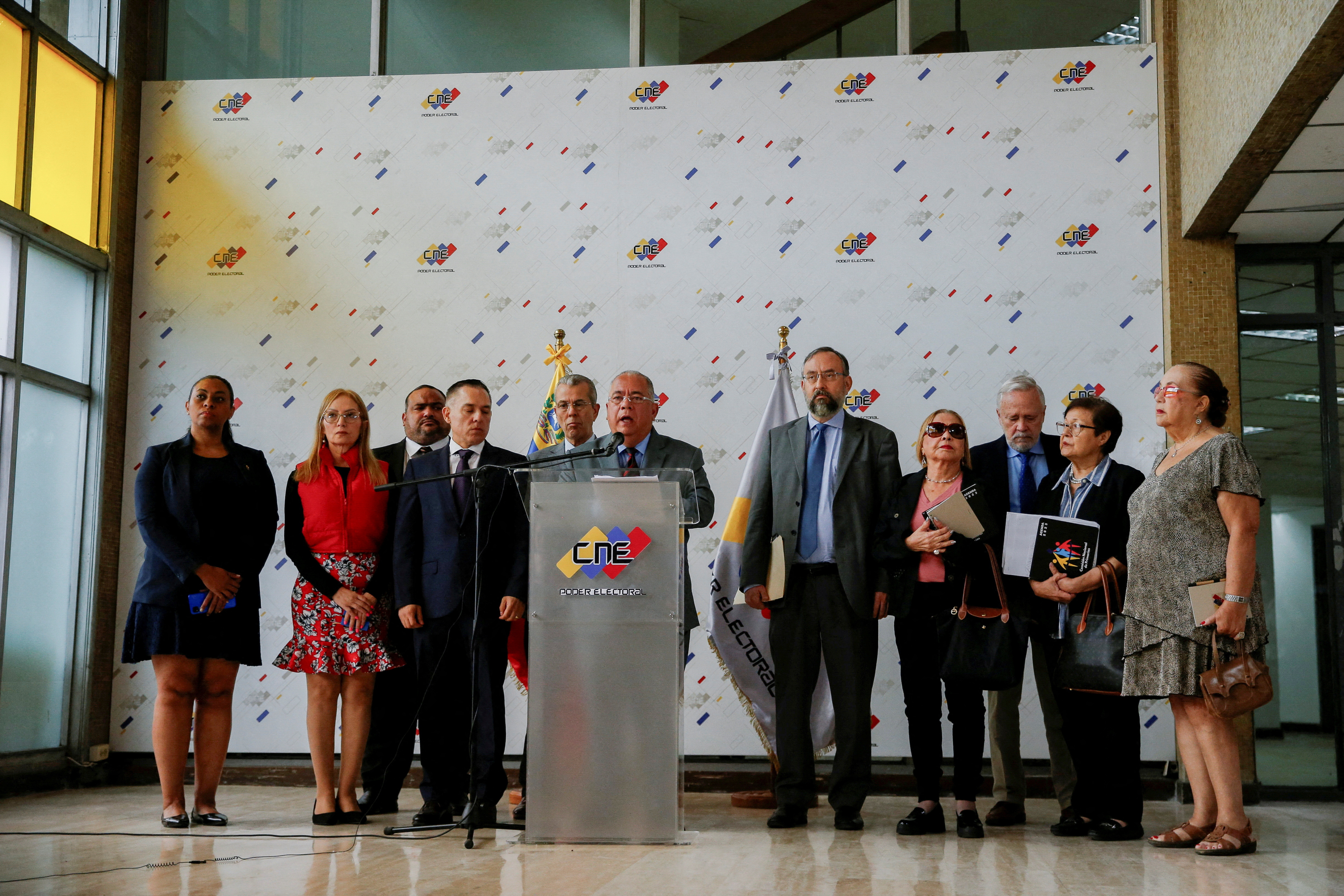 埃尔维斯·伊德罗博·阿莫罗索,委内瑞拉国家选举委员会(CNE)主席,在与委内瑞拉反对派全国初选委员会主席耶稣·玛利亚·卡萨尔在委内瑞拉加拉加斯举行会议后向媒体发表讲话,照片摄于2023年9月25日。路透社/莱昂纳多·费尔南德斯·维洛里亚/文件照片