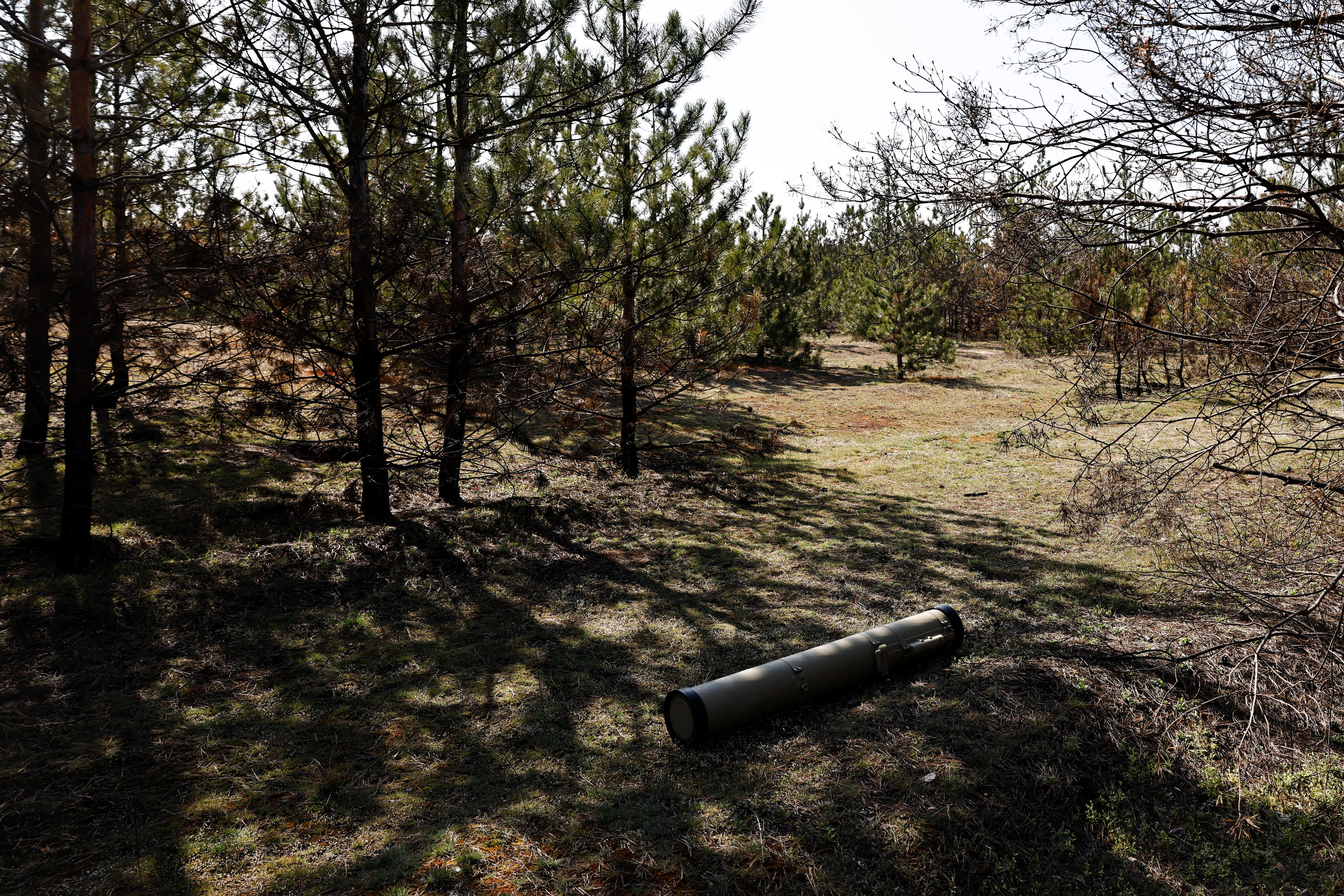 2023年3月26日,乌克兰士兵在俄罗斯入侵乌克兰期间,一枚乌克兰士兵使用的Kornet导弹弹头位于克雷米纳附近的树林中,卢甘斯克,乌克兰。路透社/Violeta Santos Moura/文件照片