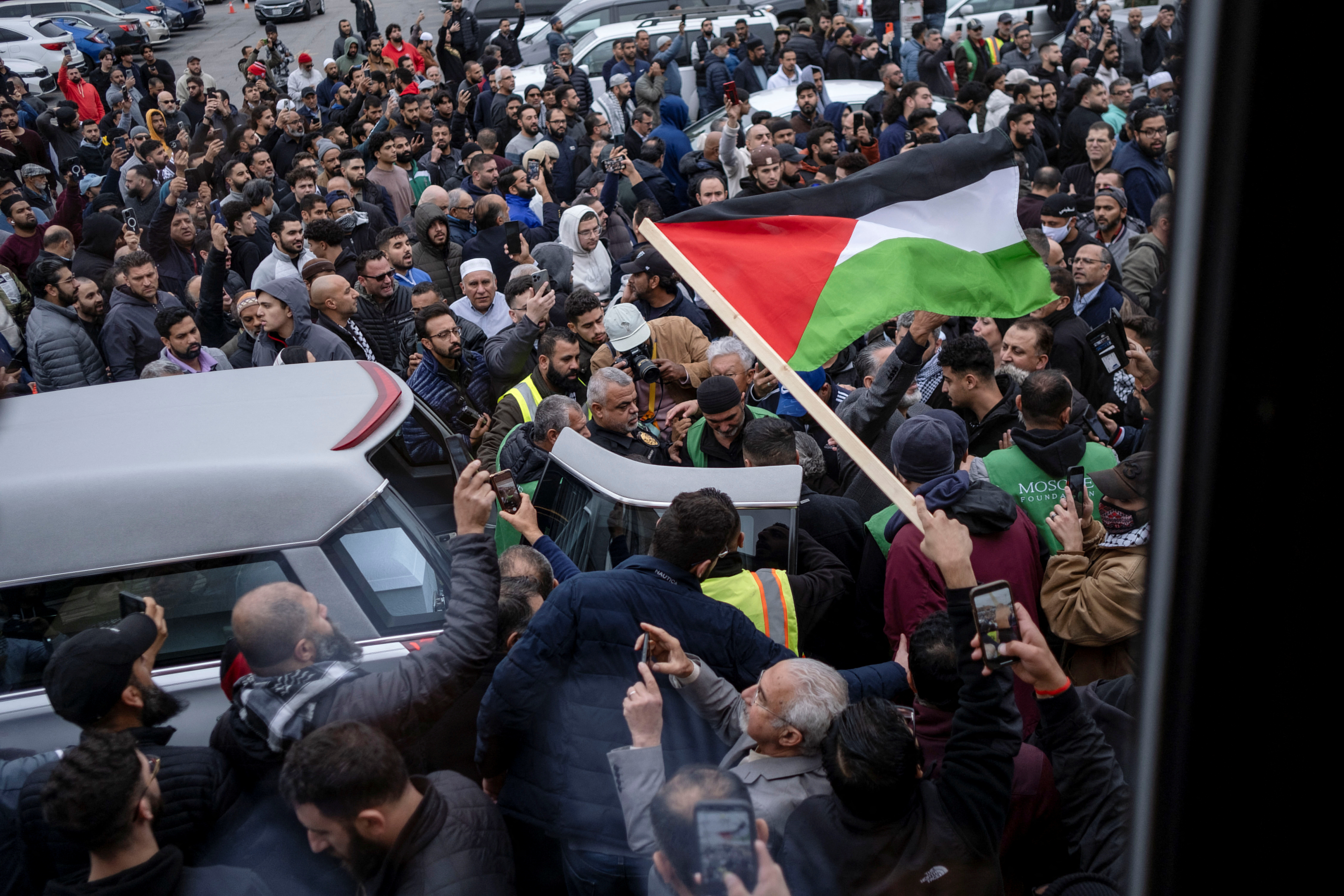 巴勒斯坦国旗挂在车窗上,车队开往清真寺,数字广告牌上写着:“停止煽动对巴勒斯坦、阿拉伯和穆斯林社区的暴力和仇恨。”