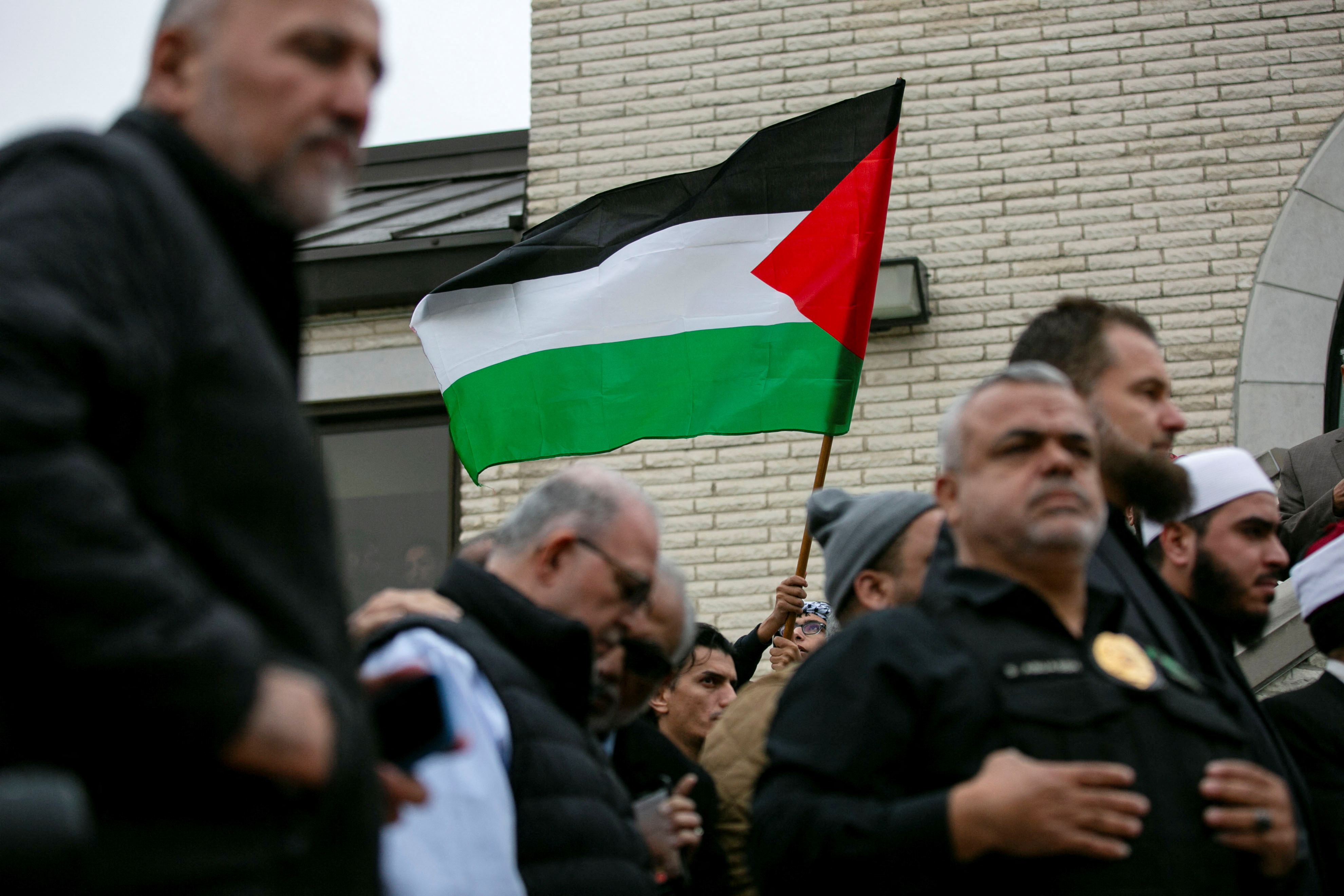 在清真寺的地下室,妇女和儿童聚集在一起哭泣,而外面,数十人围在演讲者周围,其中包括两名挥舞巴勒斯坦国旗的男子。哀悼者在葬礼现场高呼“自由巴勒斯坦”。