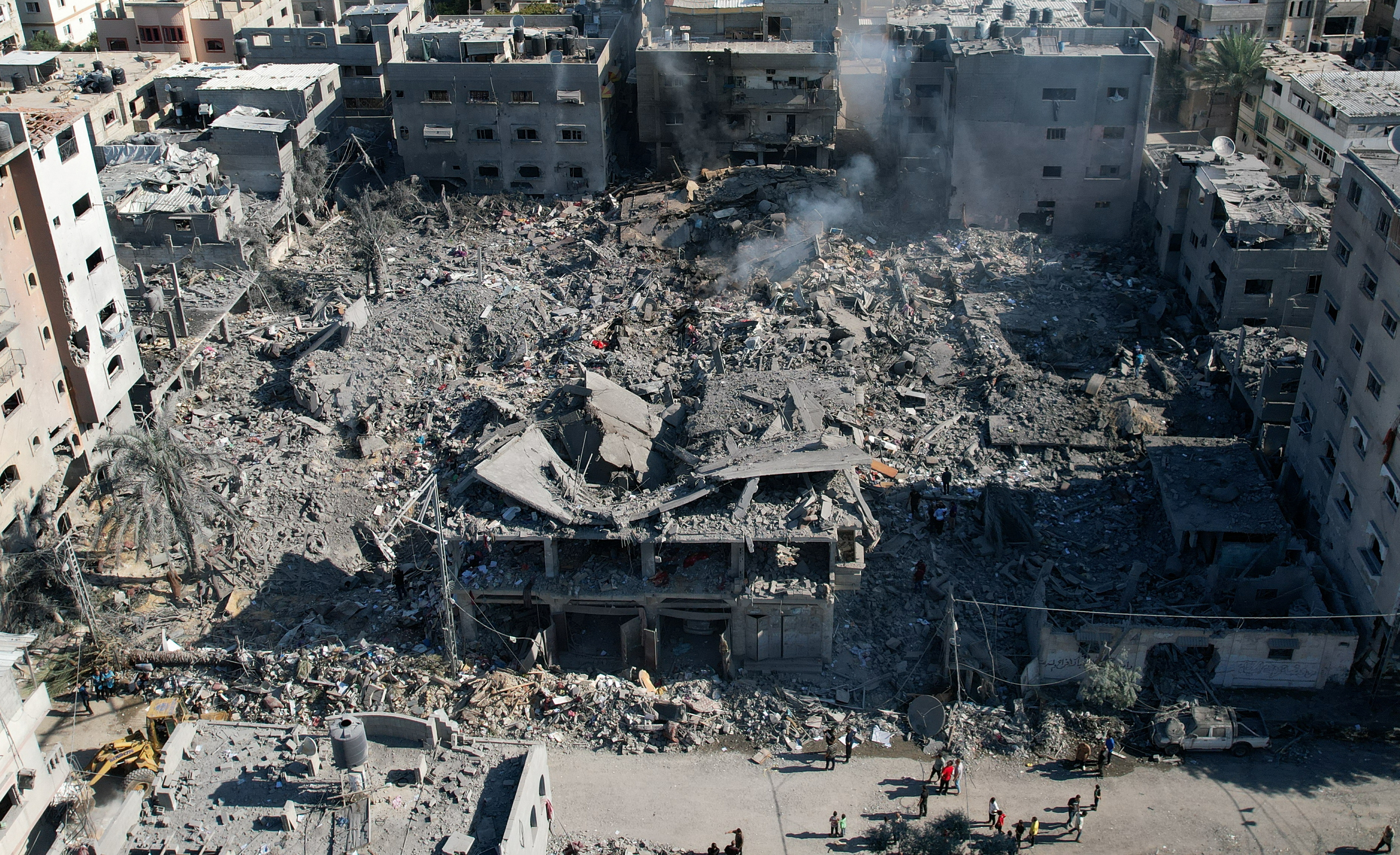 巴勒斯坦人在以色列呼吁加沙北部超过100万名平民南迁后,逃离他们的房屋,以色列空袭加沙南部的汗尤尼斯,2023年10月14日。路透社/穆罕默德·塞勒姆/文件照片