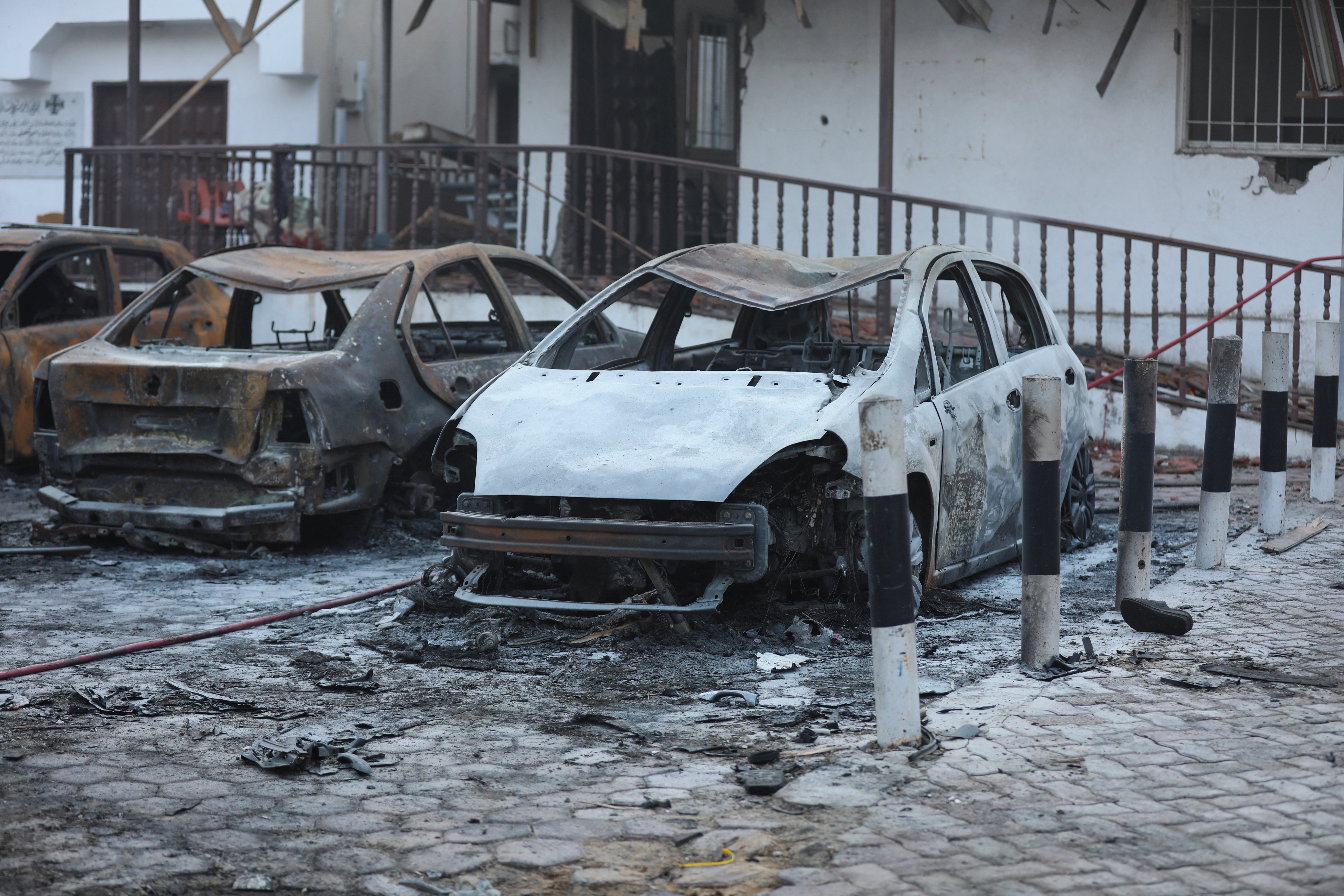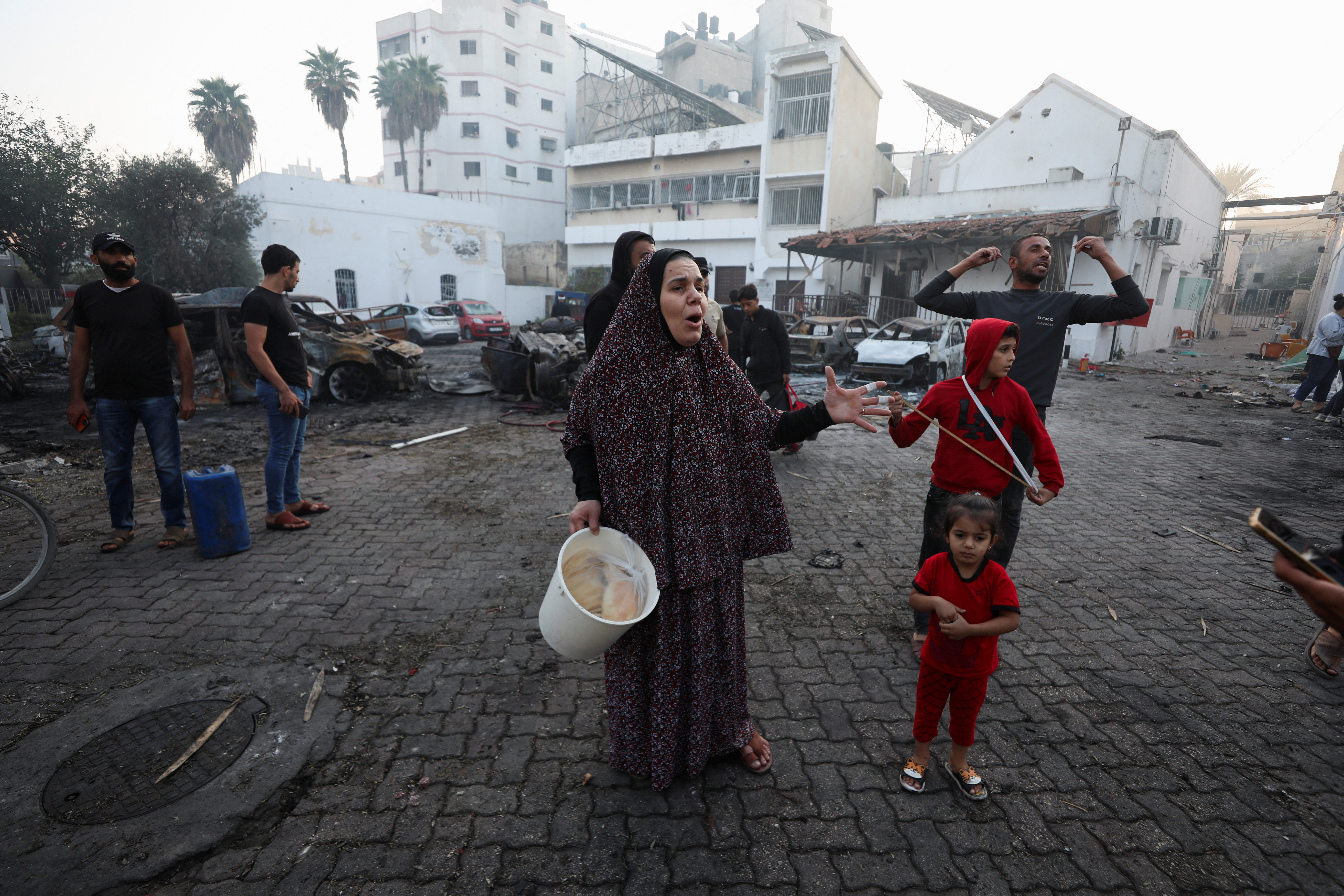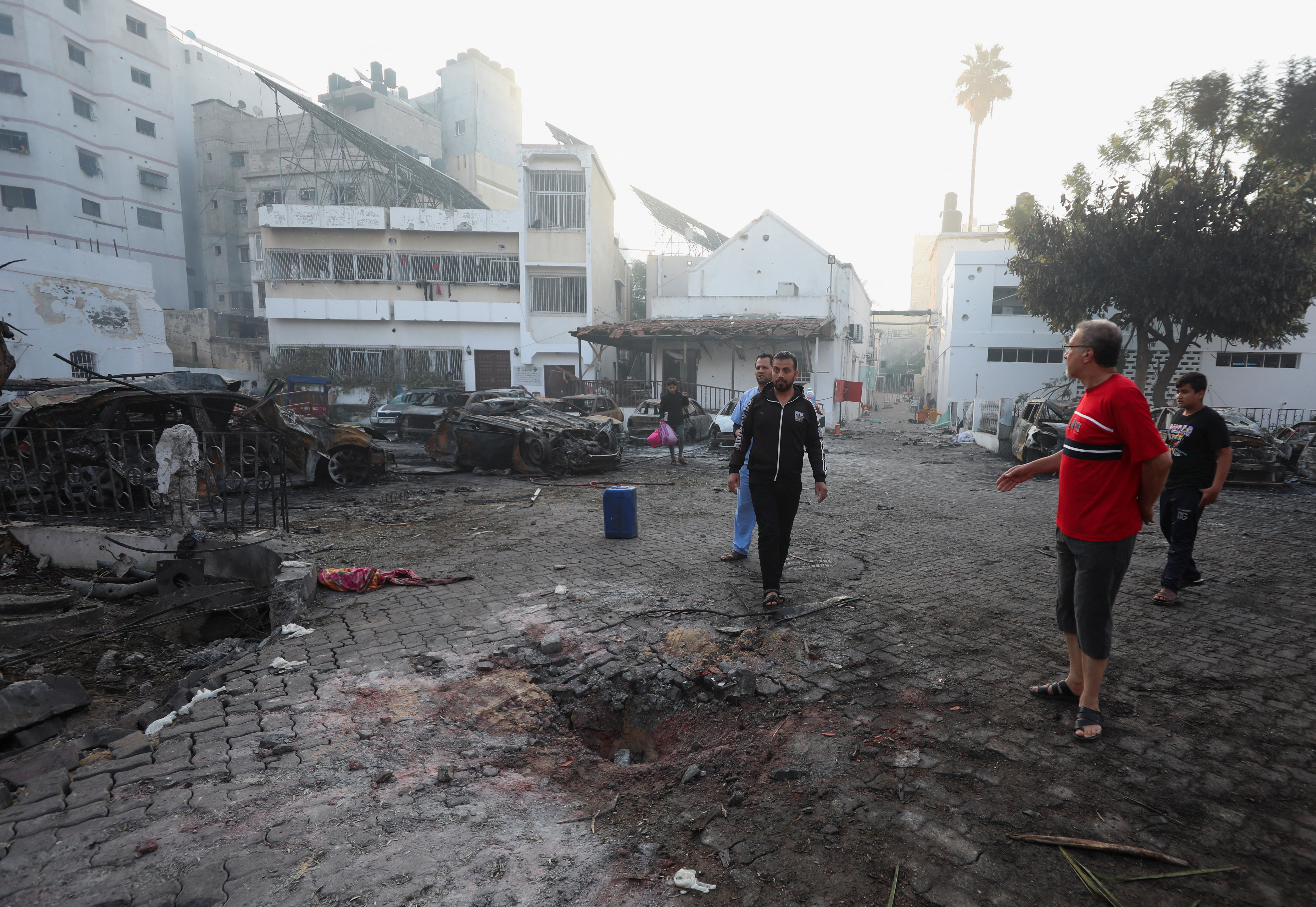 人们在加沙市阿赫利医院的区域内进行检查,数百名巴勒斯坦人在那里遭到炸弹袭击,以色列和巴勒斯坦官员互相指责,逃离家园的巴勒斯坦人正在那里避难,逃离了与以色列的持续冲突,时间为2023年10月18日。… 阅读更多