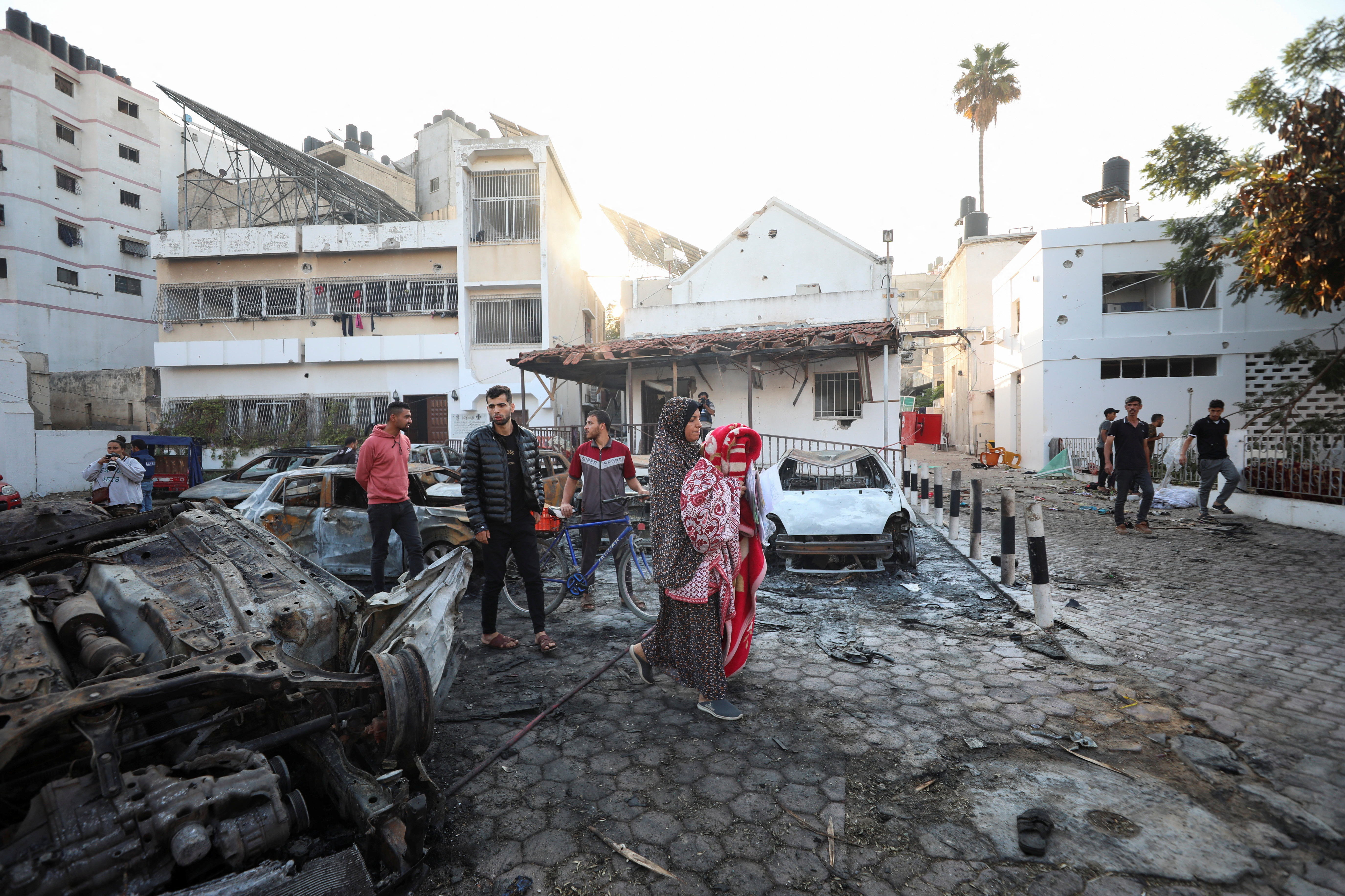 人们在加沙市阿赫利医院的区域进行检查,数百名巴勒斯坦人在那里遭到了一场以色列和巴勒斯坦官员互相指责的爆炸袭击,逃离家园的巴勒斯坦人正在那里避难,这是与以色列持续冲突中的一部分,时间是2023年10月18日。… 阅读更多