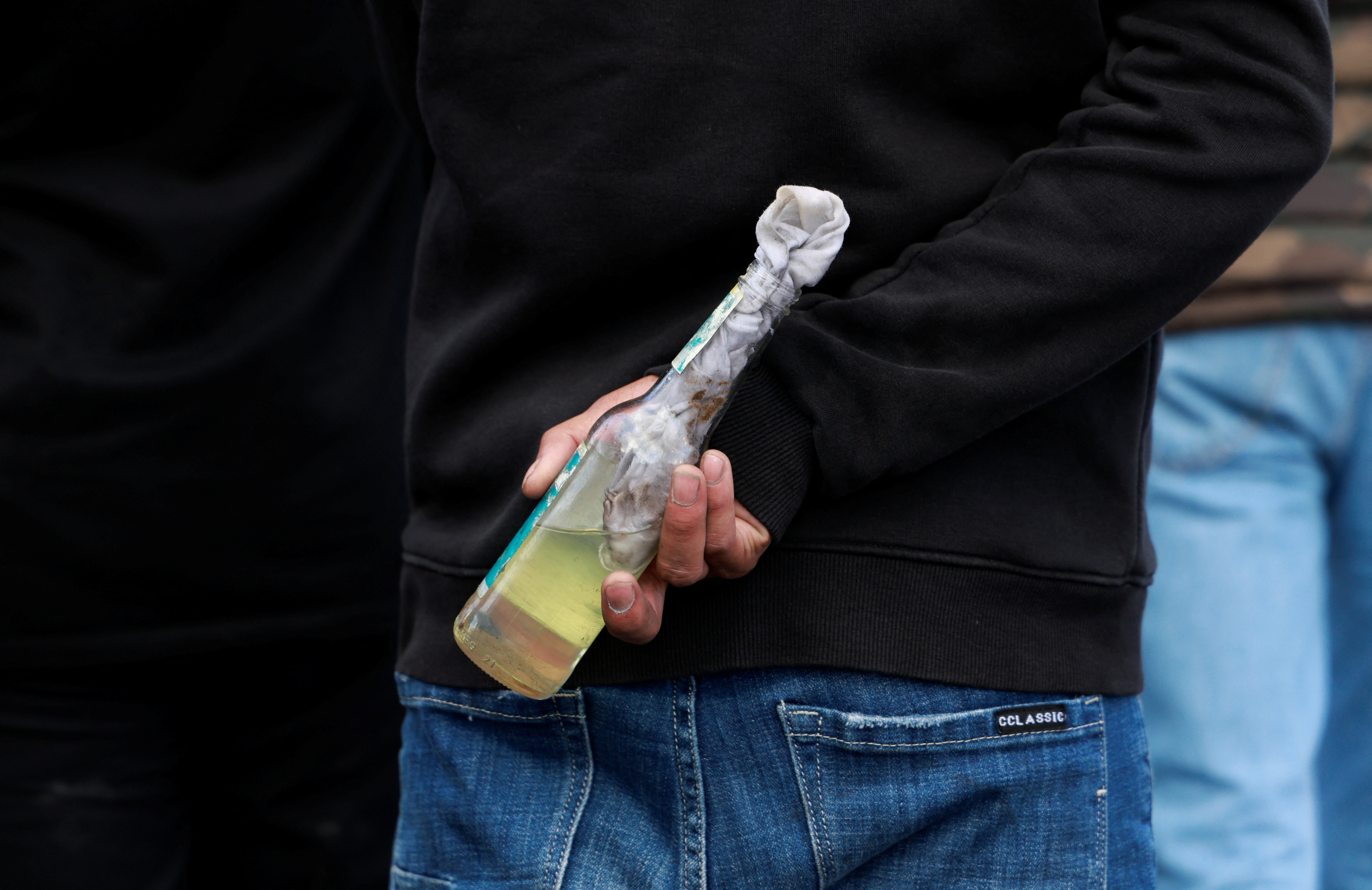 一名巴勒斯坦人在2023年10月18日以色列占领的约旦河西岸的拉马拉附近与以色列军队发生冲突时手持一枚汽油弹。路透社/Ammar Awad摄