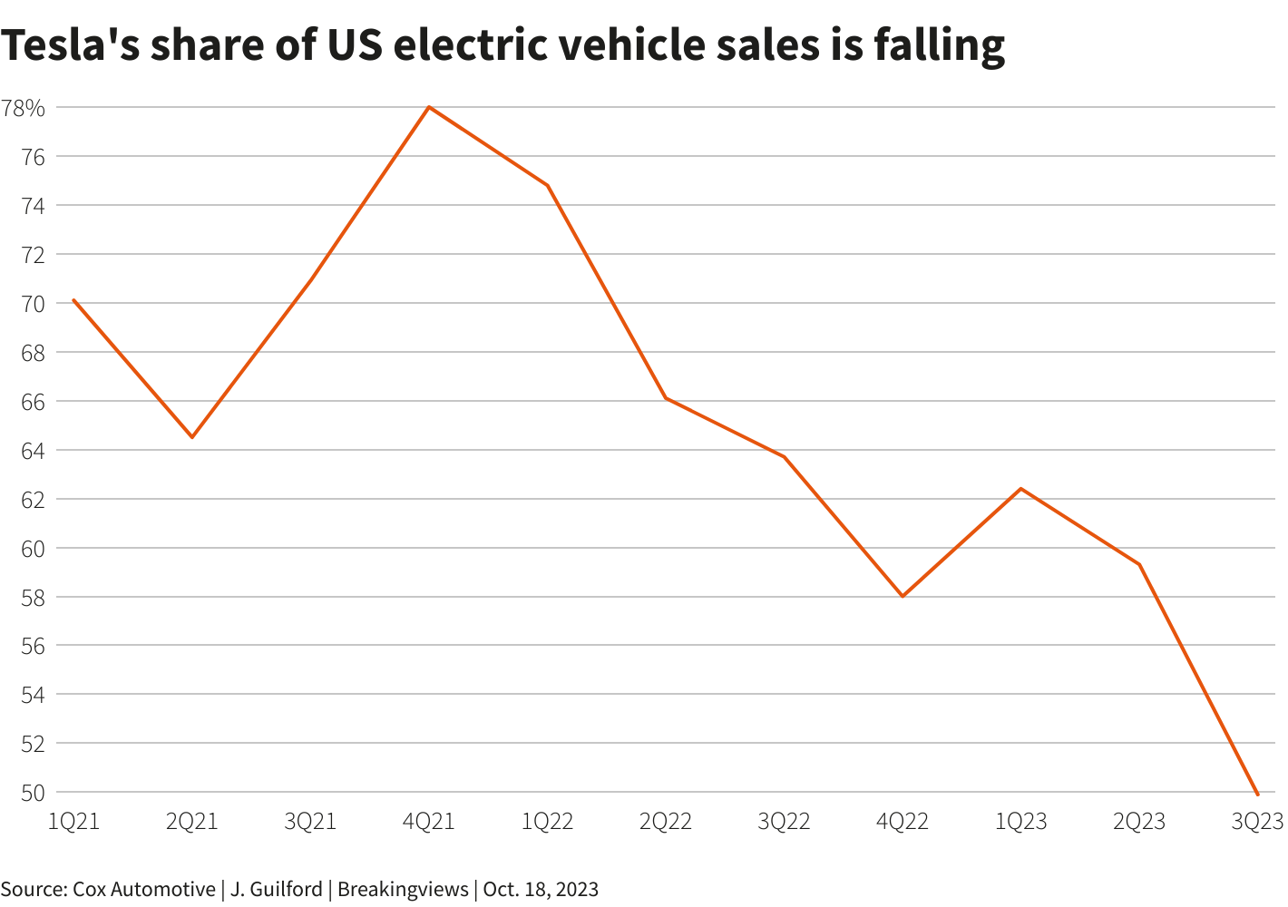 纽约,10月18日(路透Breakingviews) - 特斯拉(TSLA.O) 1万亿美元的问题一直是它是否独一无二,还是只是领先于其他竞争对手。这家公司现在市值7600亿美元,已经滑出13位数估值俱乐部,经历了将近一年的价格下调,失去了美国市场份额,并且在中国的竞争对手比亚迪(002594.SZ),(1211.HK)也大大缩小了其领先优势。这让老板埃隆·马斯克面临着越来越严峻的挑战,需要加速转变。