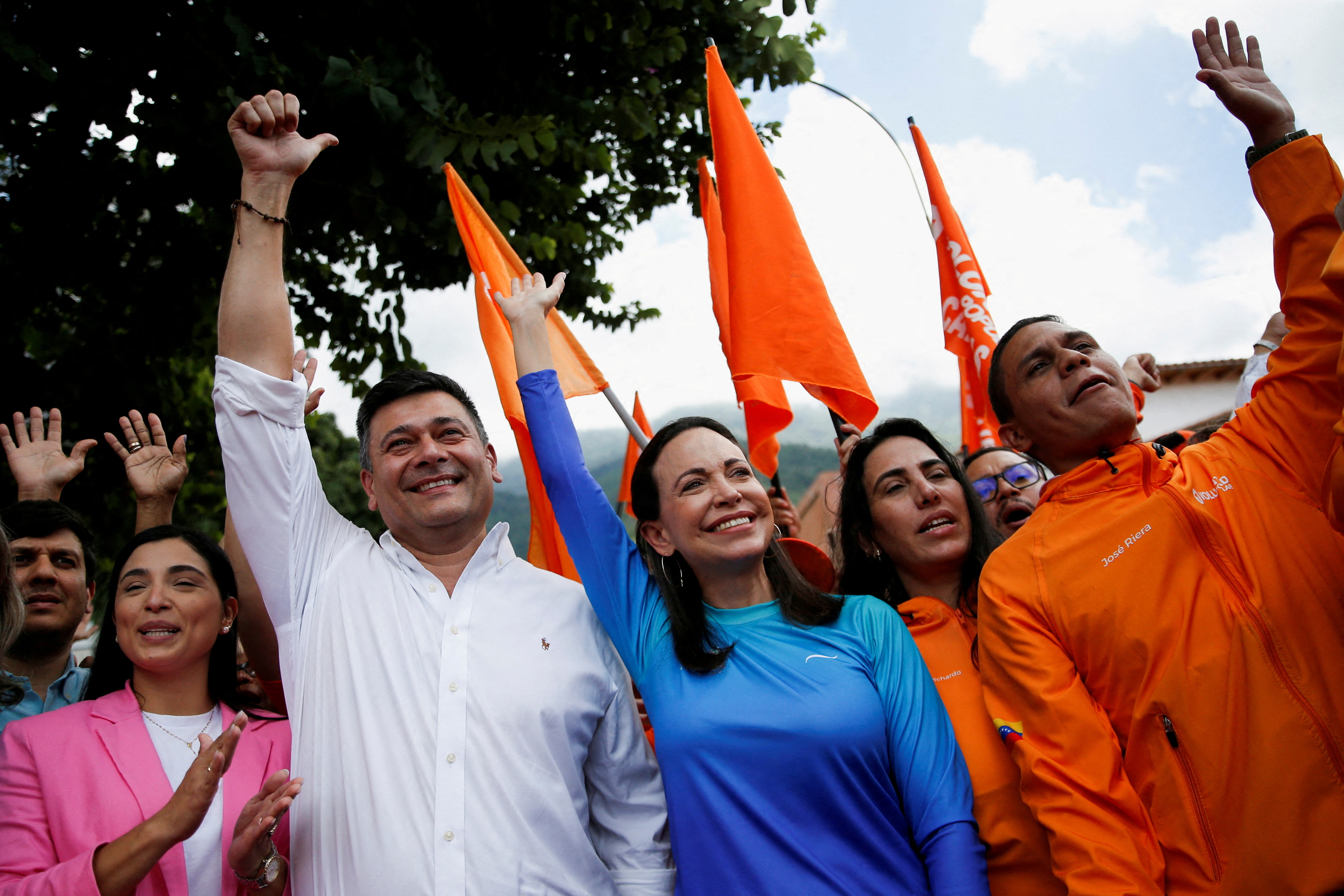 玛利亚·科里娜·马查多是委内瑞拉反对派初选的Vente Venezuela党候选人,弗雷迪·苏珀拉诺是Voluntad Popular党领袖,他们在加拉加斯举行新闻发布会后举起手臂合影,2023年10月13日,委内瑞拉。路透社/莱昂纳多·费尔南德斯… 阅读更多